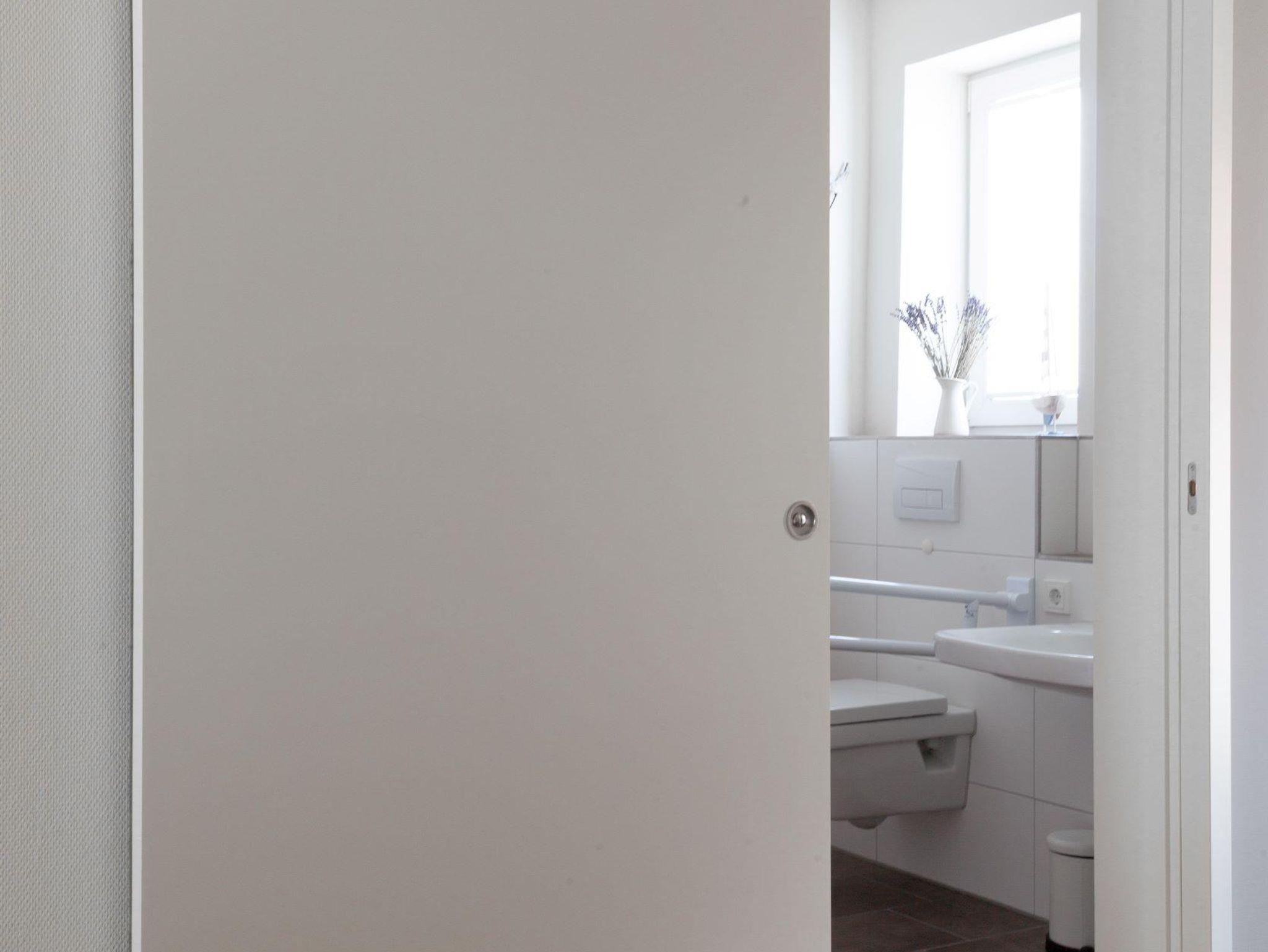 Barrierefreiheit Zusammenfassung: Parkplätze direkt am Haus ( Wallbox 50ct/kwh) , ebenerdiger Hauseingang, breite Türen zu Wohn-/Essbereich und Schlafzimmer, breite Schiebetür Bad/WC, niederschwellige Terrassentüren, unterfahrbarer Esstisch, unterfahrbares Waschbecken, höheres WC, beidseitige Haltegriffe am Duschsitz und WC, Alarmauslösung in Dusche und am WC, Bett mit elektr. Einlegerahmen, Alarmauslösung am Bett, ausreichende Wendebereiche, stufenloser Terrassen- und Gartenbereich. Das DOMIZIL AM SIEL ist zertifiziert nach den Richtlinien Reisen für Alle.