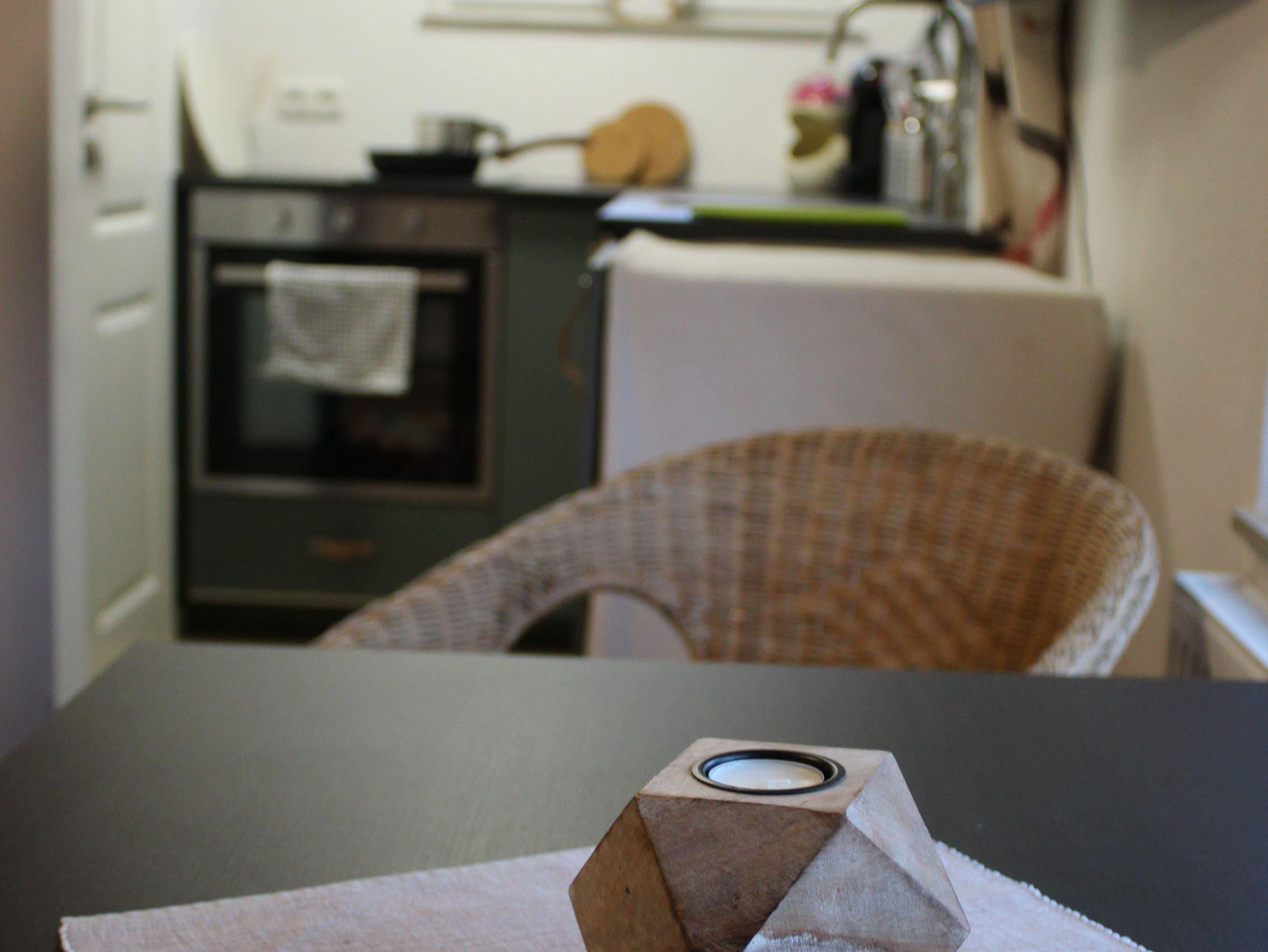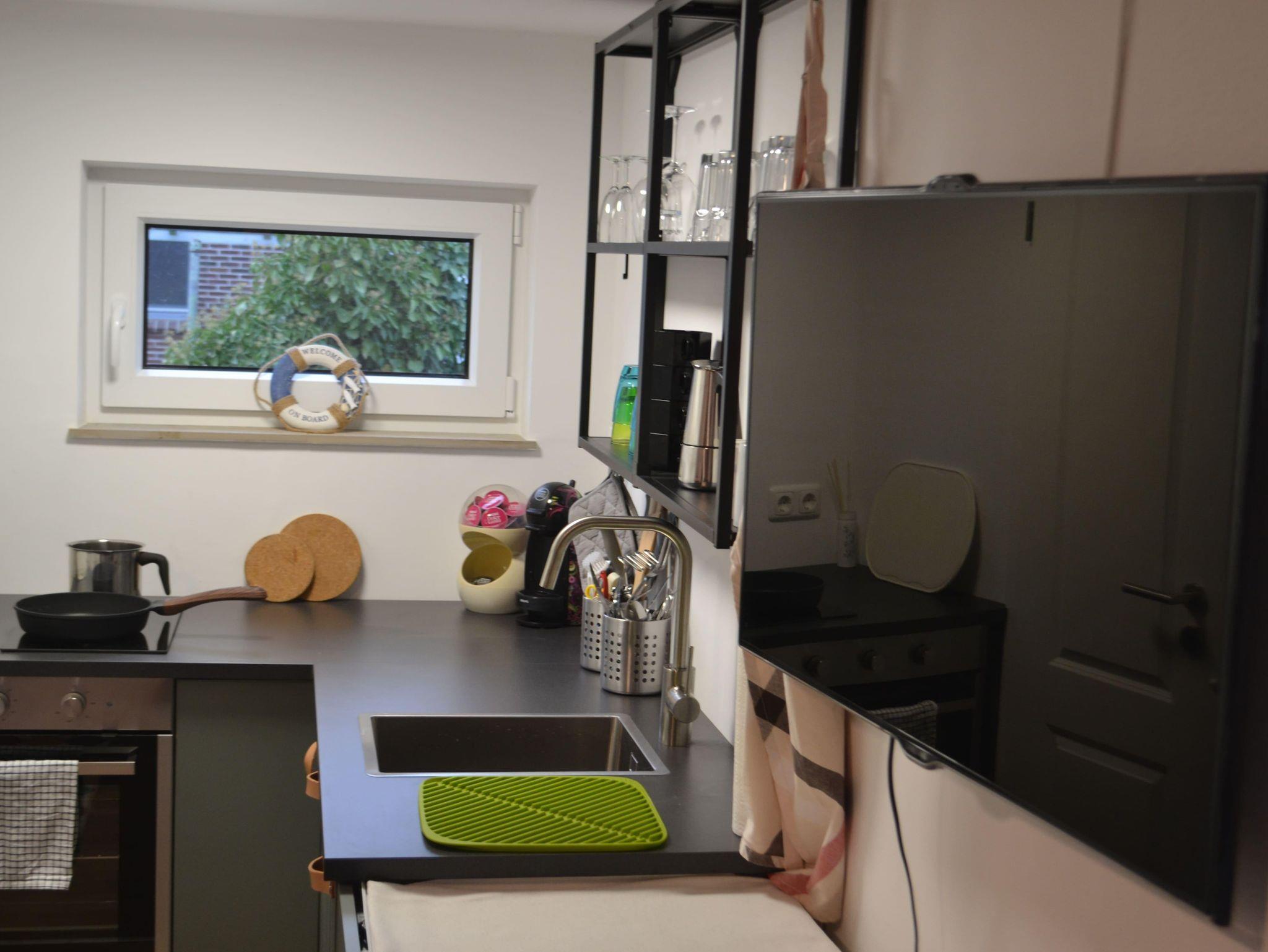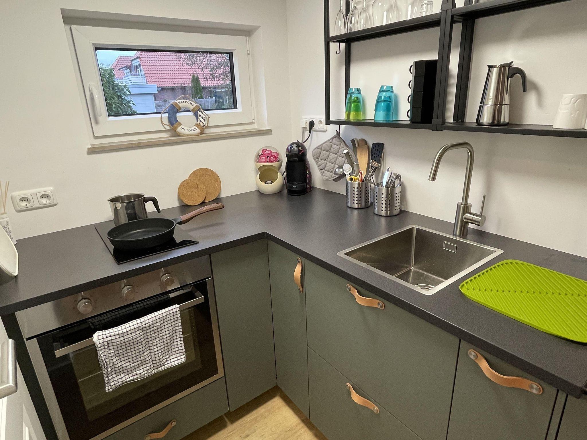 Die Küche ist mit einem Backofen, einem Kühlschrank, einem Induktionskochfeld und einer Kaffeemaschine gut ausgestattet. Eine Grundausstattung mit Besteck, Geschirr, Töpfen, Pfannen und Schüsseln ist ebenfalls in der Küche vorhanden. Außerdem sind die wichtigsten Gewürze immer griffbereit.