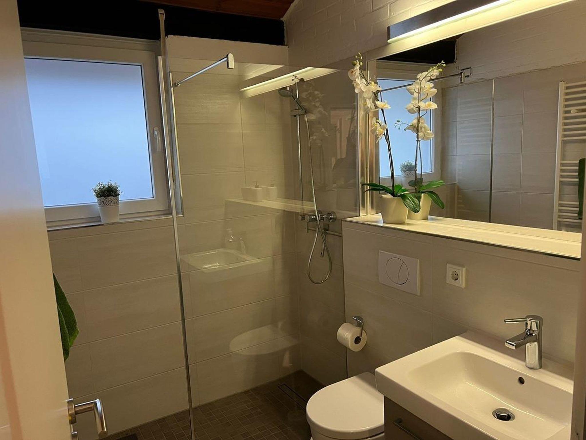 • Modernes Bad mit Dusche, WC und Waschmaschine (Kleinraum, 3?kg)