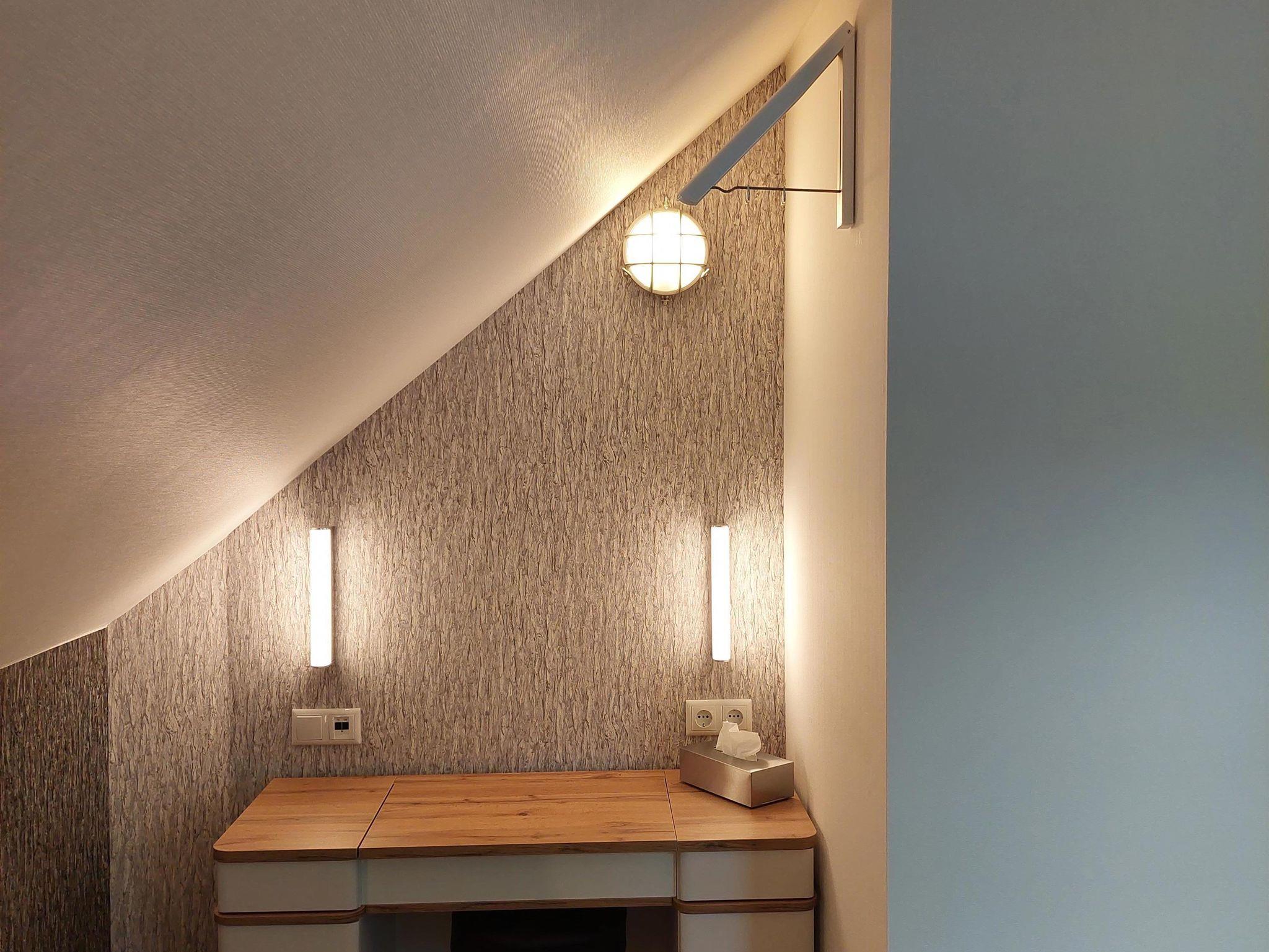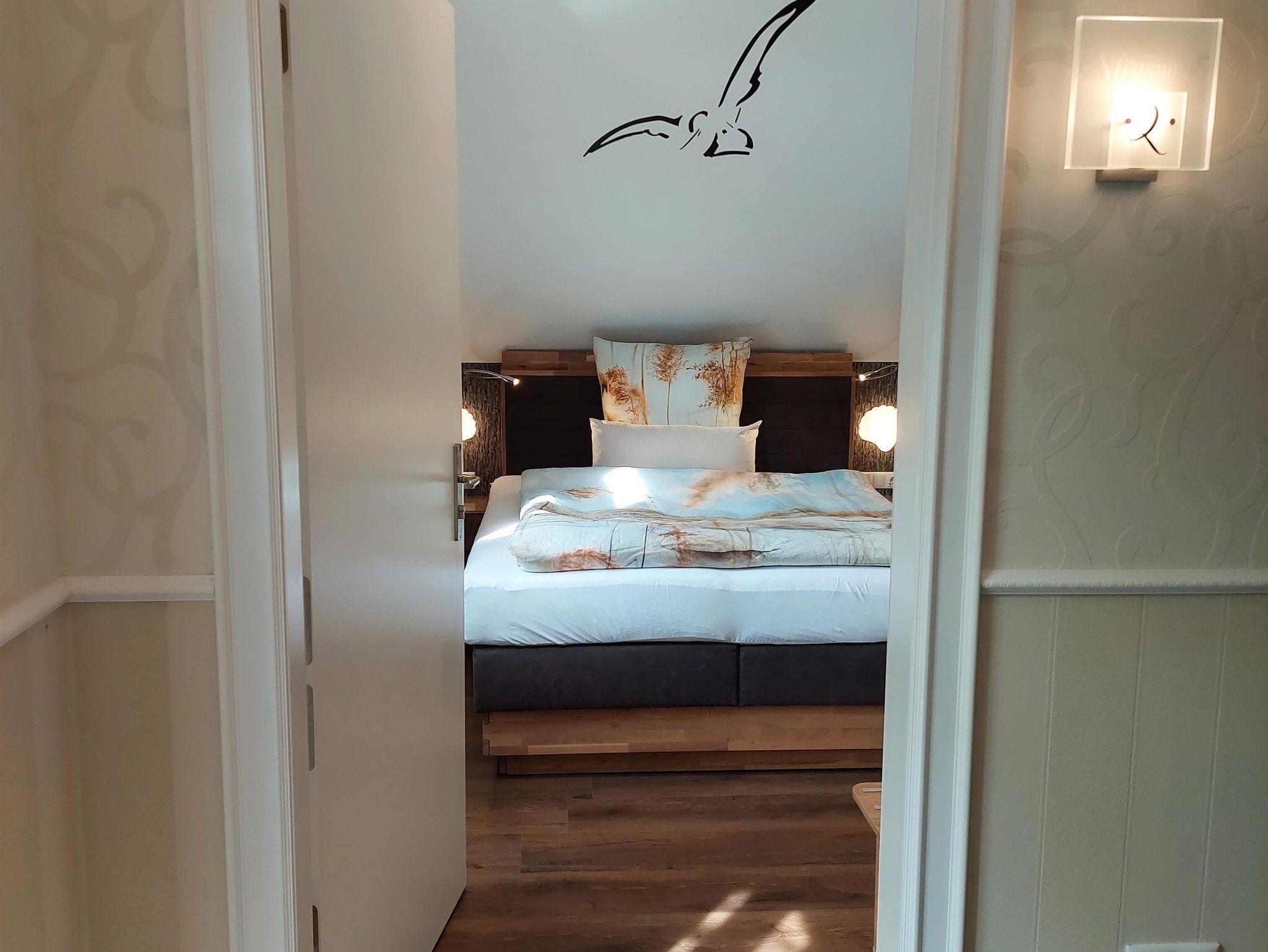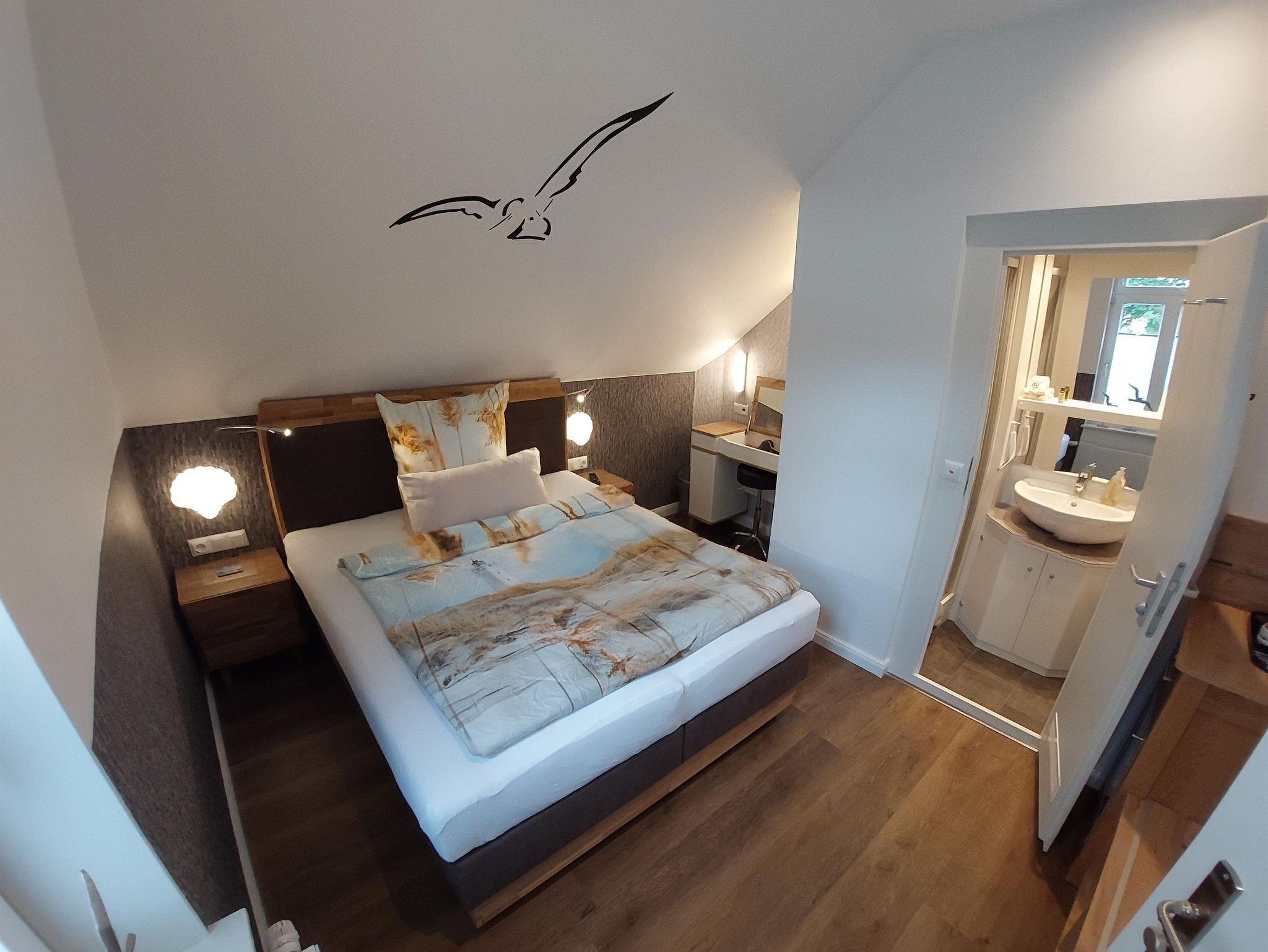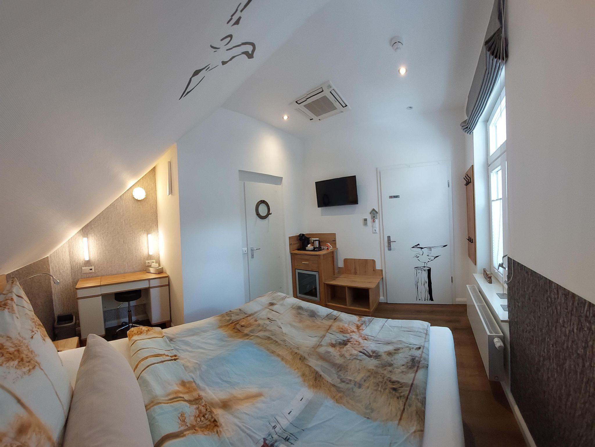 Das Zimmer verfügt über eine Klimaanlage/Heizung, Smart-TV, Kaffeemaschine, Wasserkocher, Föhn, WLAN und einen kleinen Kühlschrank. Ob zu zweit oder alleine, hier können sie alle Sorgen vergessen. Das Möwennest ist mit seinem 1,60m breiten Bett unser kleinstes Zimmer. Zu diesem Zimmer gehört eine eigene kleine Badezimmerkabine, wie sie sonst nur auf Kreuzfahrtschiffen zu finden sind.