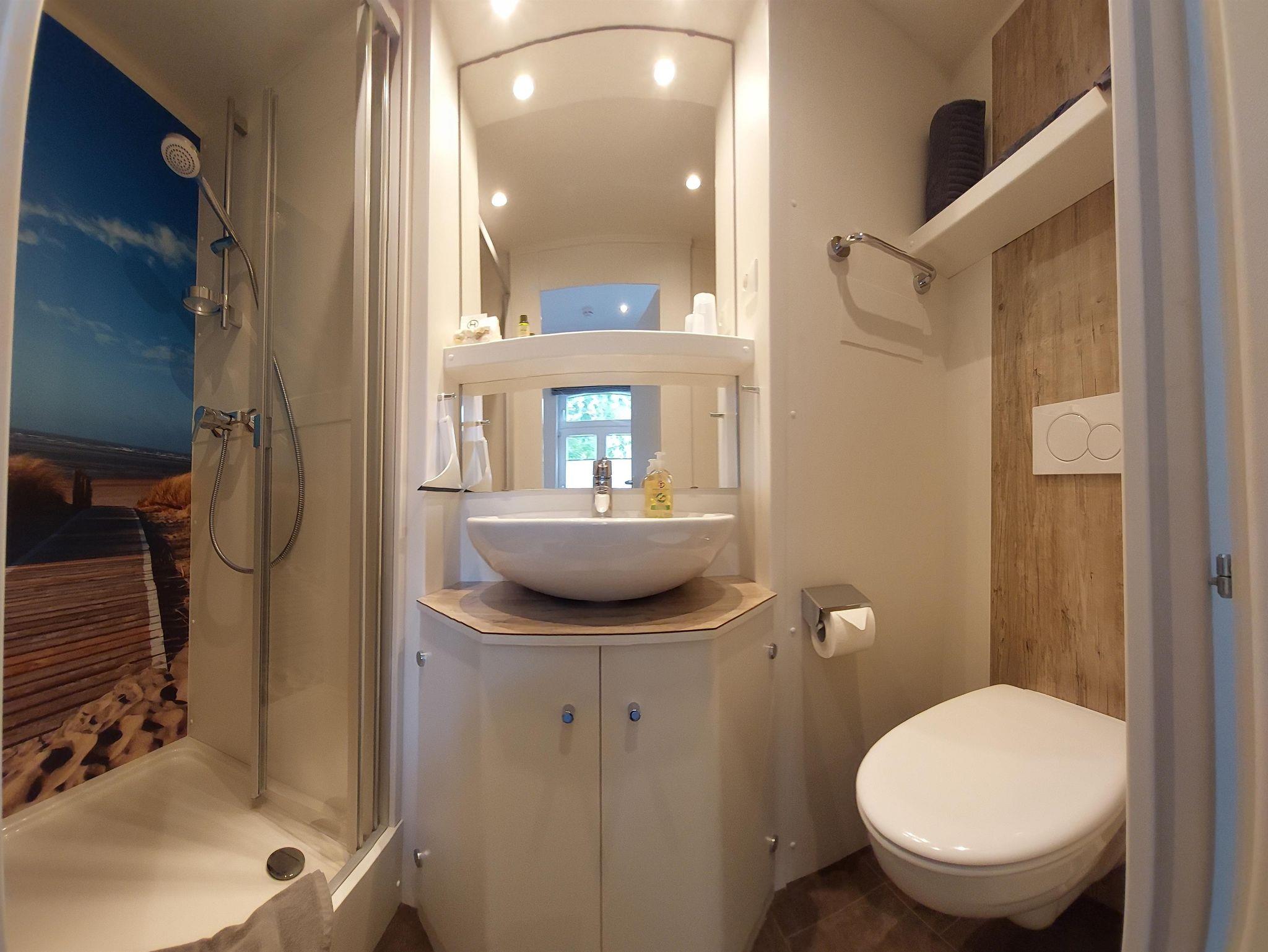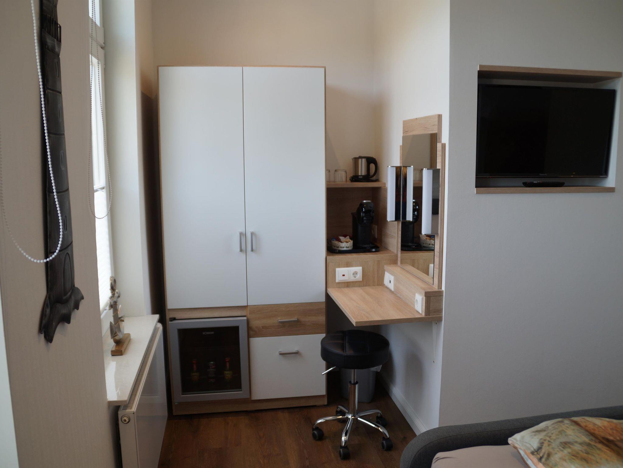 Das Zimmer verfügt über eine Klimaanlage/Heizung, Smart-TV, Kaffeemaschine, Wasserkocher, Föhn, WLAN und einen kleinen Kühlschrank. Zu dem Zimmer gehört eine eigene kleine Badezimmerkabine, wie sie sonst nur auf Kreuzfahrtschiffen zu finden sind.