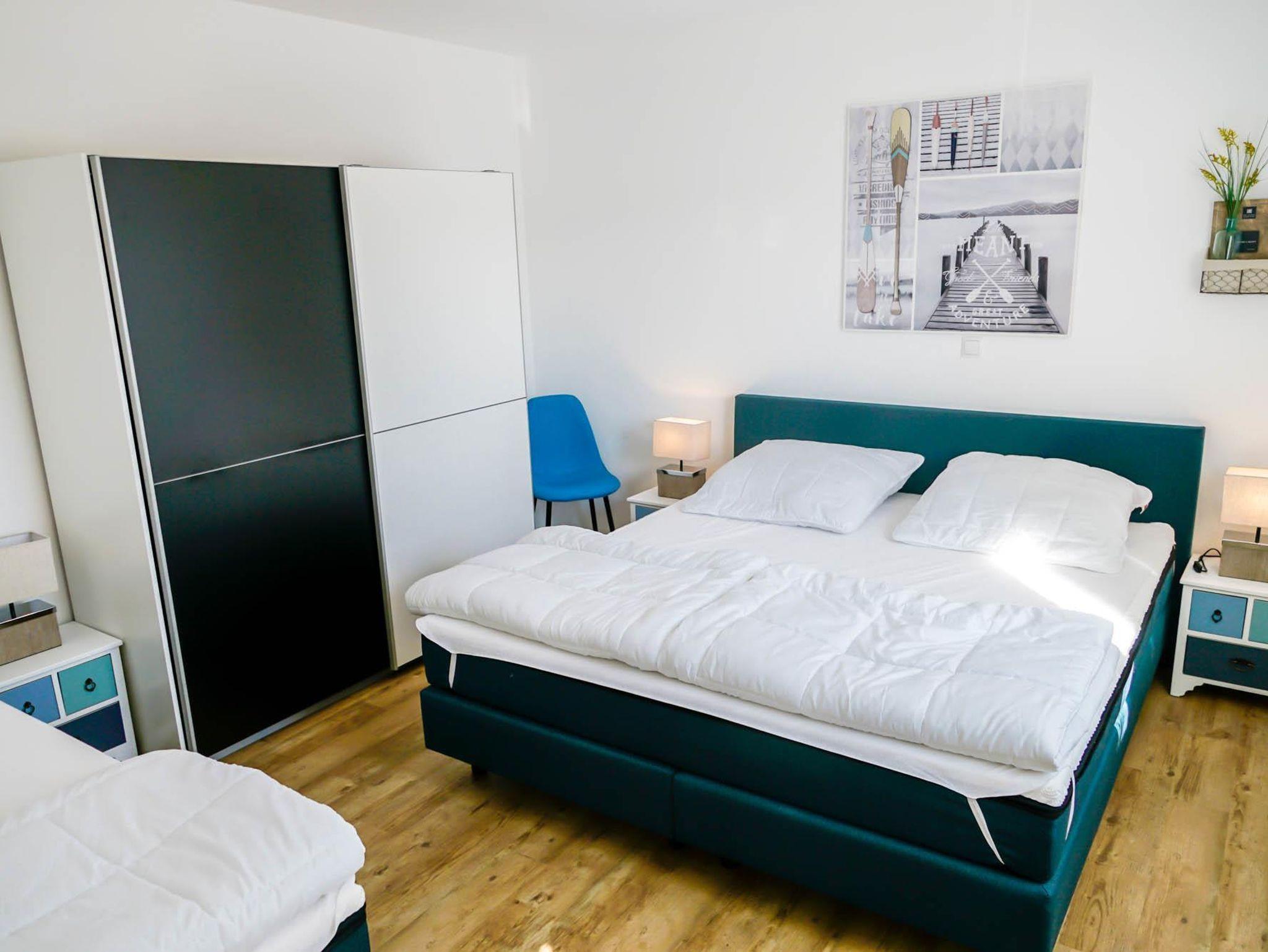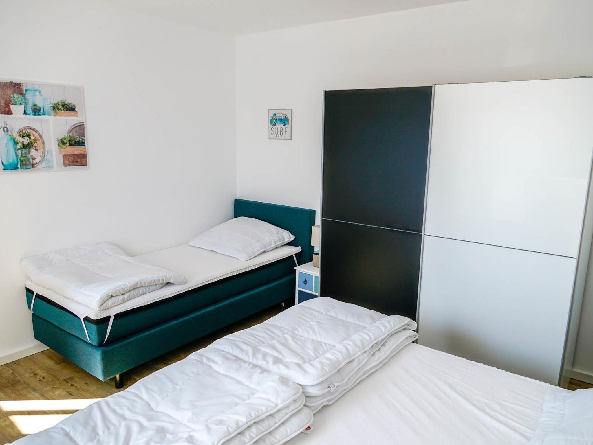 • 1 Schlafzimmer: ein Doppelbett, ein Einzelbett, Bettwäsche auf Wunsch (Fenster mit Plissees)