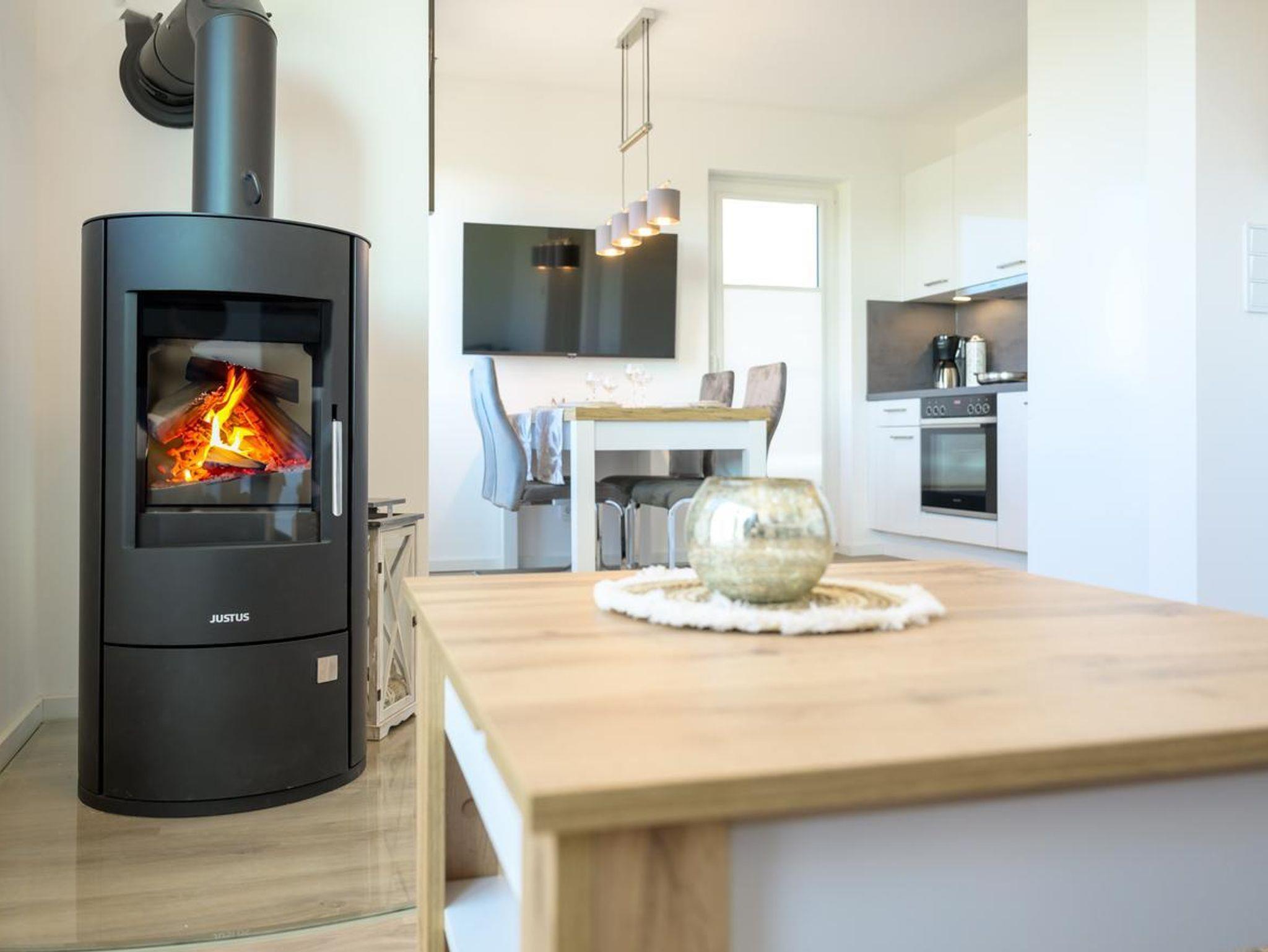 • Großzügiger Wohn-Essbereich mit gemütlicher Sitzecke, modernem TV und Kamin – ideal zum Entspannen nach einem Wattenmeer-Tag