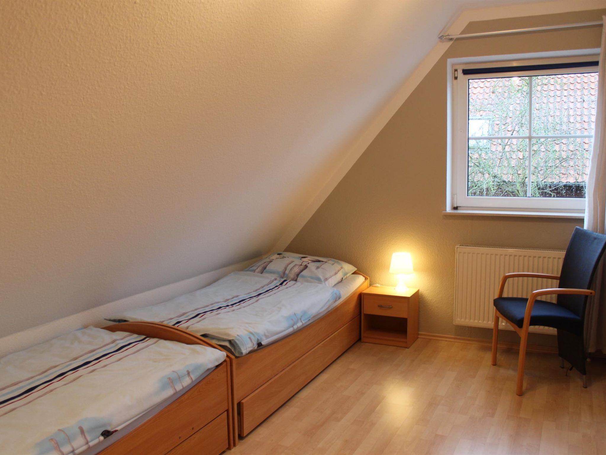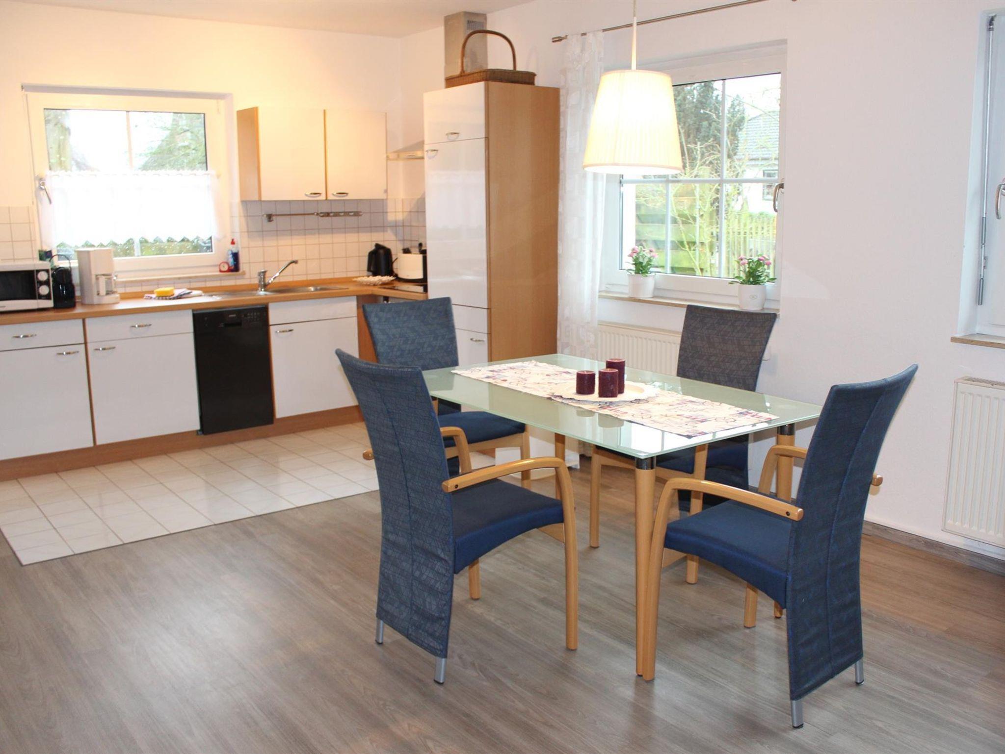 Im Ergeschoss finden Sie im Eingangsbereich eine Garderobe und einen Schuhschrank. Der Wohnbereich mit einer gemütlichen Sitzecke, TV und einem Schreibtisch,der offen ist zur Küchenzeile mit einer voll ausgestatteten Einbauküche die mit Geschirrspülmaschine,Backofen, Mikrowelle, Kühlschrank, Kaffeemaschine, Wasserkocher und Toaster und einer Essecke. Ein Bad mit Dusche und WC. Im Obergeschoss, das mit einem Treppenlift zu erreichen ist, finden Sie die beiden Schlafräume, eins mit Doppelbett und eins mit zwei Einzelbetten, mit je einem Zusatzbett zum ausziehen. Die Terrasse hat eine gemütliche Sitzecke mit sehr schönen Bepflanzungen und einem Grill.