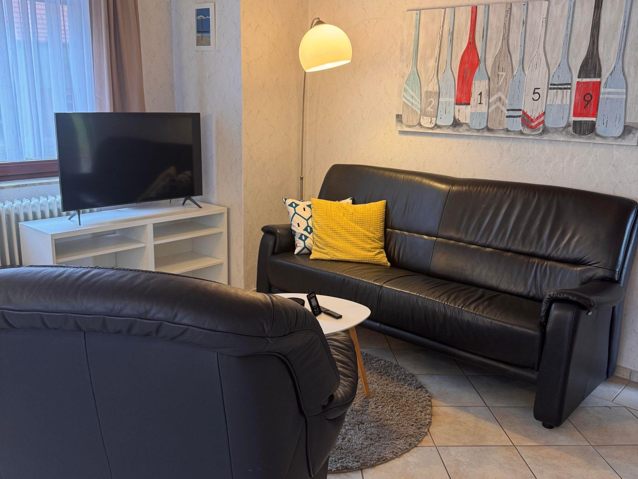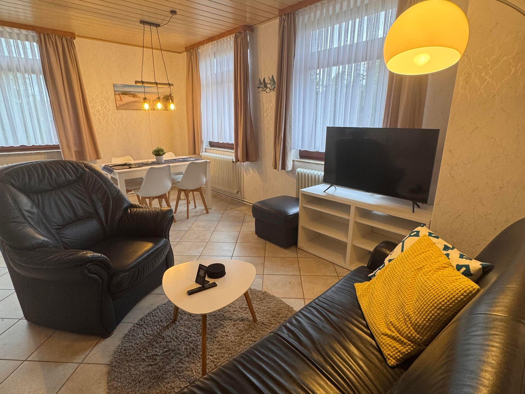 Der große Wohn-, Essbereich ist mit einer hellen Essecke für 4 Personen und einem gemütlichen Sofa und Sessel ausgestattet.