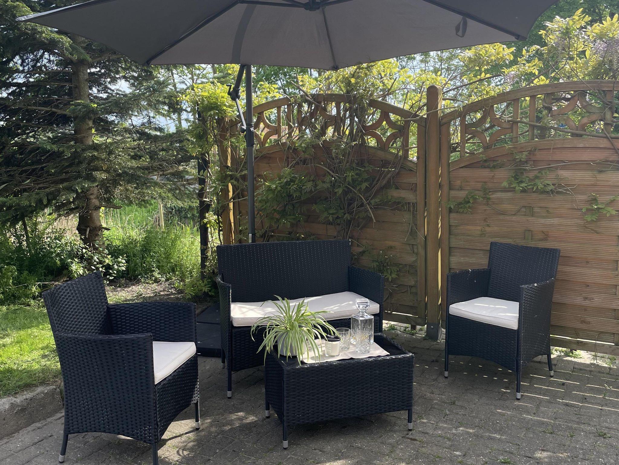 Eine Gemeinschaftsterasse mit Strandkorb lädt zum kennenlernen und verweilen ein. Unsere Wohnung Kajüte hat außerdem eine eigene Terasse mit Sitzecke, Strandkorb und Sonnenschirm.