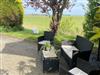 Eine eigene Terrasse mit Strandkorb, Sitzecke und Sonnenschirm bietet einen perfekten Blick über die umliegenden Felder.
