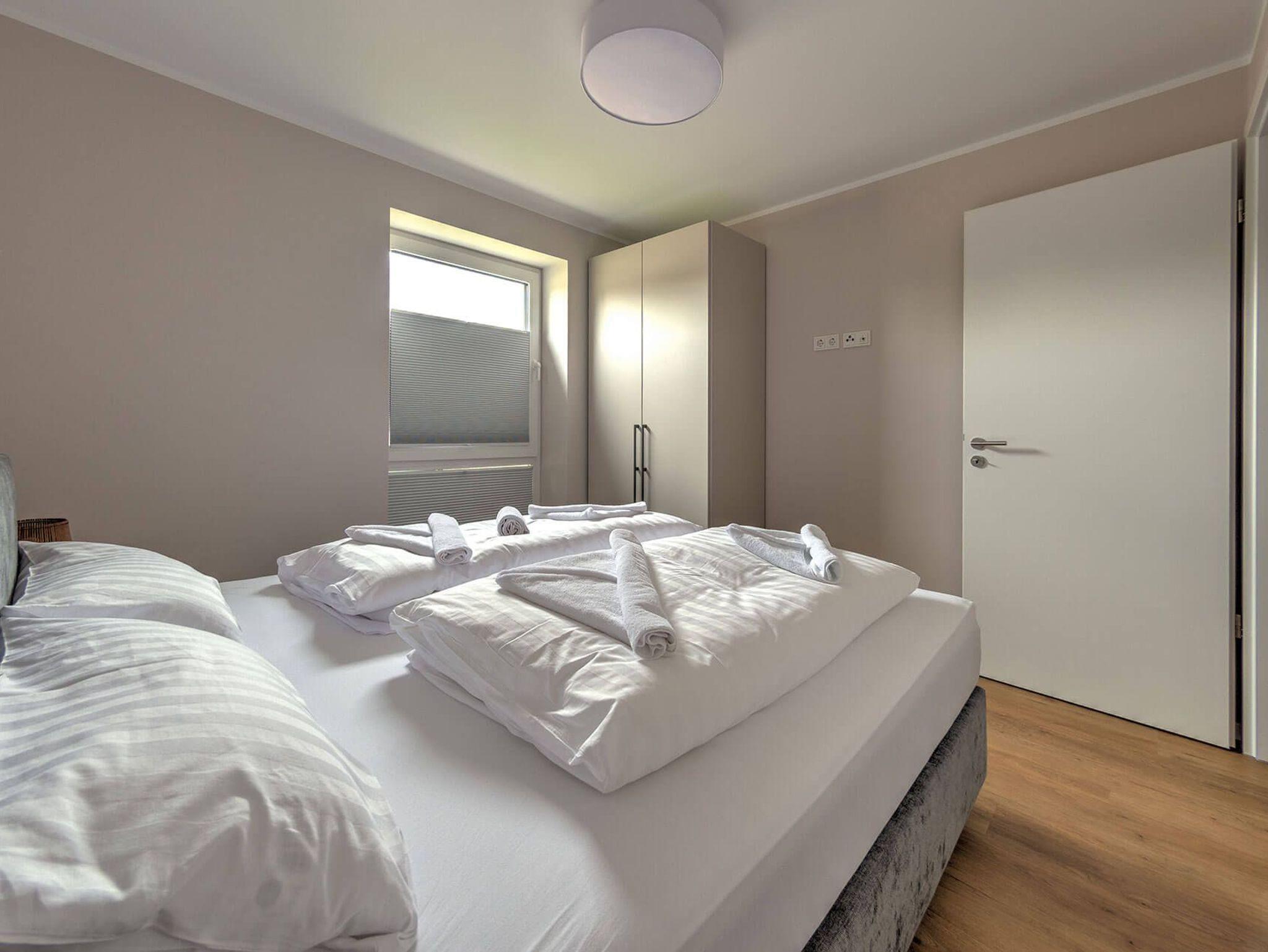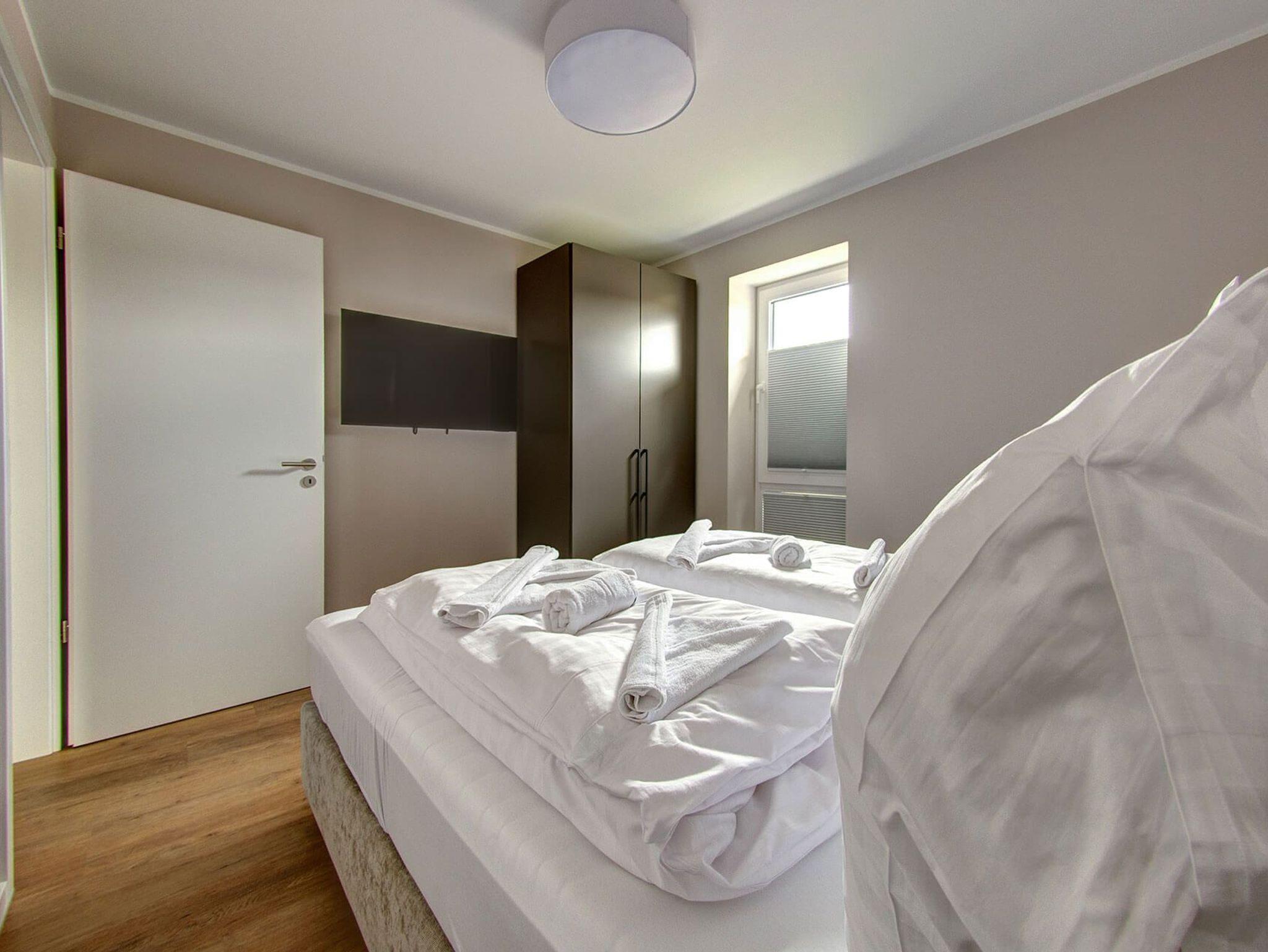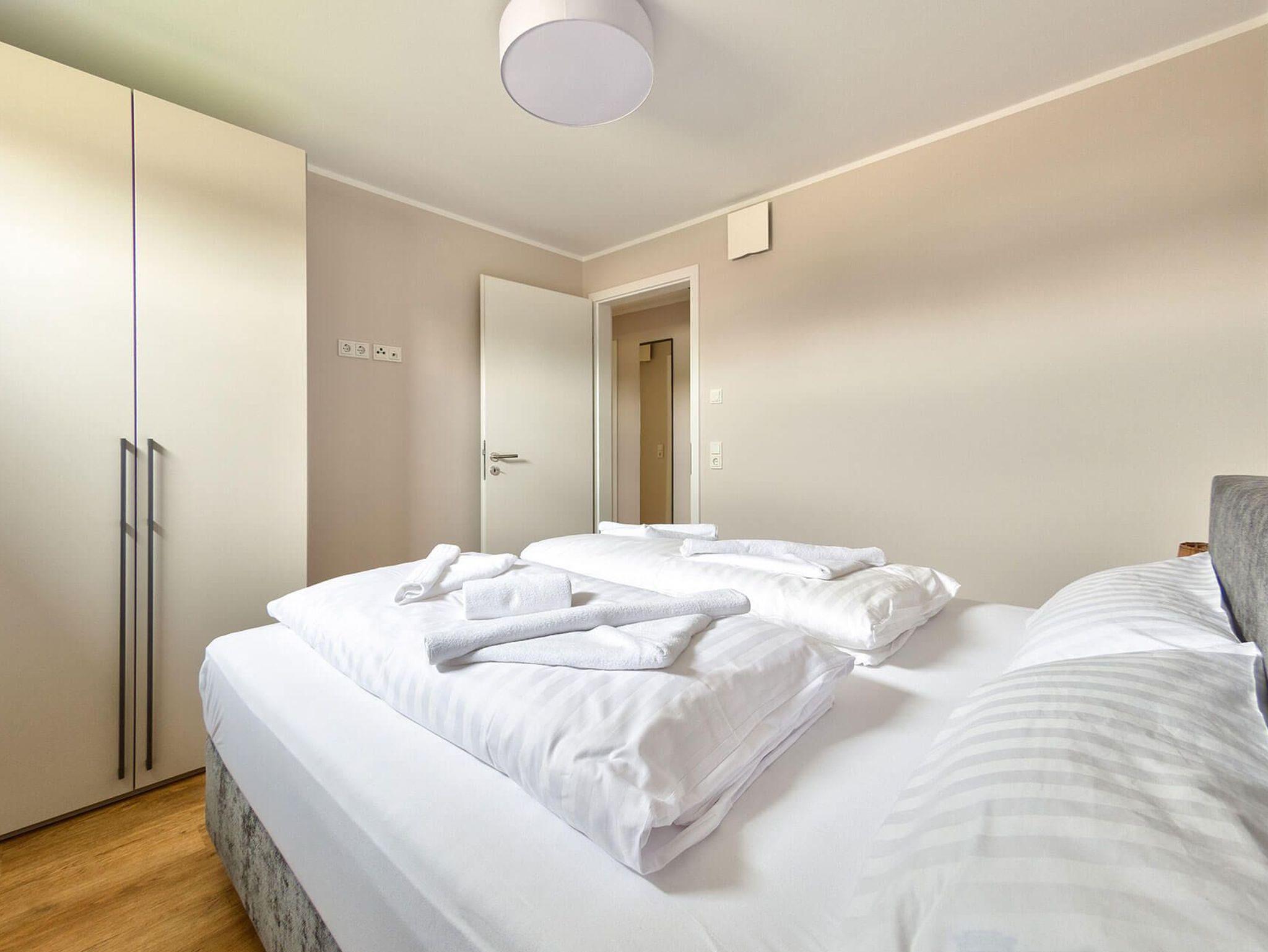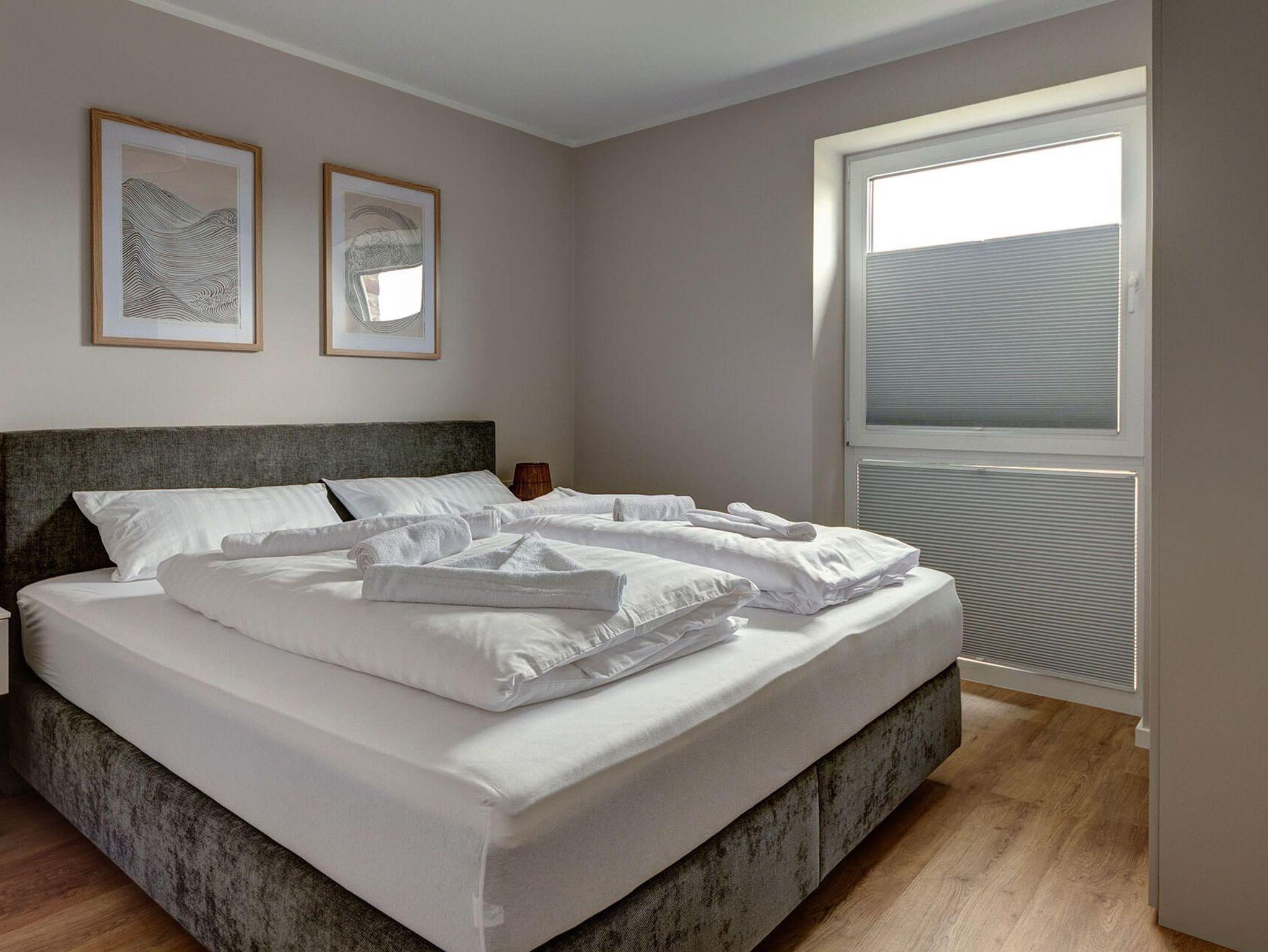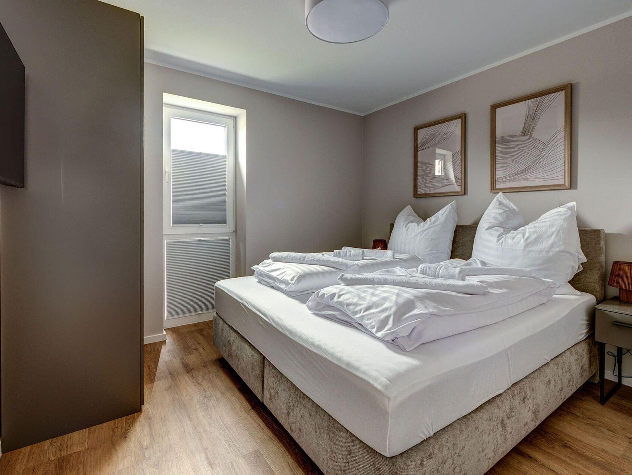 • Schlafzimmer: Komfortables Doppelbett mit hochwertiger Boxspring-Matratze und gemütlicher Bettwäsche. Dezente Farben und geschmackvolle Bilder sorgen für erholsamen Schlaf.