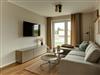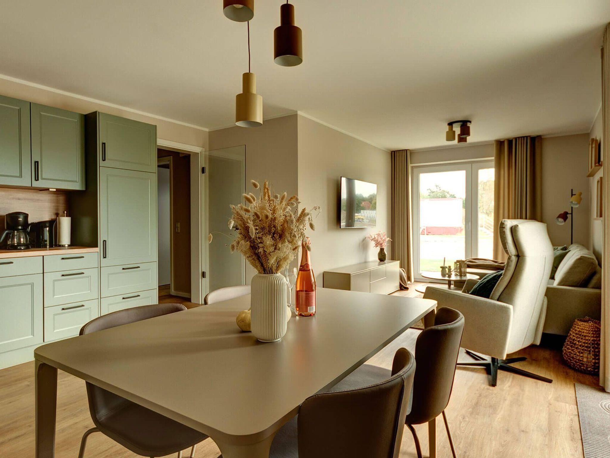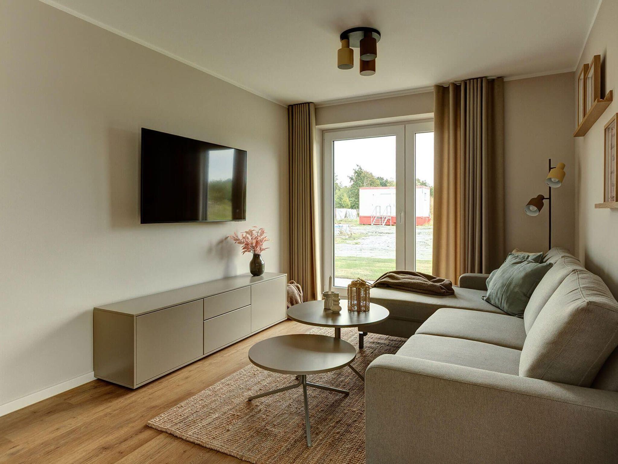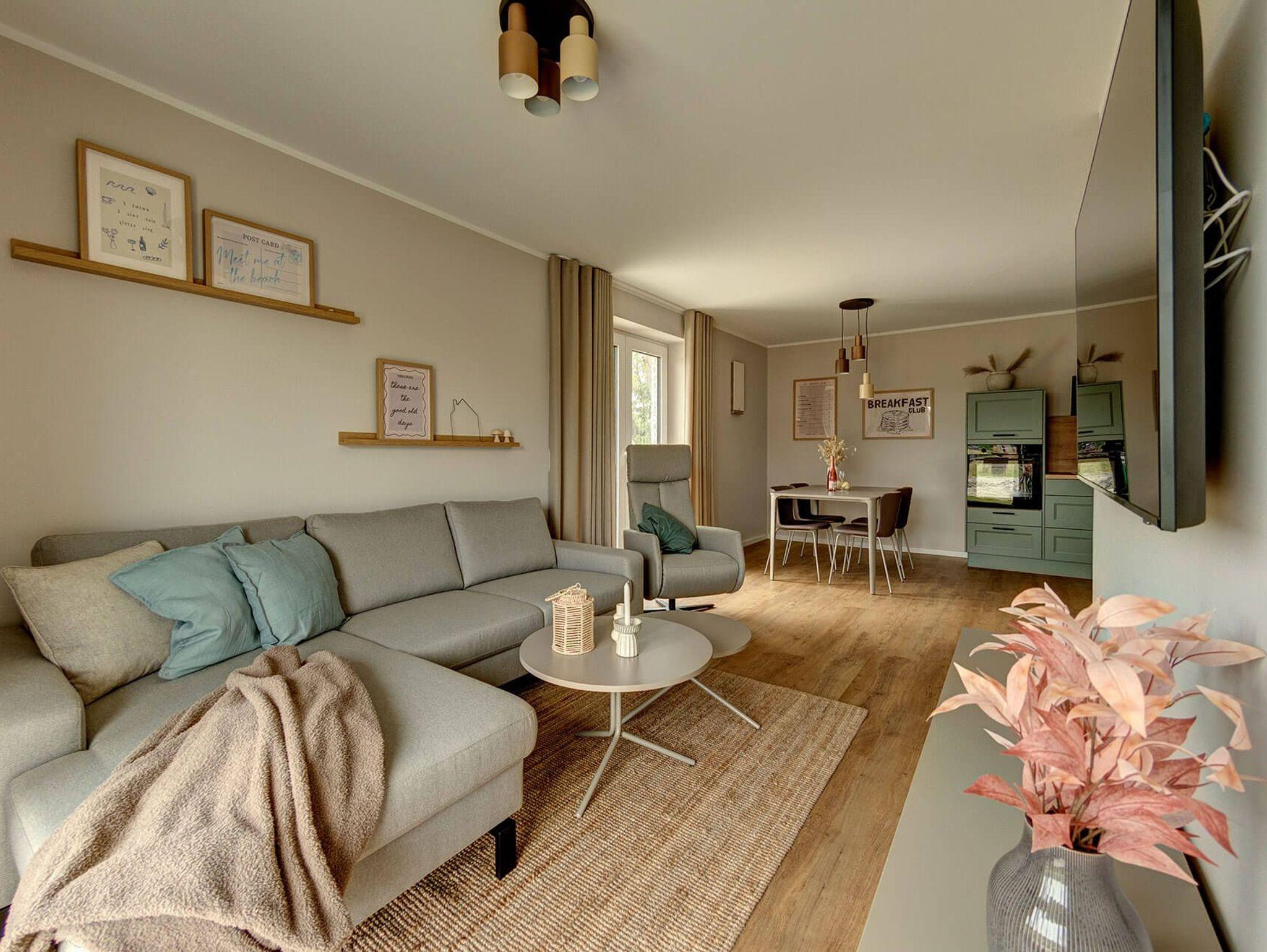 • Wohnbereich: Helles Wohnzimmer mit bequemer Couch, stilvollen Sesseln und Smart-TV. Große Fenster sorgen für viel Tageslicht, während warme Holztöne und geschmackvolle Deko eine wohnliche Atmosphäre schaffen.