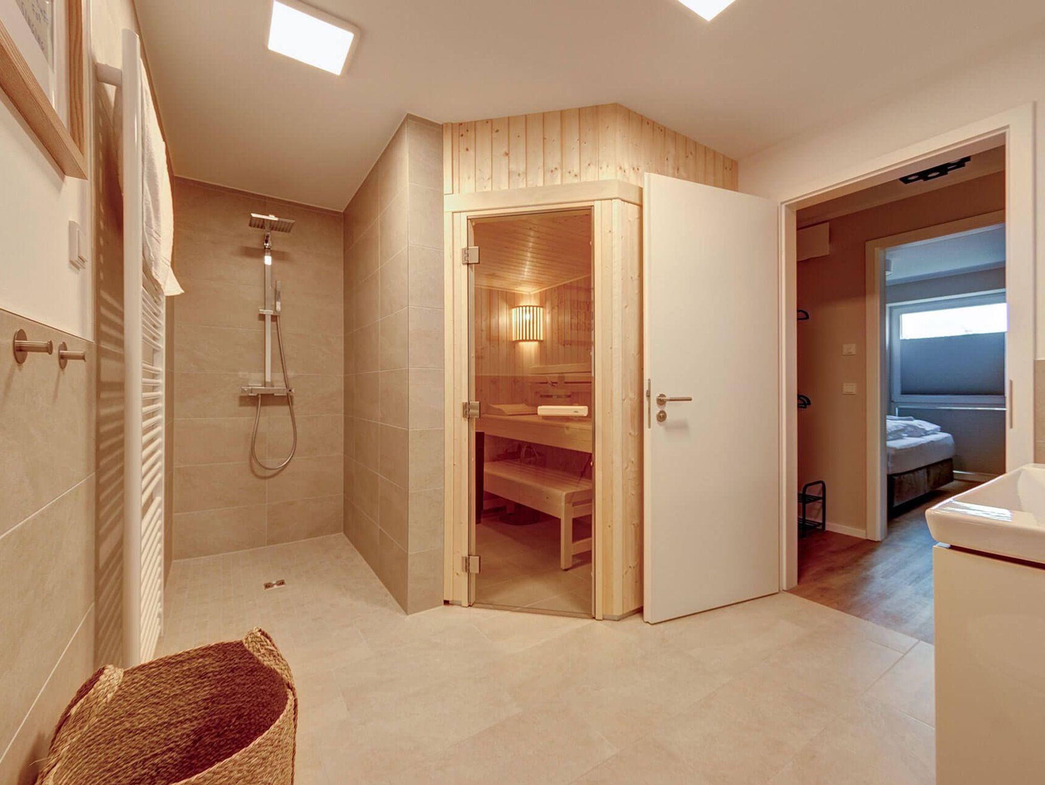 • Badezimmer: Zwei moderne Badezimmer mit bodengleicher Dusche, Handtuchwärmer, großem Waschtisch und beleuchtetem Spiegel. Zeitlose Fliesen und liebevolle Details runden das Wohlfühlambiente ab.