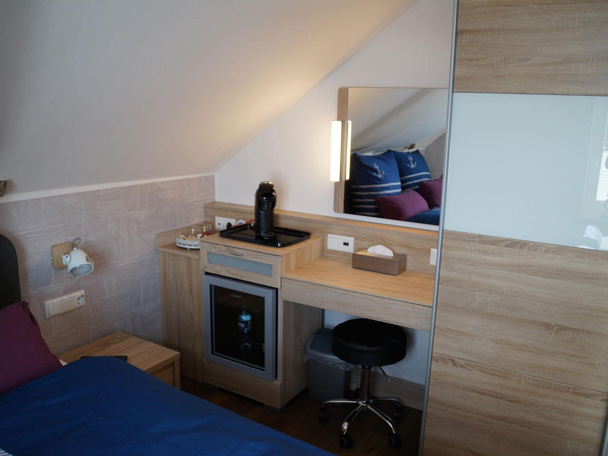 Das Zimmer verfügt über eine Klimaanlage/Heizung, Smart-TV, Kaffeemaschine, Wasserkocher, Föhn, WLAN und einen kleinen Kühlschrank. Zu dem Zimmer gehört eine eigene kleine Badezimmerkabine, wie sie sonst nur auf Kreuzfahrtschiffen zu finden sind.