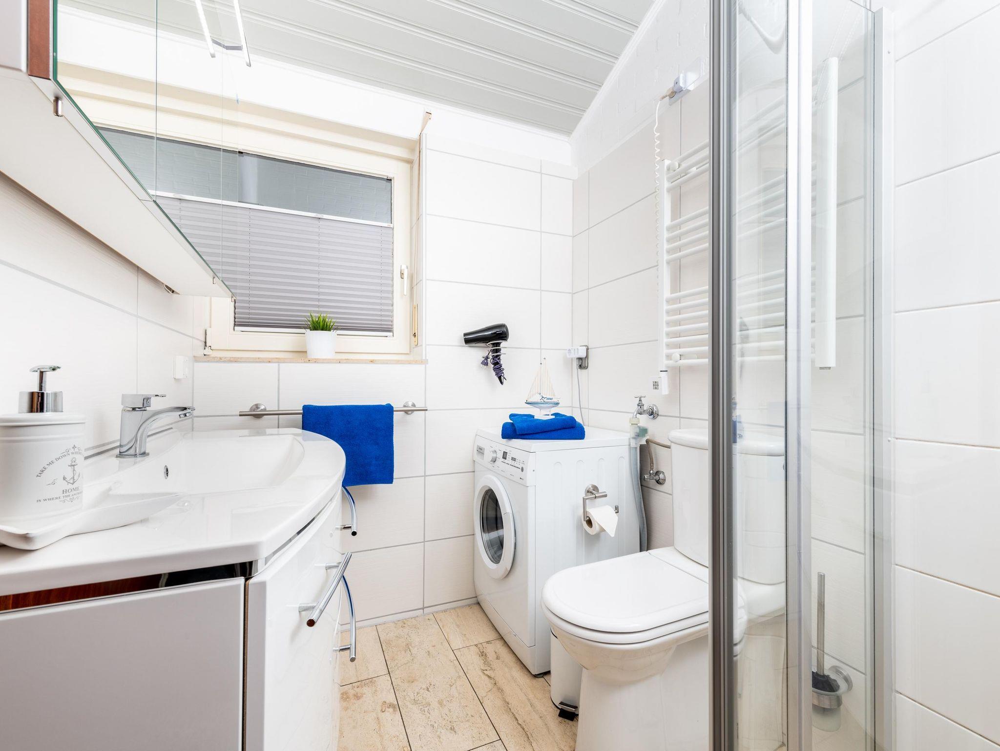 Weiterhin stehen Ihnen 1 Bad mit bodengleicher Dusche und Waschmaschine (inkl. Trockner im HWR) sowie 2 Schlafzimmer mit je einem Doppelbett (180 x 200) und je einem TV sowie ein Kinderzimmer mit einem Doppelstockbett (90 x 200) zur Verfügung.