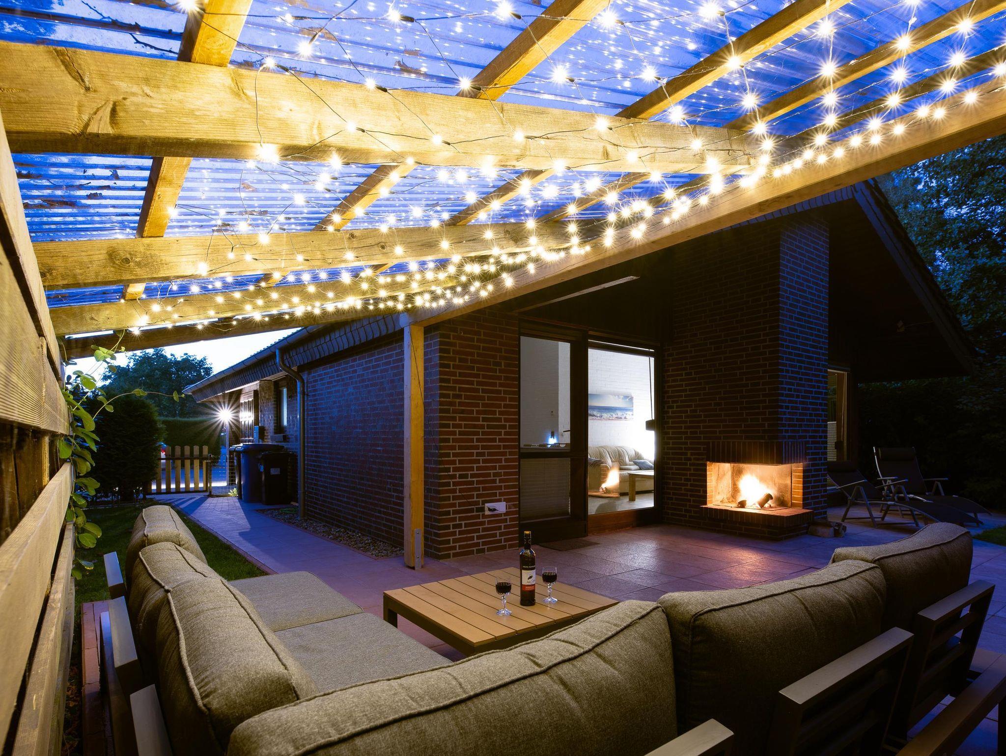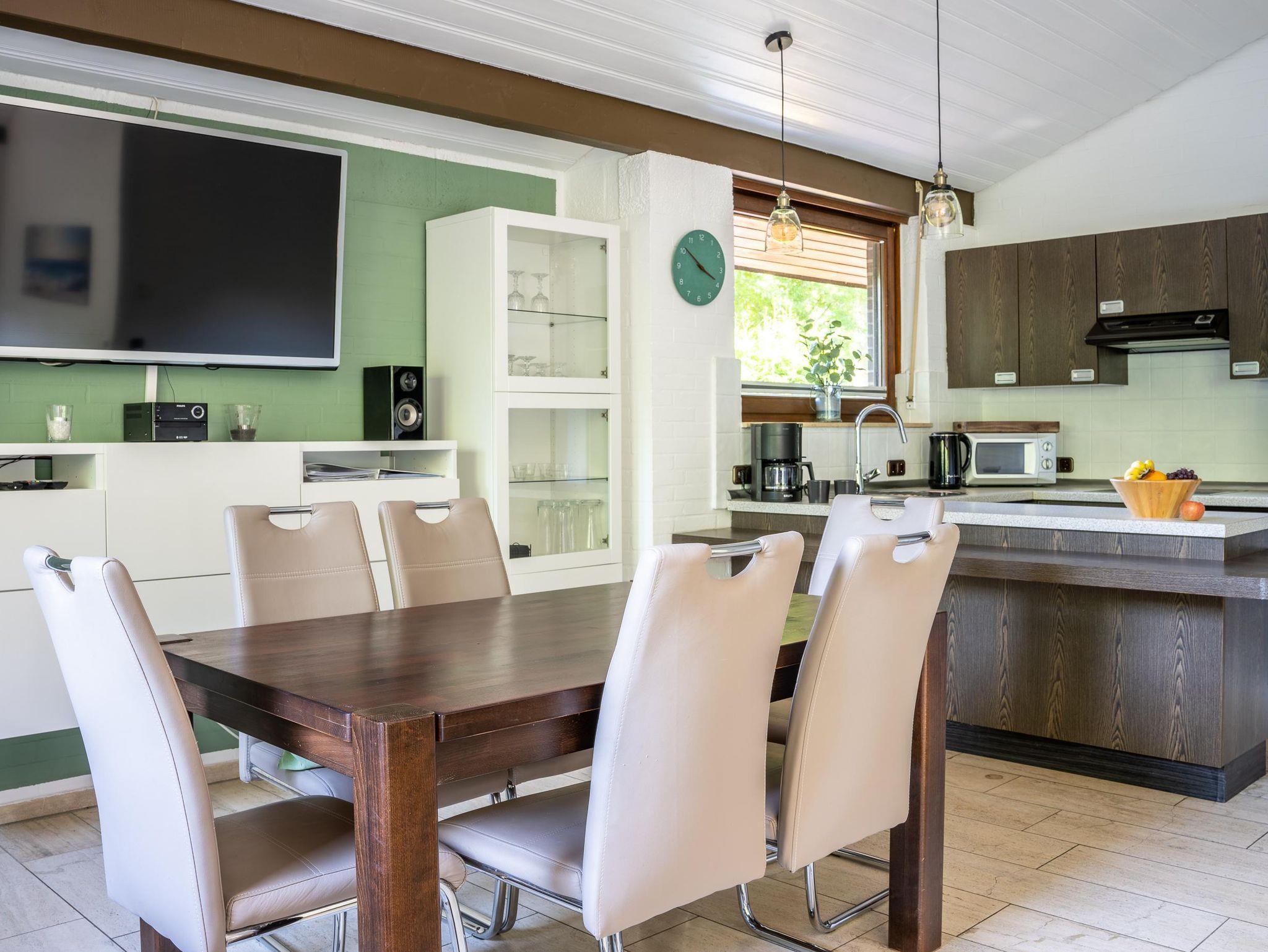 Der großzügige Wohn- und Essbereich mit großem Smart-TV und gemütlicher Sitzecke sowie die voll ausgestattete offene Küche laden zum geselligen Beisammensein ein. Das viele Grün und der Baumbestand im liebevoll angelegten Garten ermöglichen erholsame Momente in absoluter Privatsphäre. Genießen Sie die Sonne im Lounge-Bereich auf der Südterrasse. An kälteren Tagen können Sie sich mit dem Innen- und Außenkamin angenehm einheizen. Eine Grill- und Feuerschale für gemütliche Grillabende ist ebenfalls vorhanden.