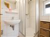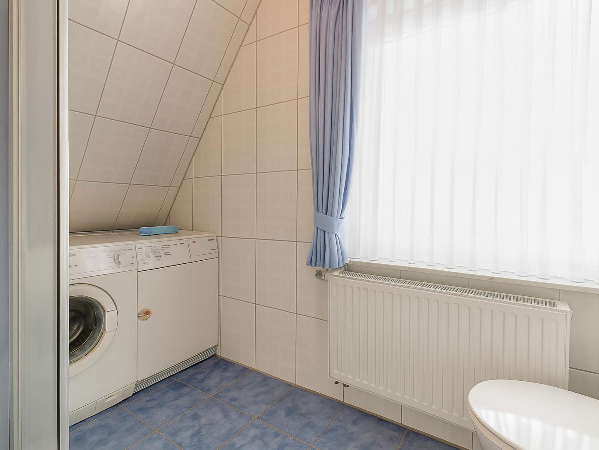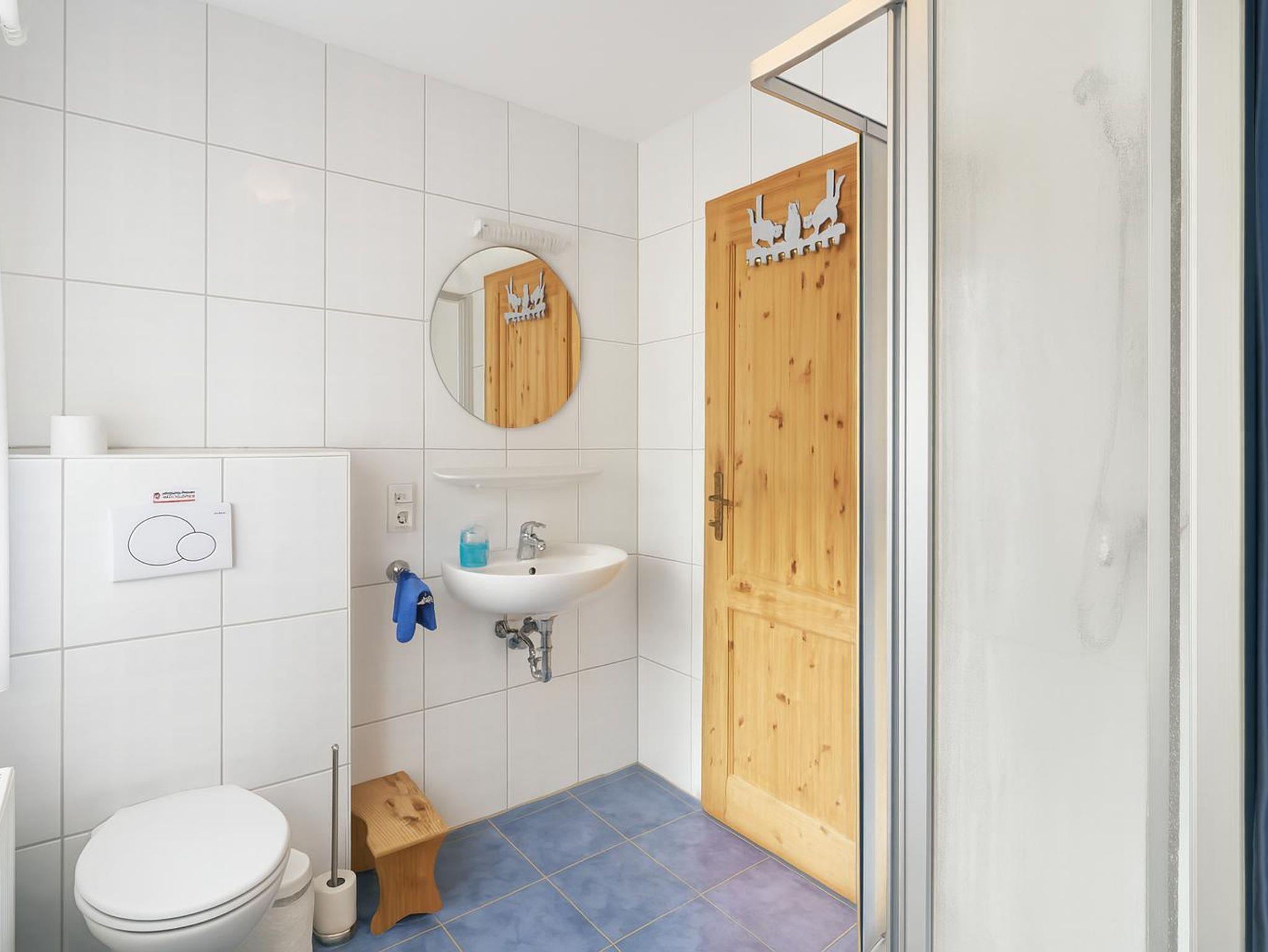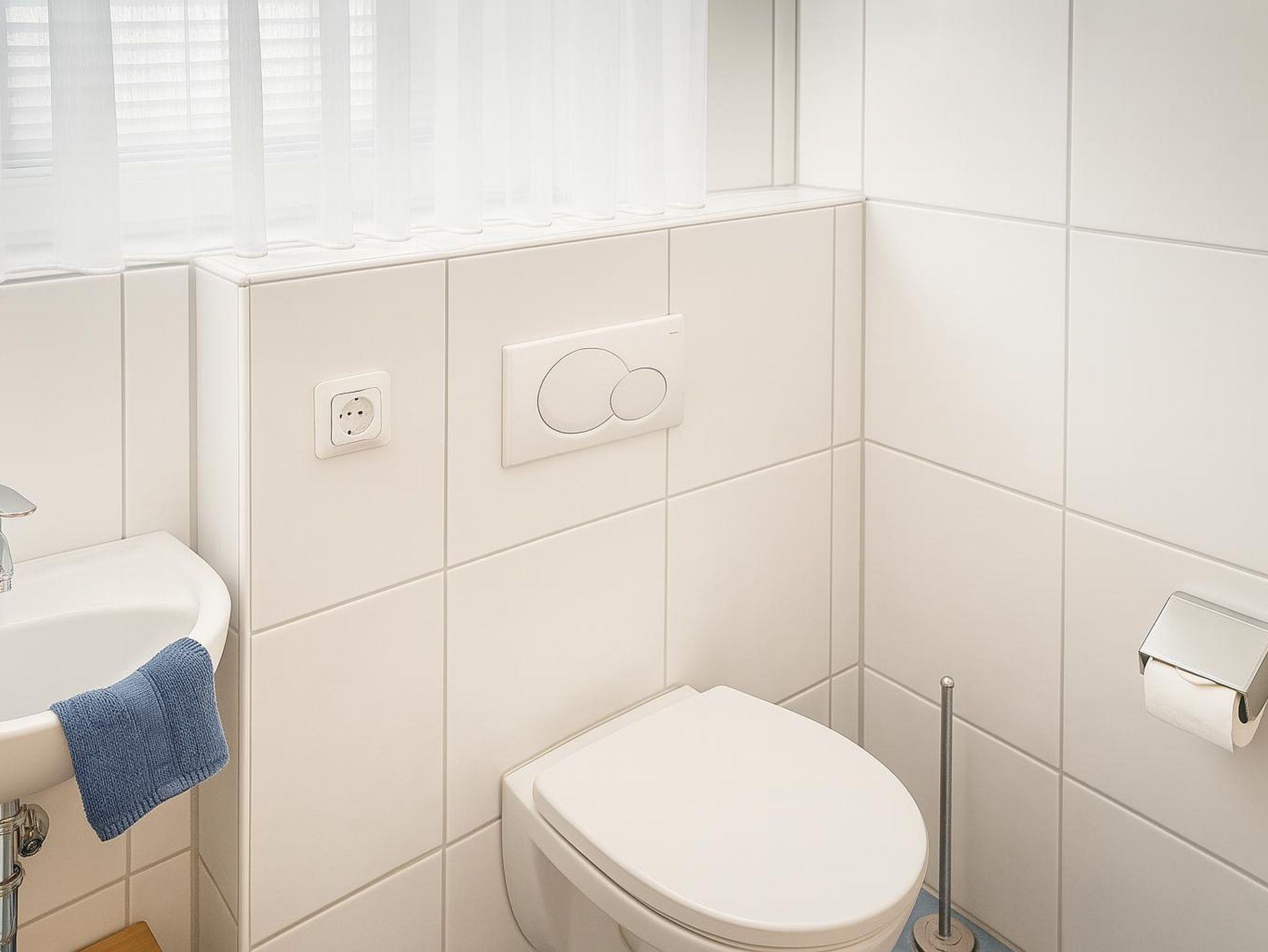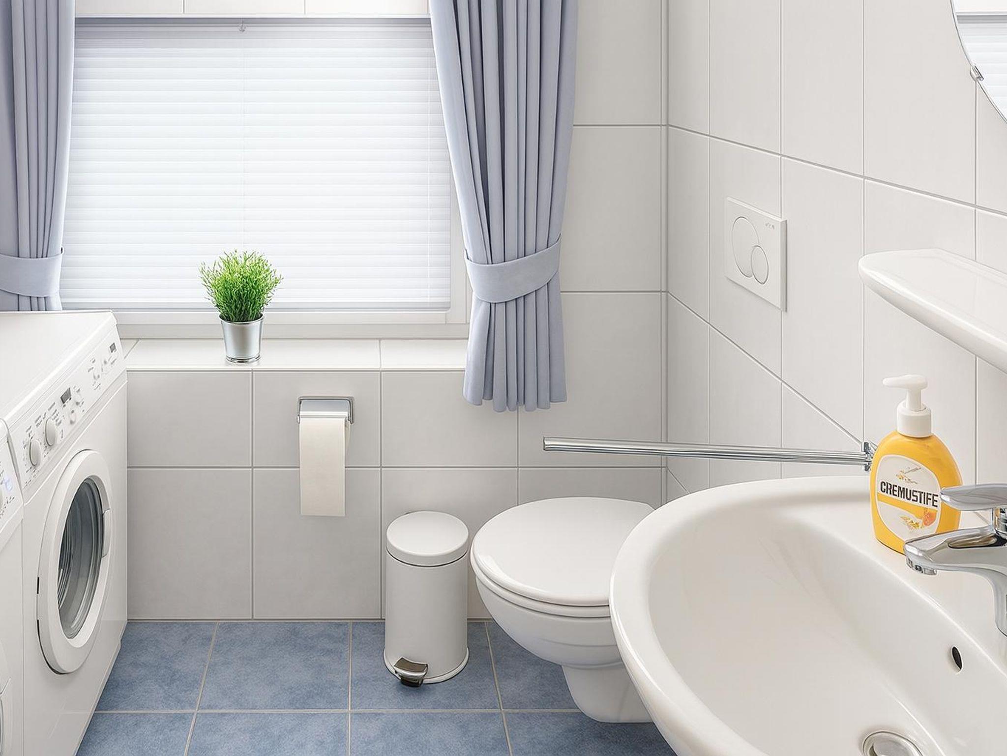 Das Badezimmer verfügt über eine Dusche, ein WC und ein Waschbecken. Weiterhin befinden sich hier Waschmaschine und Trockner. Waschpulver ist, sofern nicht vom Vormieter verbraucht, ebenfalls vorhanden. Ein Fön steht den Gästen hier ebenfalls zur Verfügung. Zusätzlich gibt es in der Ferienwohnung ein separates Gäste-WC.