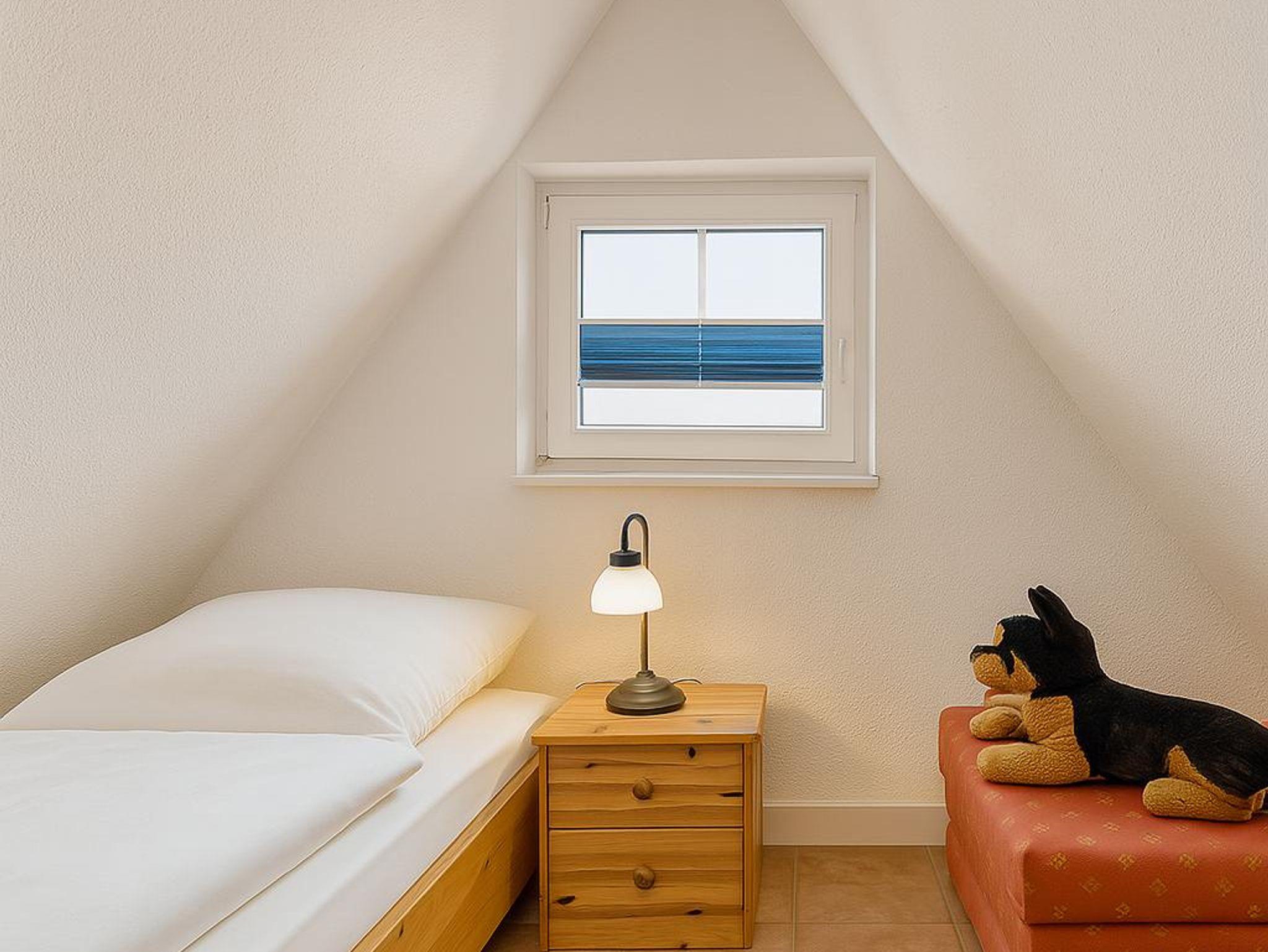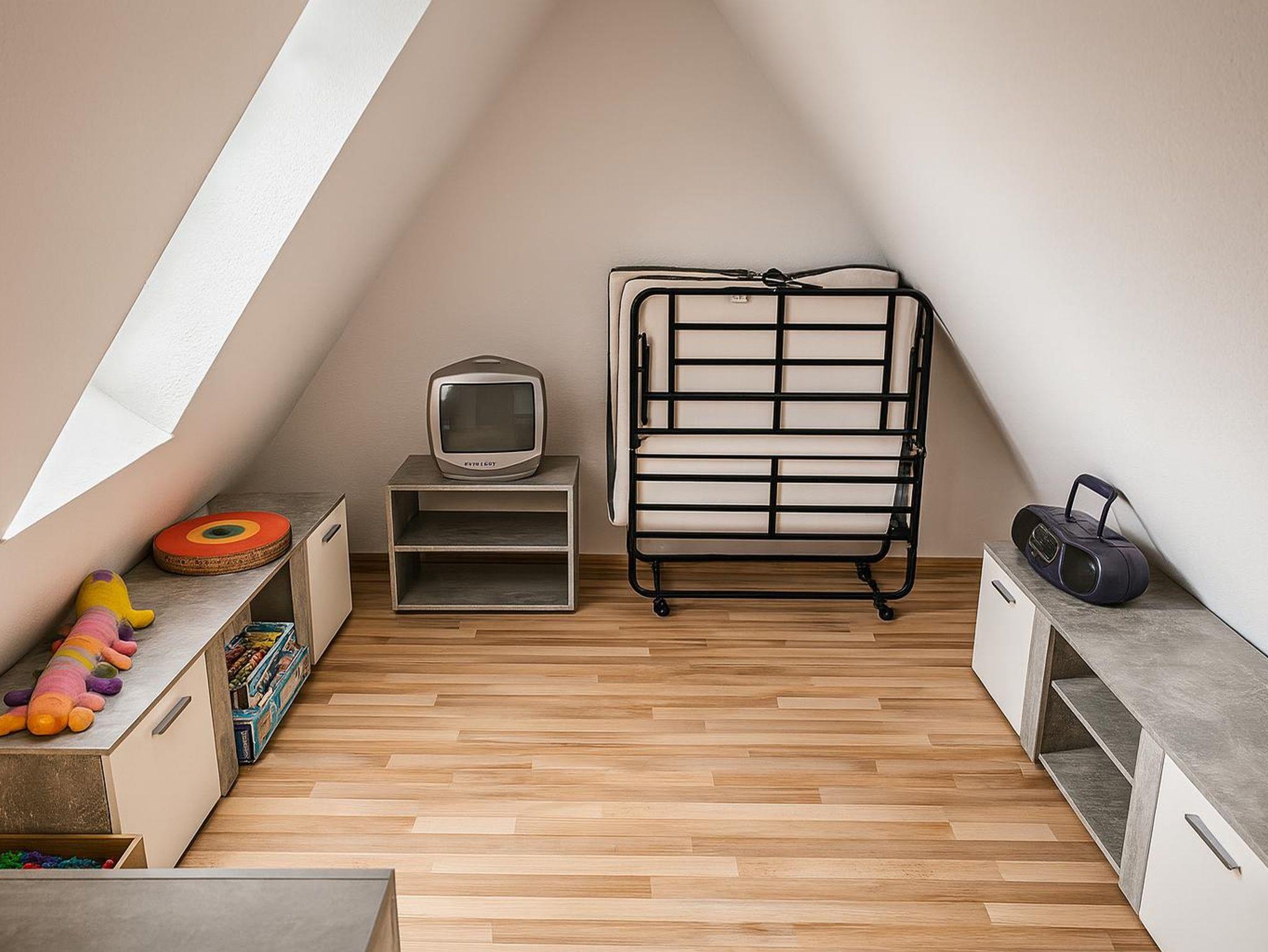 Das Kinderzimmer bietet Platz für max. zwei Personen in einem breiten Bett (140 cm x 200 cm). Bücher und Spielzeug stehen den Kindern zur Verfügung. Außerdem gibt es einen Kleiderschrank und einen Smart-TV. Das absolute Highlight des Kinderzimmers ist der kleine Spitzboden, der zum Spielen und Lesen einlädt - ein toller Rückzugsort für die Kleinen. Über eine Leiter gelangen die Kinder dorthin und können dort ein kleines Matratzenlager aufschlagen.