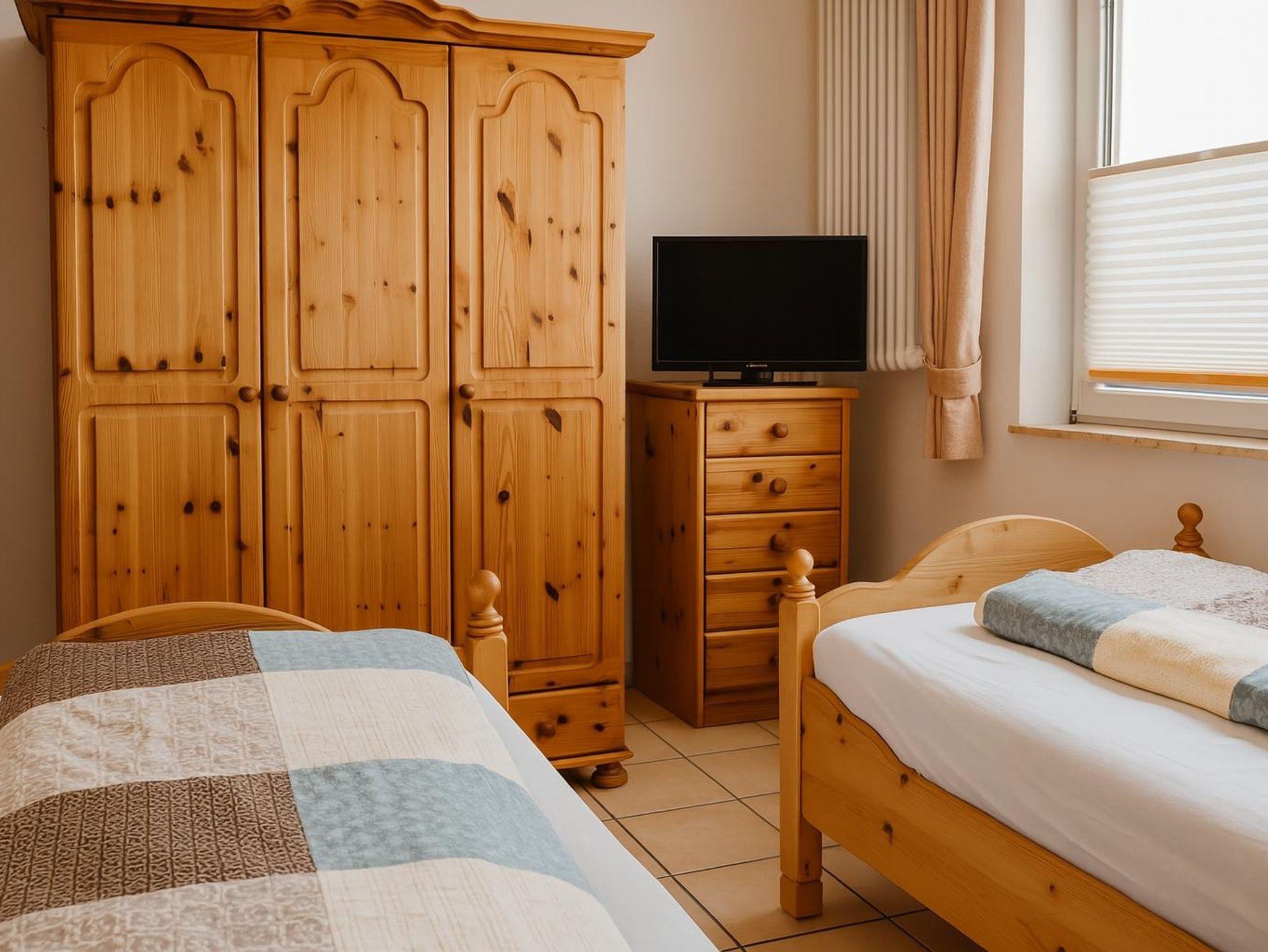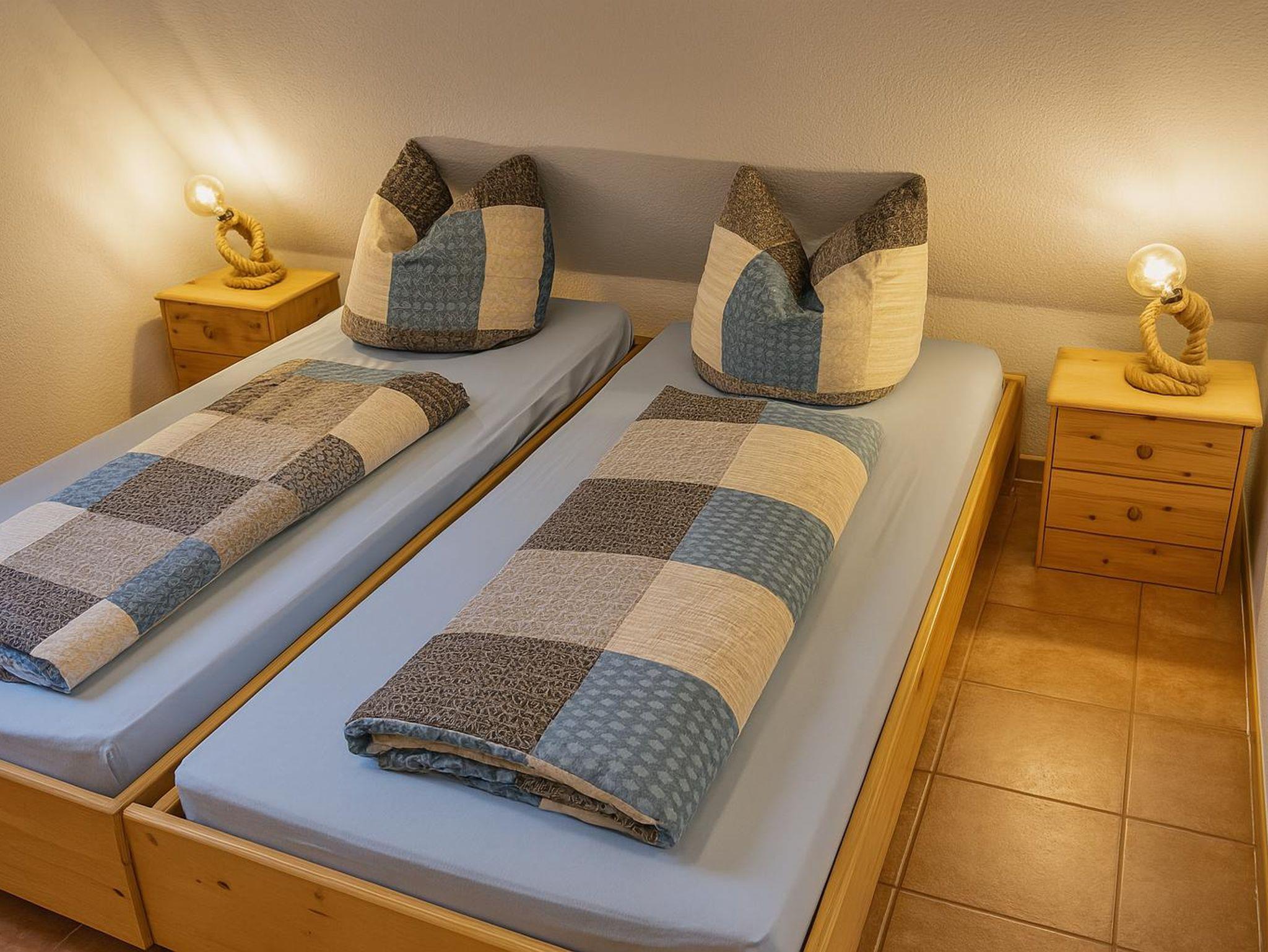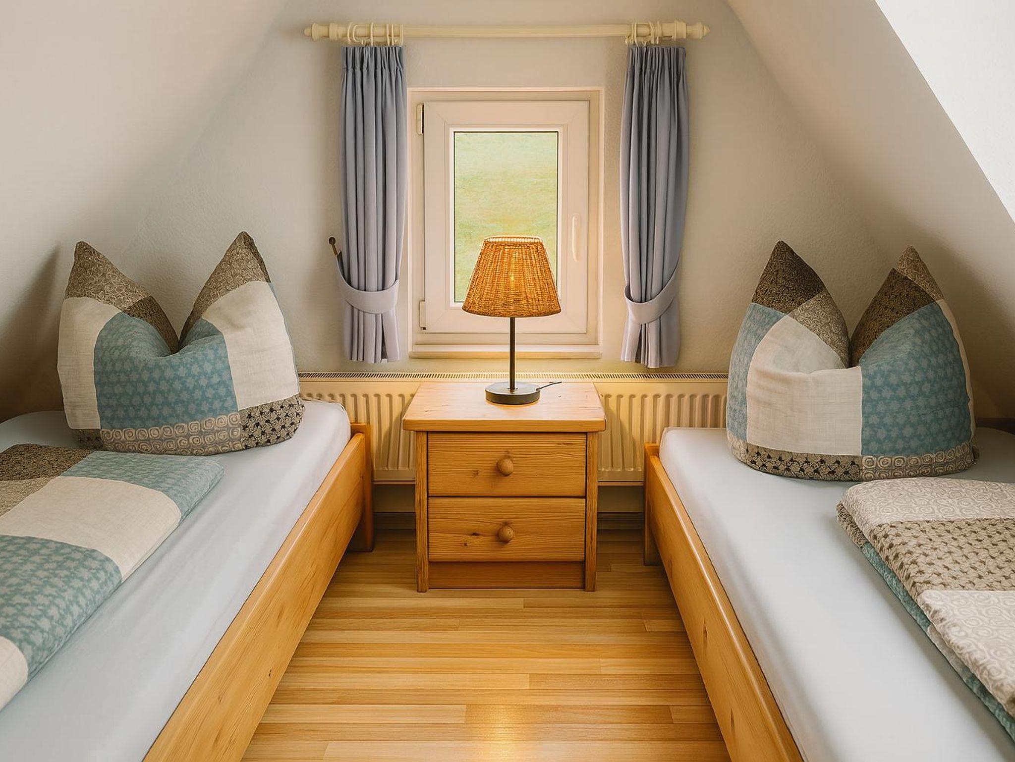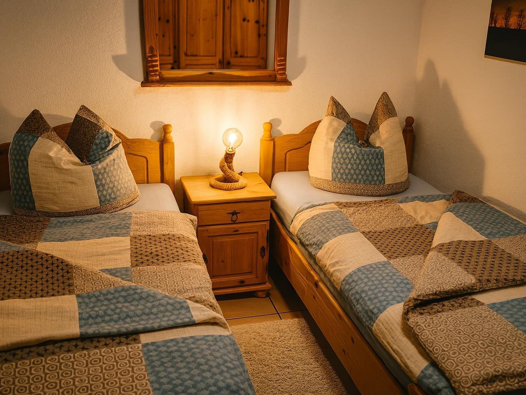 Das gemütliche Schlafzimmer bietet Platz für zwei Gäste. Hier befinden sich zwei Einzelbetten, ein Nachttisch mit Lampe, ein großer Kleiderschrank sowie eine kleine Kommode. Außerdem befindet sich hier ein Babyreisebett, welches bei Bedarf aufgestellt werden kann.