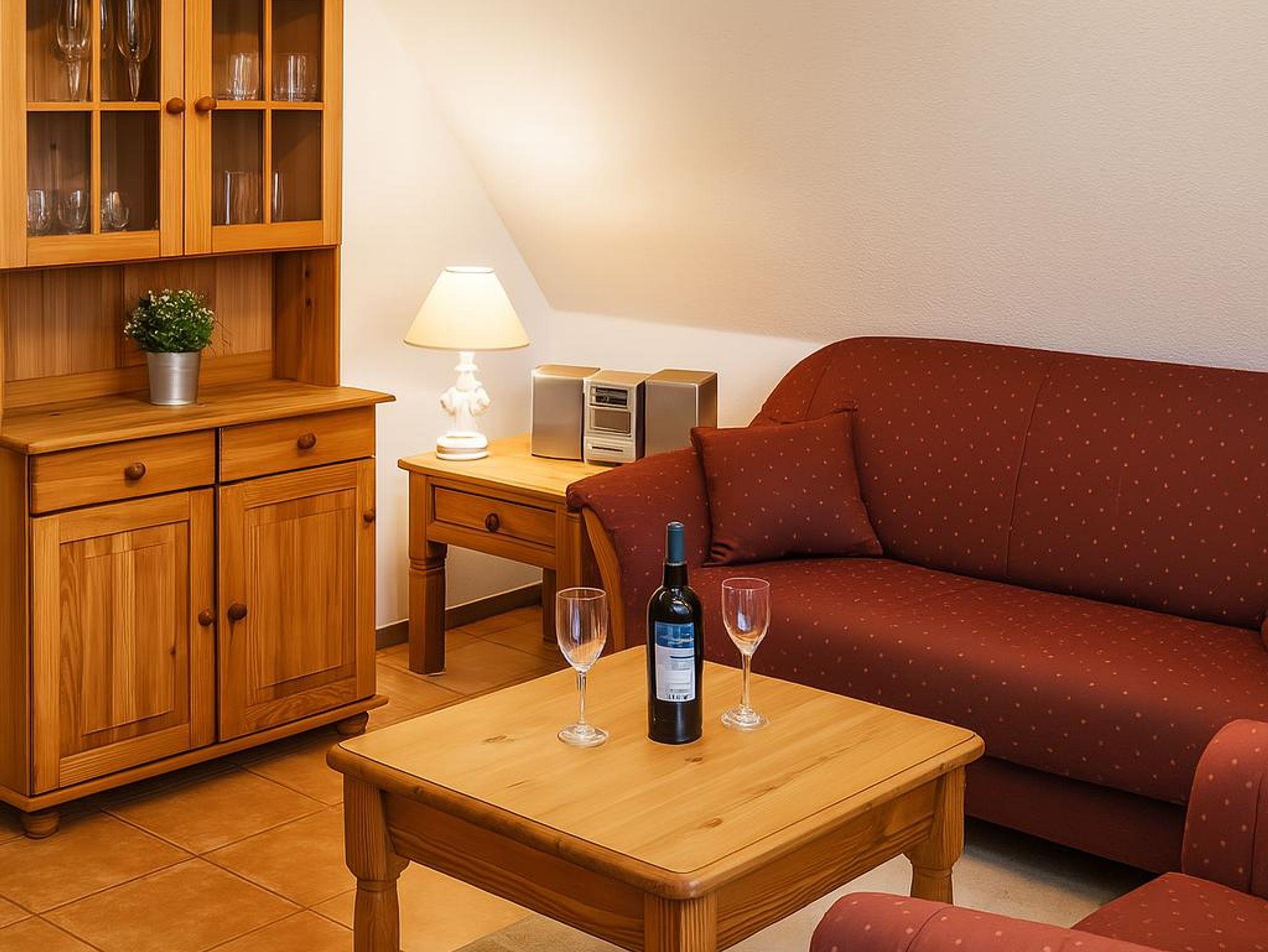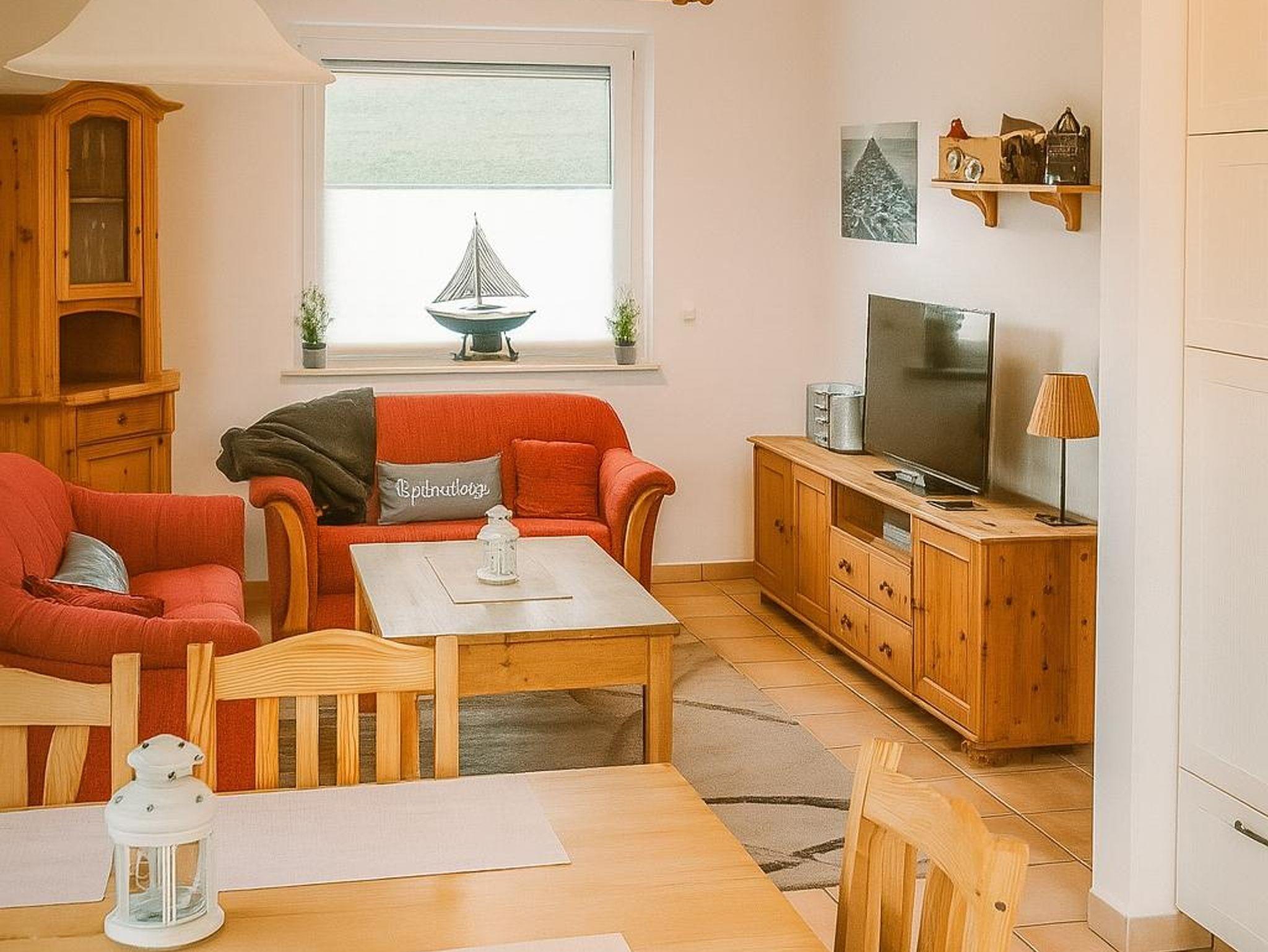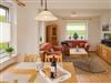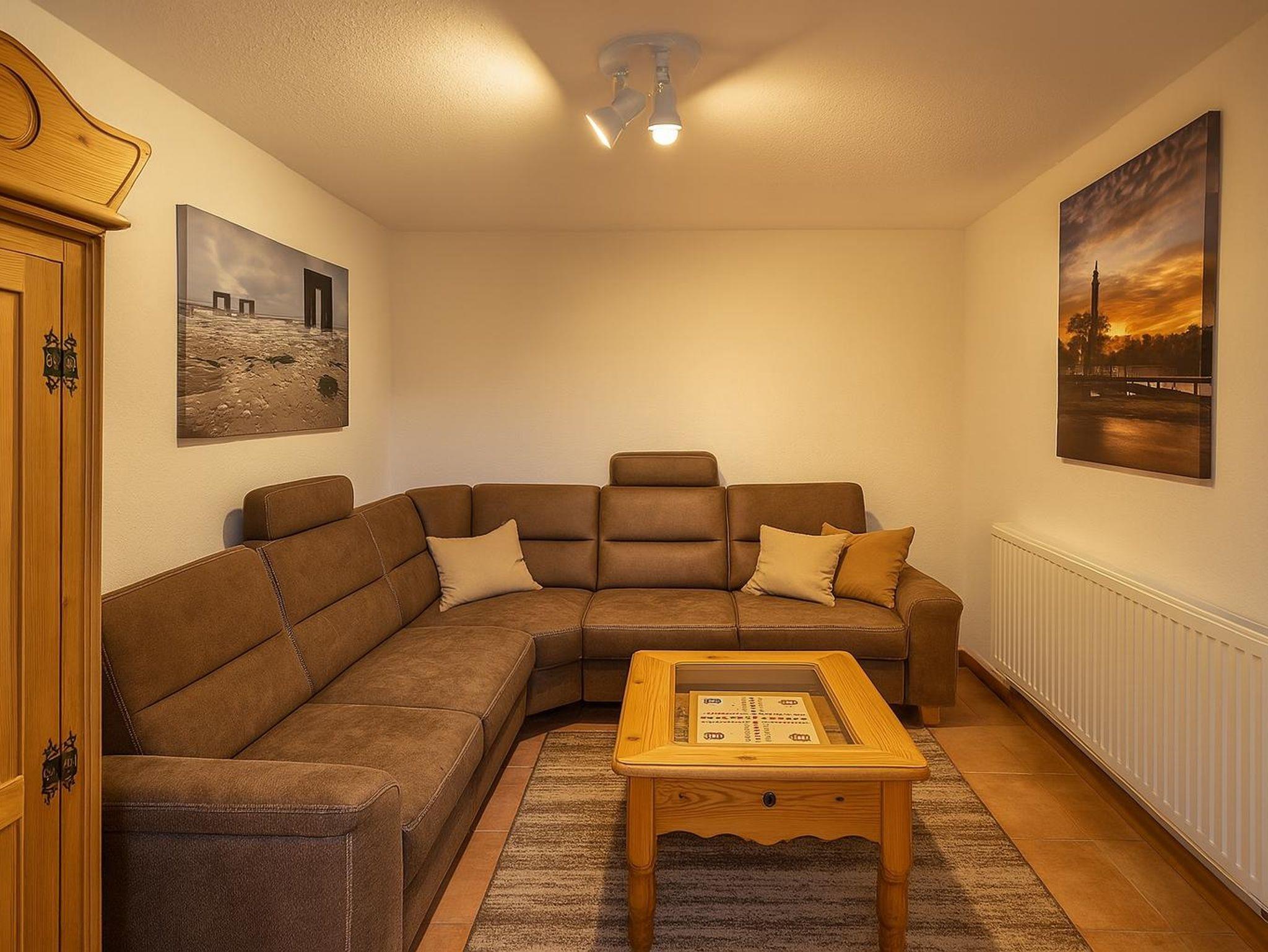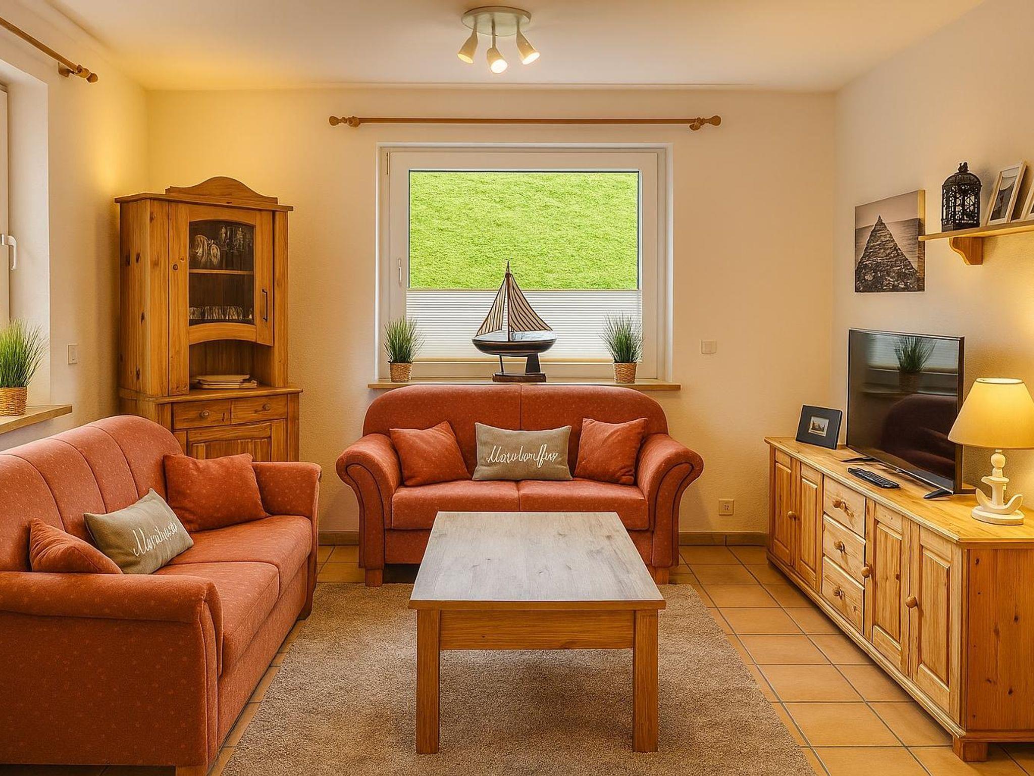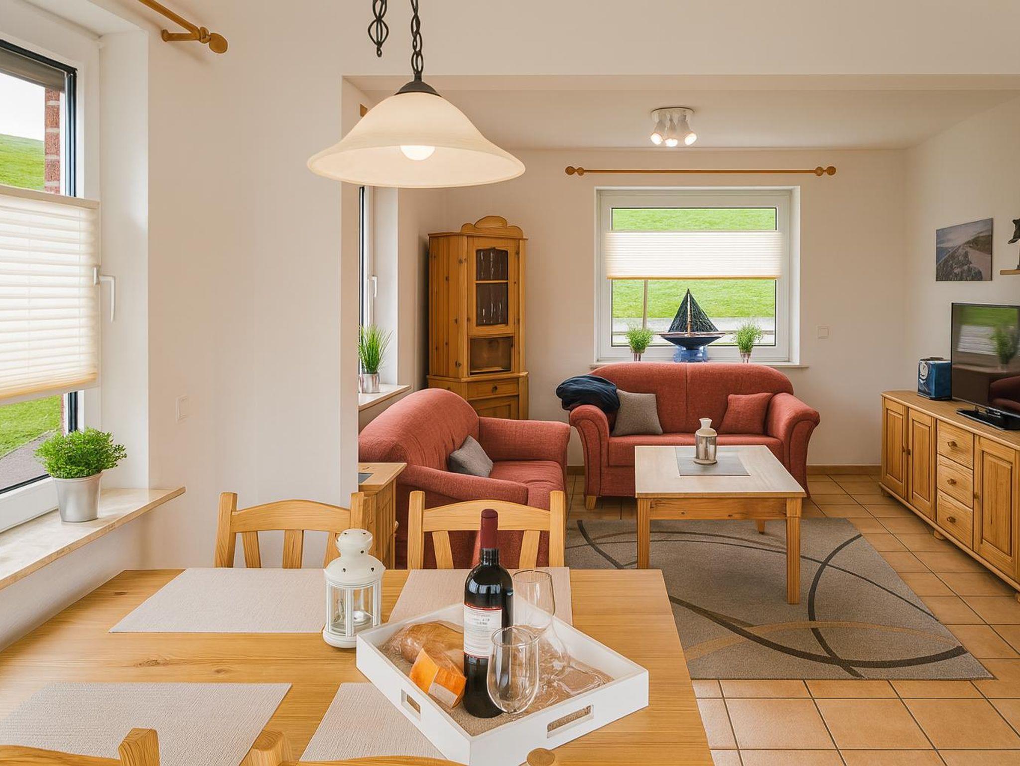 Das lichtdurchflutete Wohnzimmer verfügt über eine gemütliche Sitzgruppe mit Wohnzimmertisch und einen Smart-TV. Hier können gesellige, aber auch kuschelige Abende verbracht werden. Aber auch tagsüber kann man den schönen Blick auf den Deich genießen.