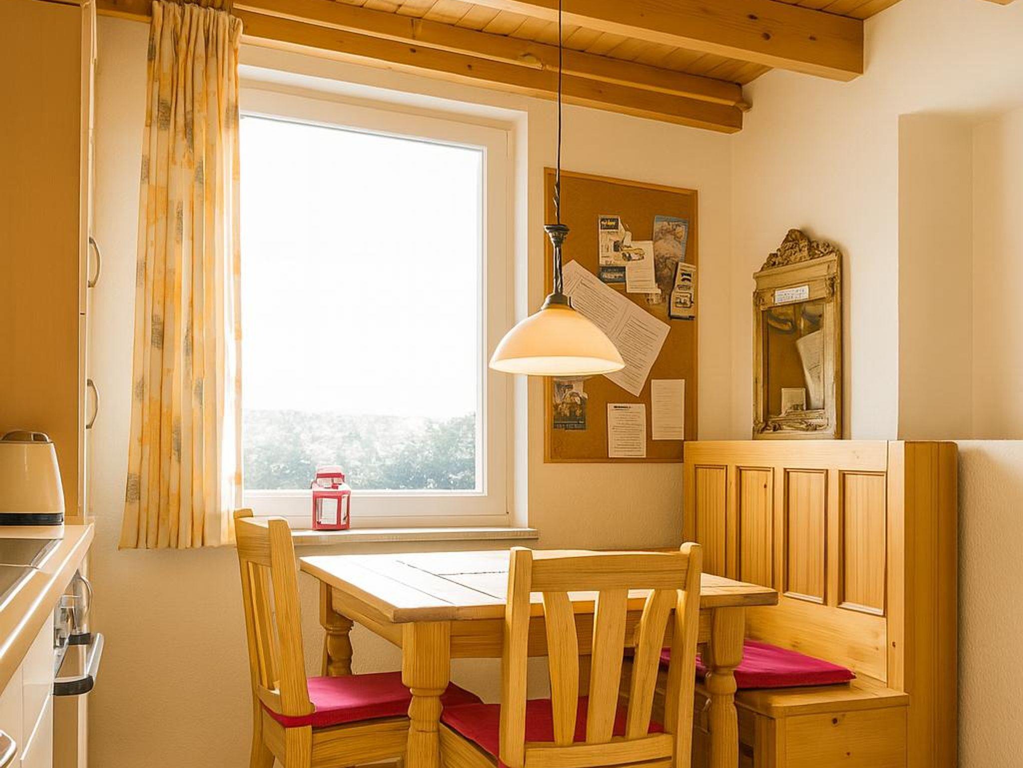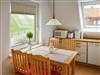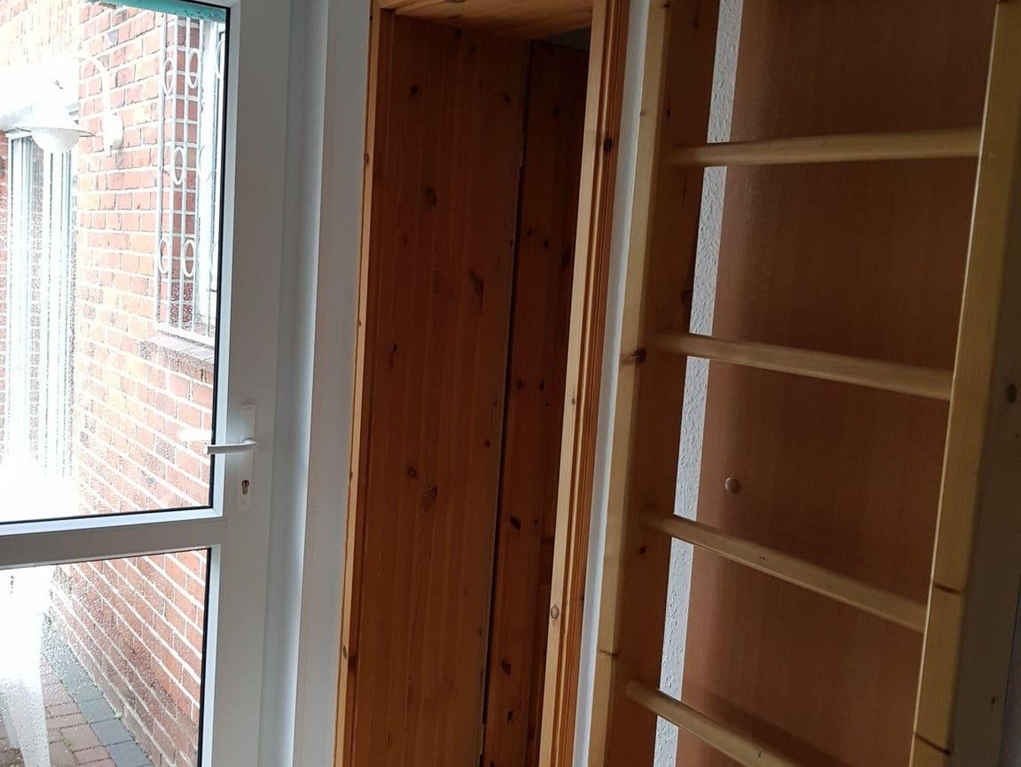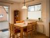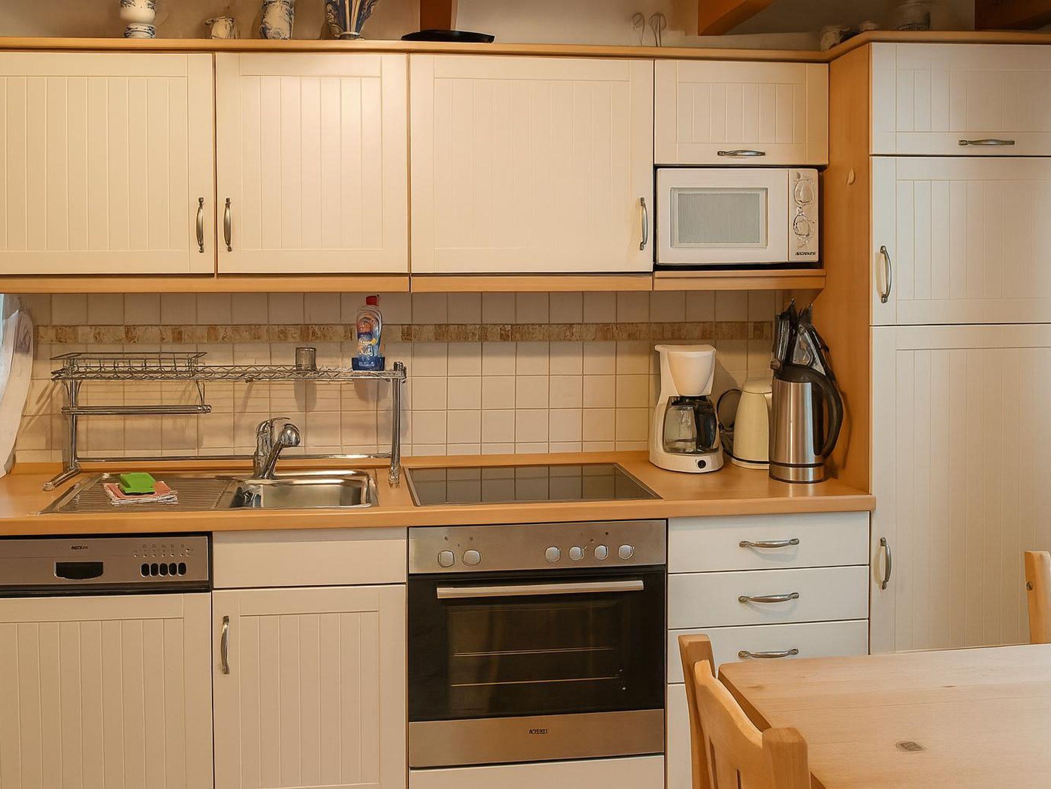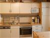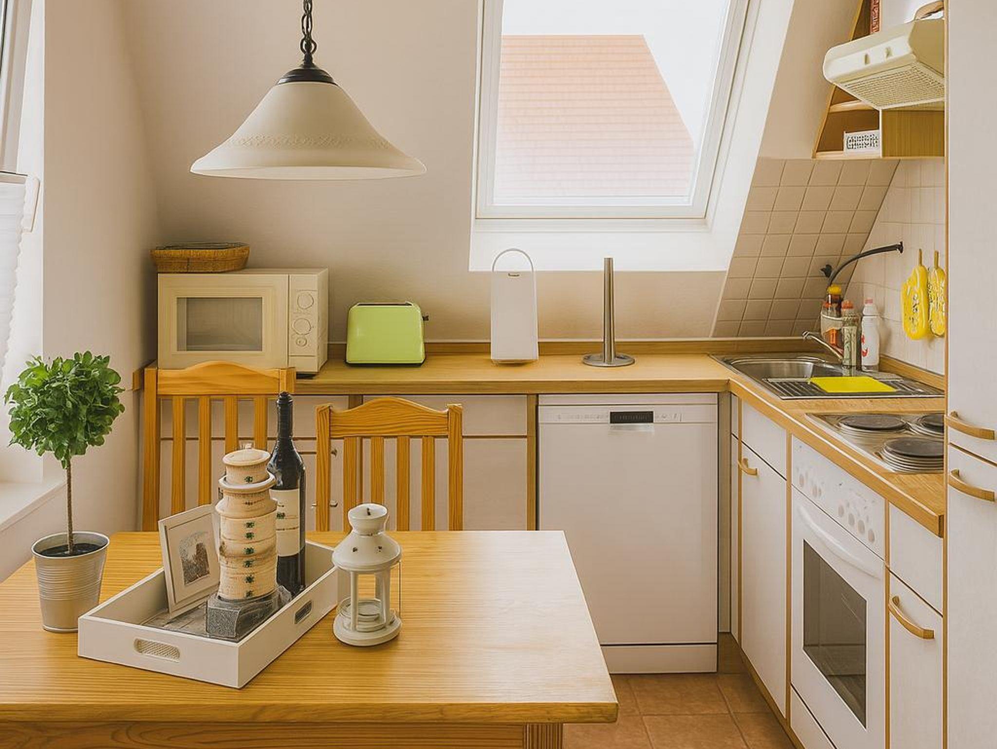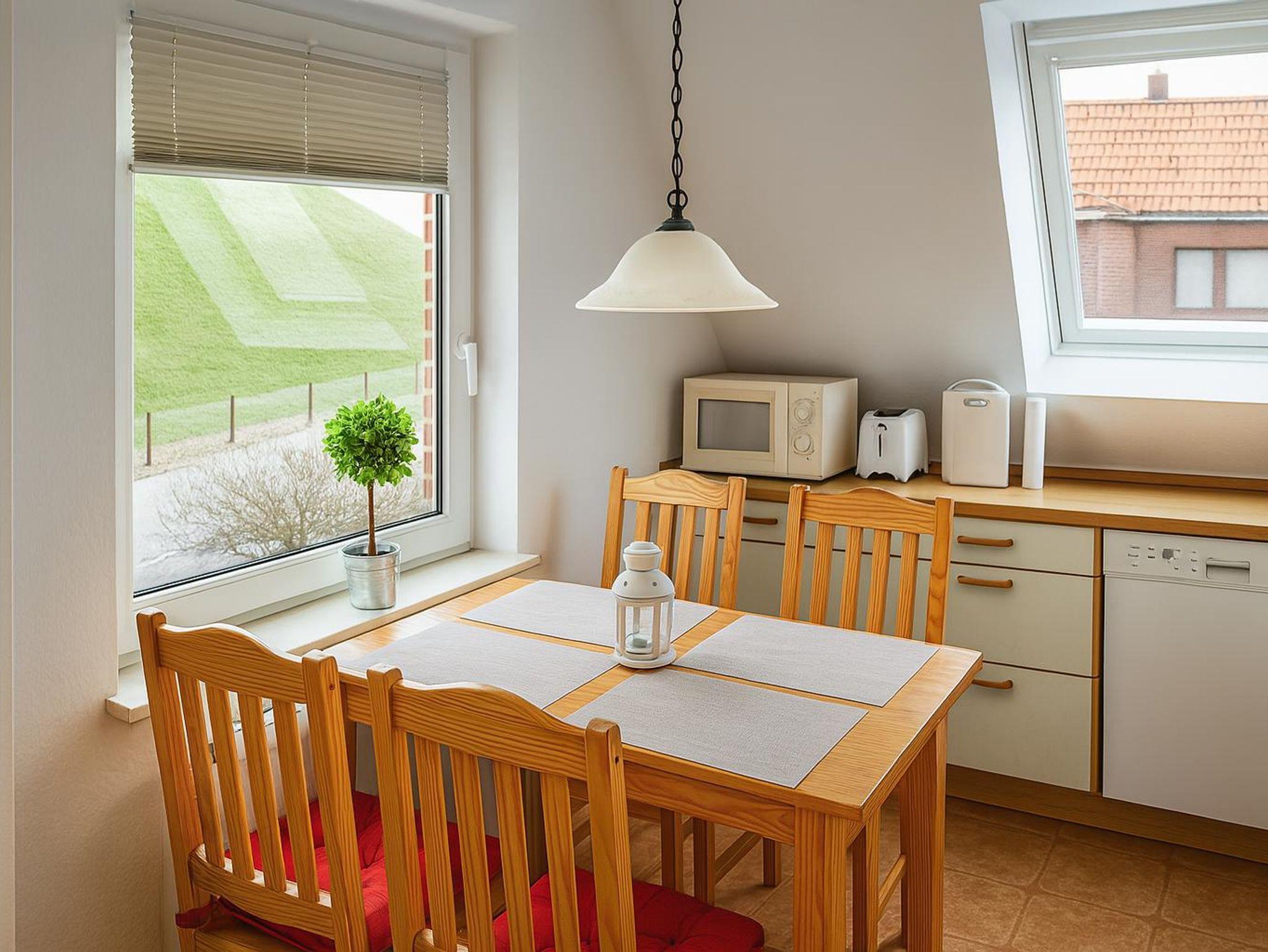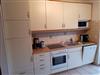 Die Küche lässt keine Wünsche offen. Die komplett ausgestattete Küchenzeile verfügt über einen Kühlschrank, ein Gefrierfach, einen Backofen, einen Herd und eine Spülmaschine. Außerdem befinden sich in den Schränken alle wichtigen Utensilien von elektrischem Dosenöffner bis zum Waffeleisen. Auch eine Grundausstattung von Kaffeefilter bis hin zu Salz und Pfeffer ist (sofern nicht vom Vormieter verbraucht) vorhanden. Die Essecke ist großzügig sowie hell und freundlich. Außerdem befindet sich hier im Eckschrank eine kleine Bibliothek, welche zum Lesen einlädt.