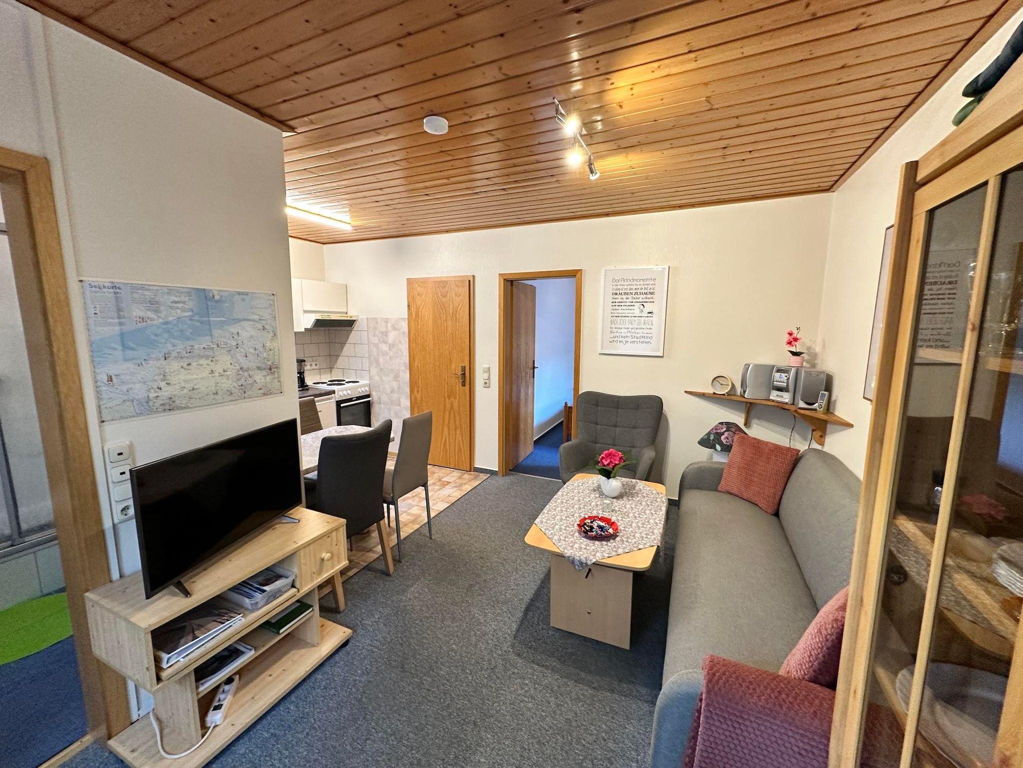 Wohnzimmer mit Couchtisch, 3 er Sofa u. Fernsehsessel, Glasschrank, Digital Sat-TV, Telefon, Stereoanlage mit CD-Player natürlich mit Fernbedienung