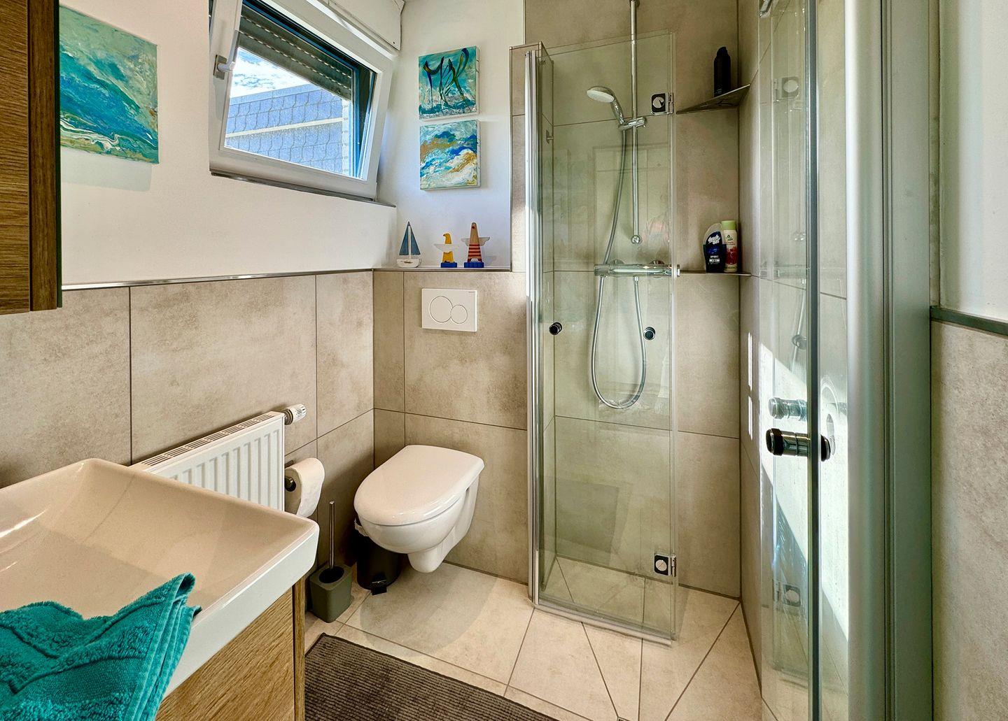 Das Bad ist ebenerdig gefliesst und die Duschtüren sind einklappbar.