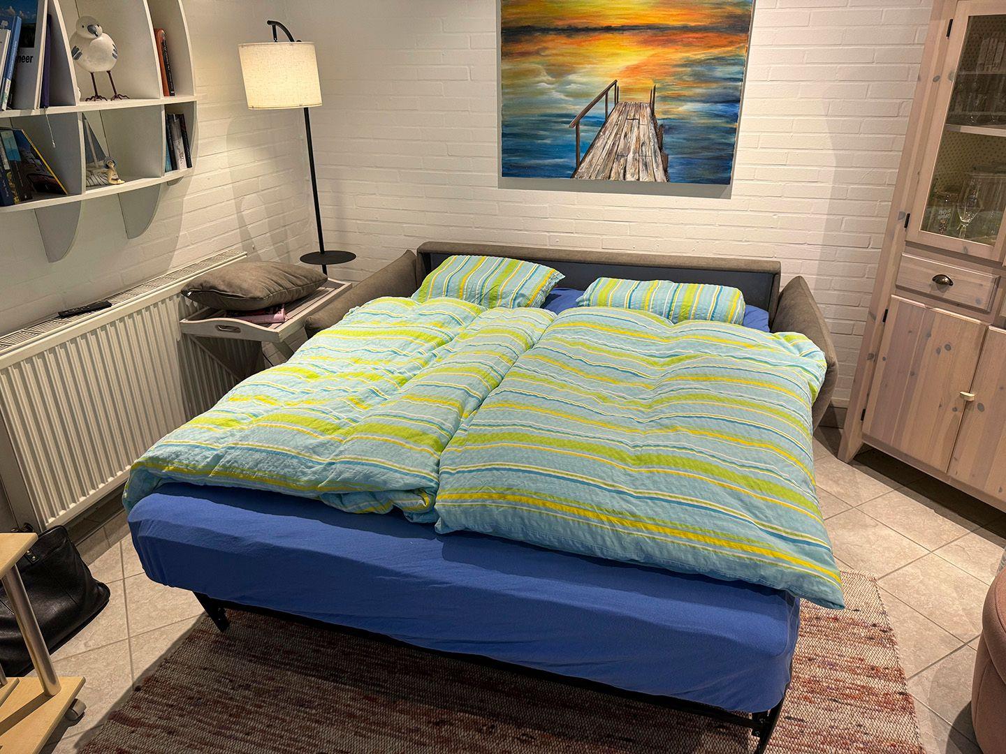 Das Ferienhaus verfügt über zwei getrennte Schlafzimmer und einen Wohnschlafraum (Schlafsofa mit einer Federkernmatratze + Geltopper mit einer Liegefläche 160 x 200).