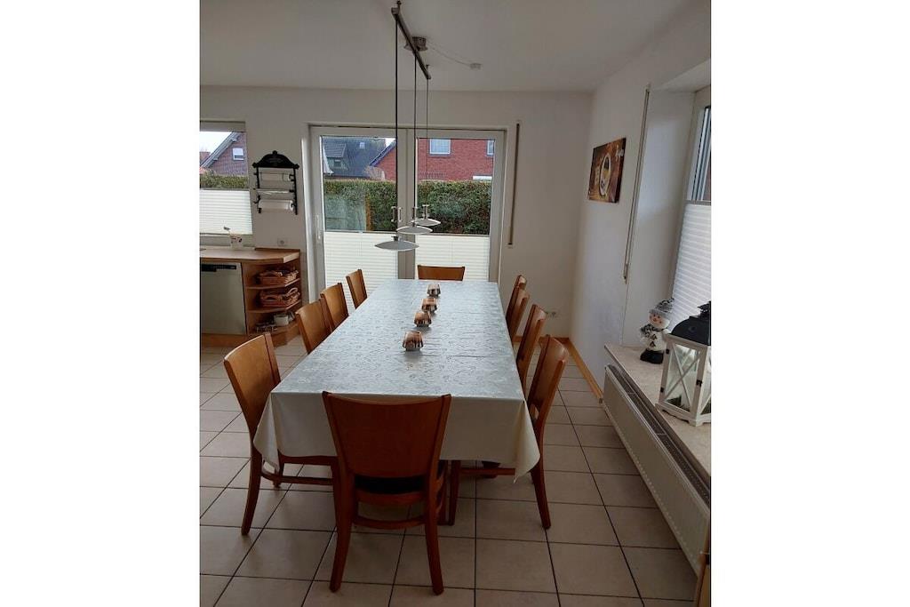Large holiday home, North Sea dike, 10 people, 3 bathrooms, 5 bedrooms, 2 kitchens, 2 living rooms, garden, large families, disabled people, study groups, quiet, WiFi, 2 TVs, garage