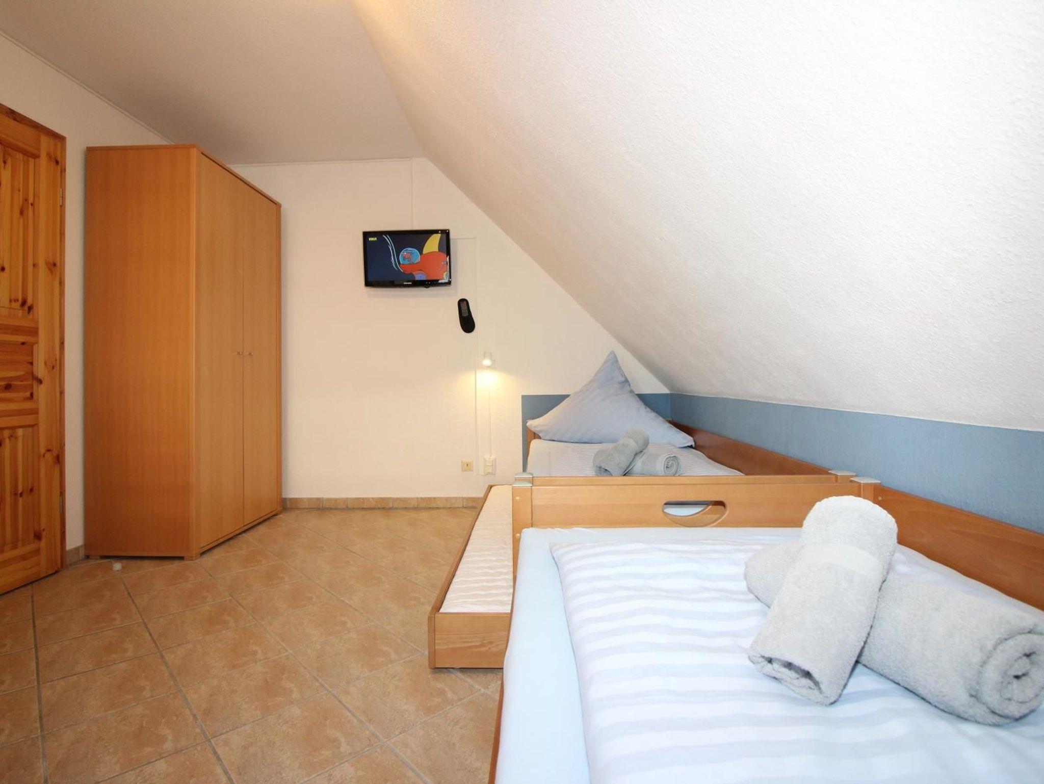 Schlafzimmer 2 mit zwei Einzelbetten, eins davon ein Tandembett, 24 LCD-TV