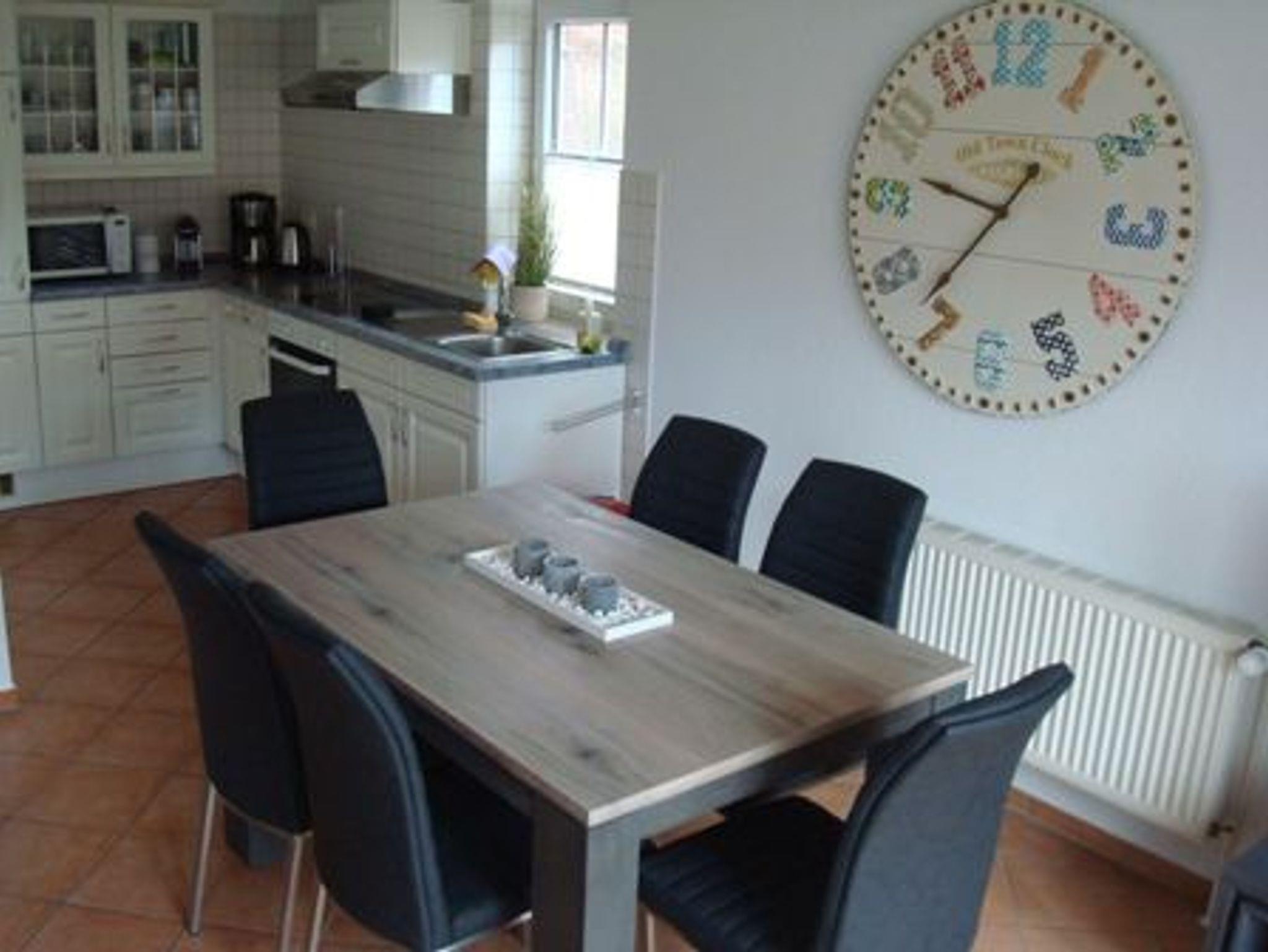 Im EG: Offene Wohnküche/Esszimmer mit Spülmaschine, Herd, Backofen, Mikrowelle, Elektrogeräten, zusätzlicher Nespressomaschine, Kühlschrank mit Gefrierfach und Platz für bis zu 6 Personen.