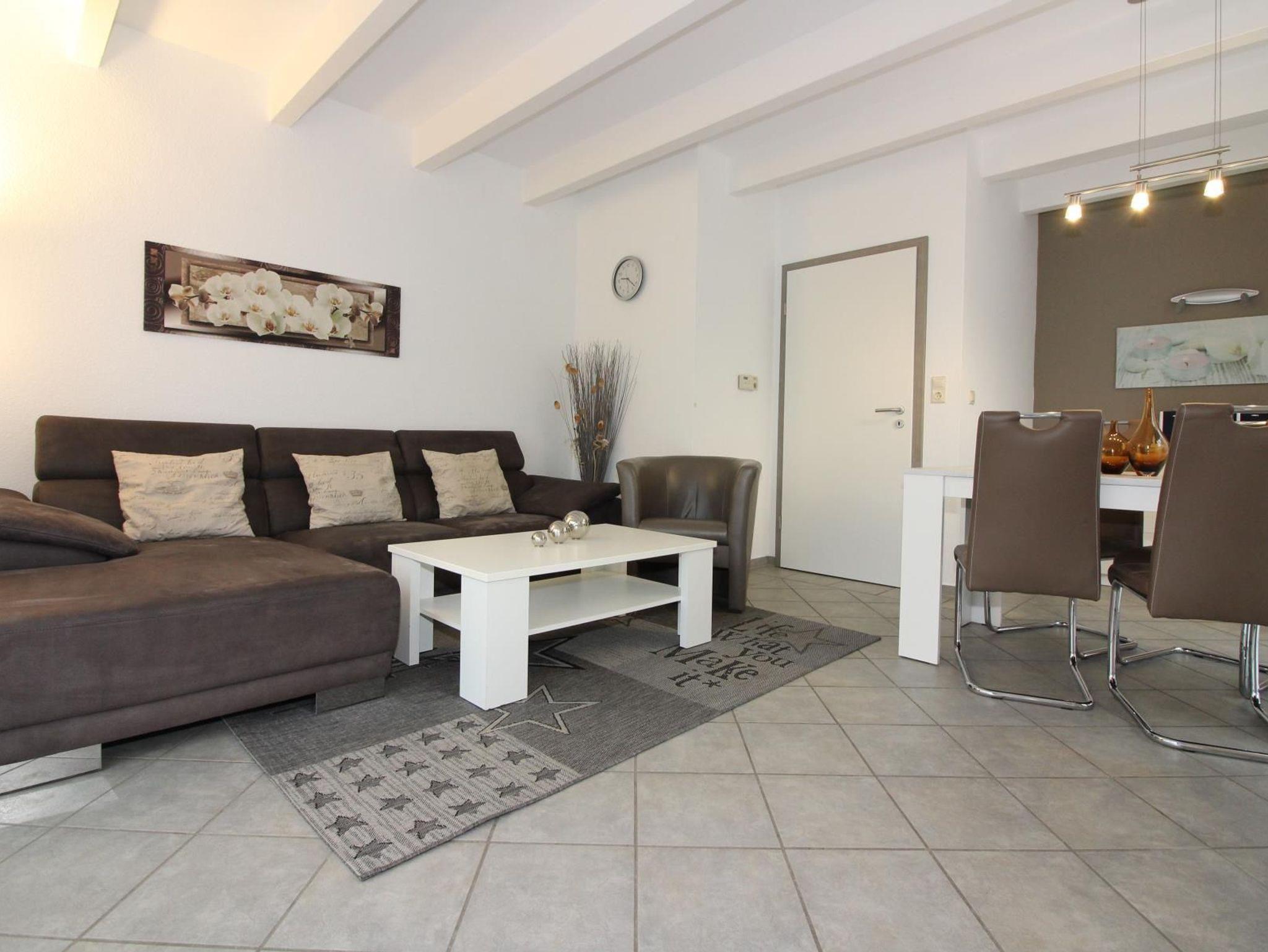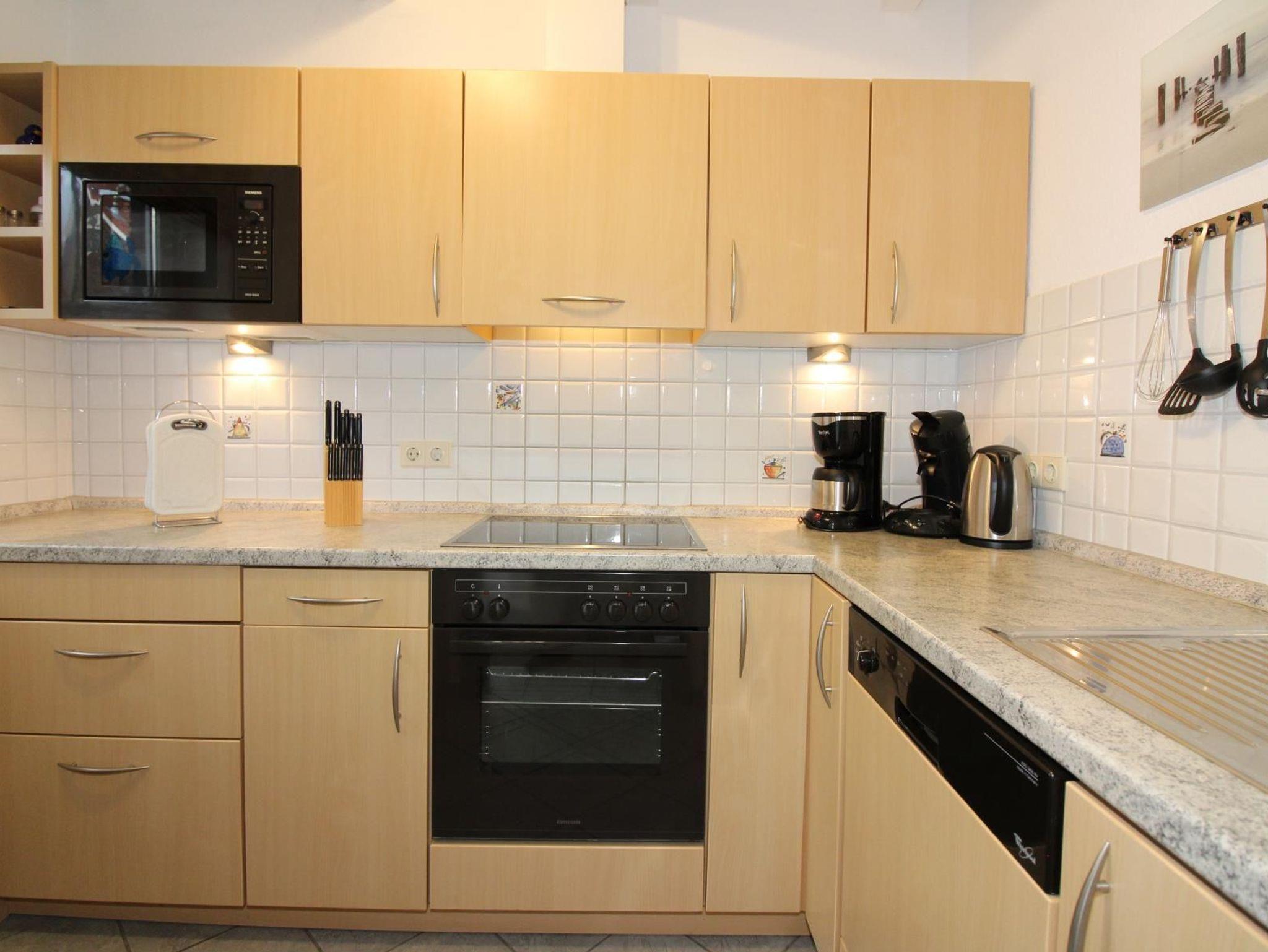 Vom Wohnzimmer aus gelangt man auf die nach Südwesten ausgerichtete Terrasse mit Stühlen, Tisch, Grill, Sonnenliege, Sonnenschirm, Bollerwagen und Abstellraum. Die separate Küche ist ausgestattet mit Backofen, Cerankochfeld, Spülmaschine, Kühlschrank mit Gefrierfach, Mikrowelle, Kaffeemaschine, Eierkocher, Toaster, Wasserkocher und Senseo-Kaffeepadmaschine.