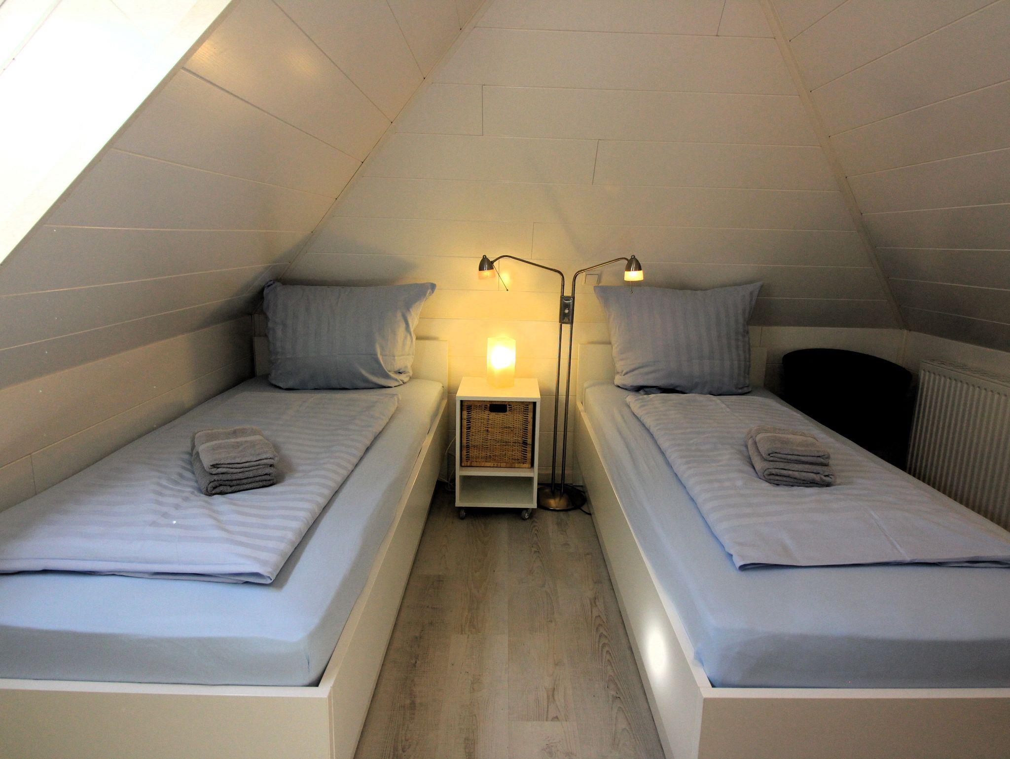 Im Obergeschoss befinden sich ein Schlafzimmer mit Doppelbett, ein Schlafraum mit zwei Einzelbetten und das Badezimmer.
