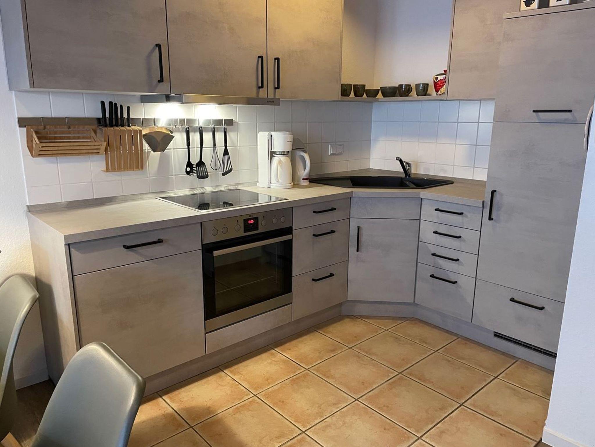 DerKüchenbereich ist mit einer neuen, sehr modernen Einbauküche mitGeschirrspüler, Kühlschrank mit Gefrierfach, Mikrowelle, Backofen, Waffeleisen, Eierkocher, Mixer, Toaster etc. ausgestattet.