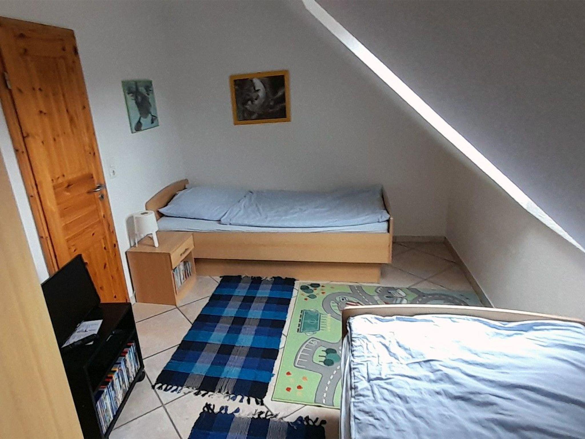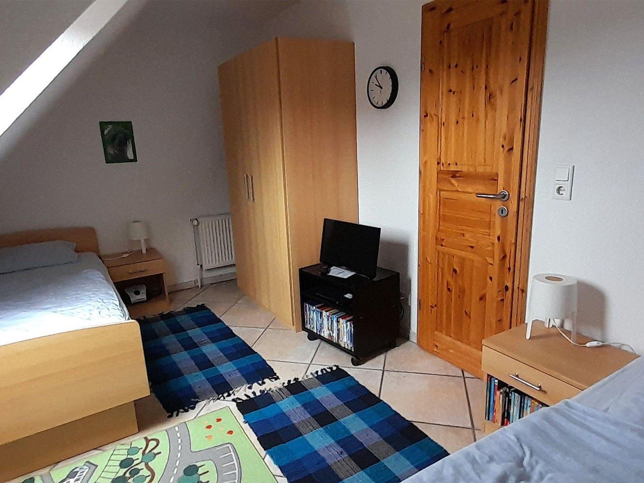 • ein Schlafraum mit zwei nebeneinanderstehenden Einzelbetten im ausgebauten Dachgeschoss / Studio, LED-HD-Fernseher mit Digital-Kabel-TV sowie Radio