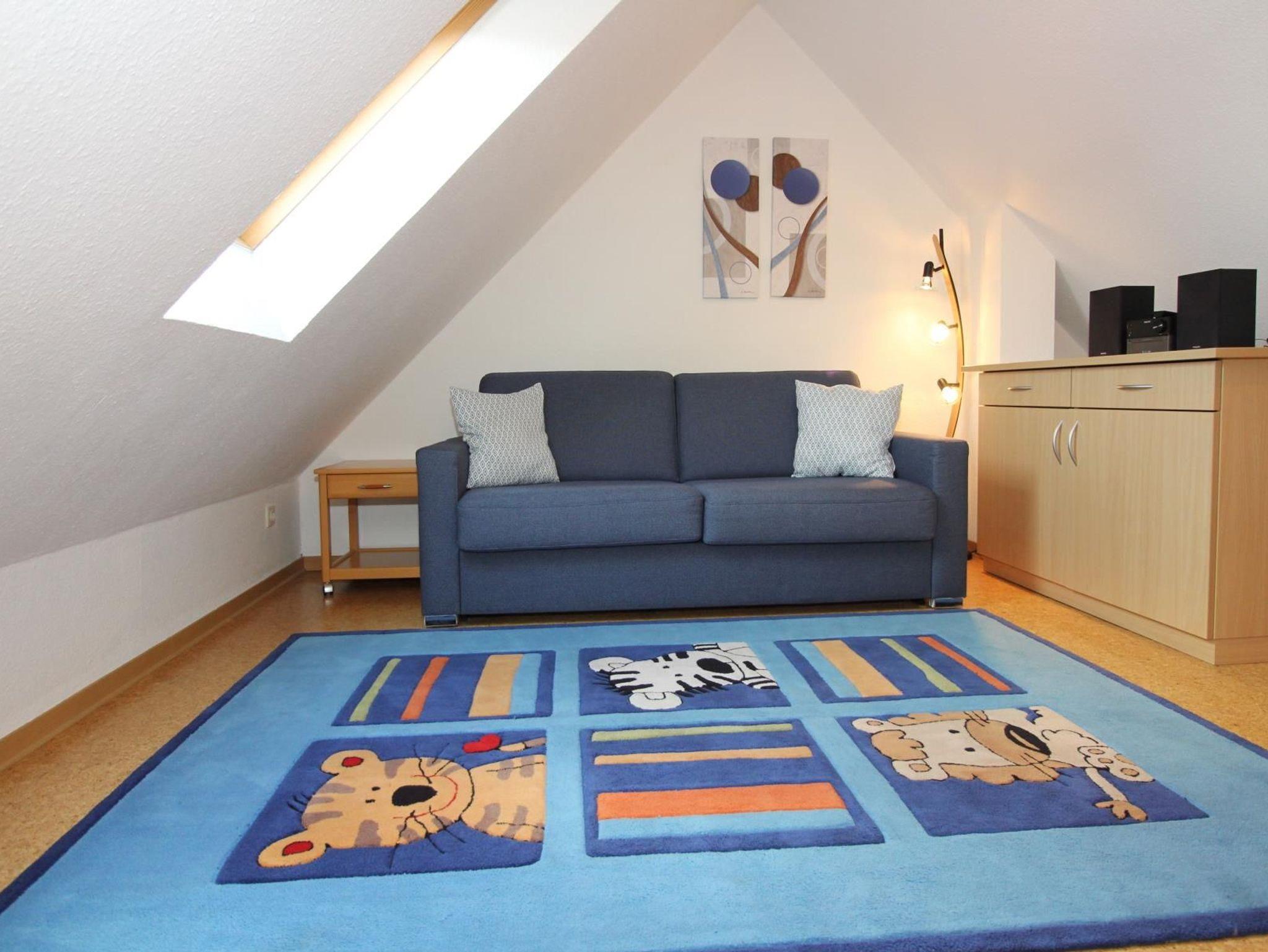 Das Dachgeschoss mit dem ausgebauten Erker erreichen Sie über eine normal begehbare Treppe. Sie führt Sie in einen Spielbereich für die Kleinen mit einem ausklappbaren Schlafsofa. Hier kann sich auch ein Großer weit weg vom Treiben im Erdgeschoß ausruhen. Man findet hier oben diverse Spiele, Bücher, ein Radio mit CD-Player, USB - und Bluetooth - Anschluß und einen zusätzlichen Flachbild-TV mit DVD-Player. Im Erker daneben schließt sich ein Schlafraum mit zwei Betten für den Nachwuchs an.