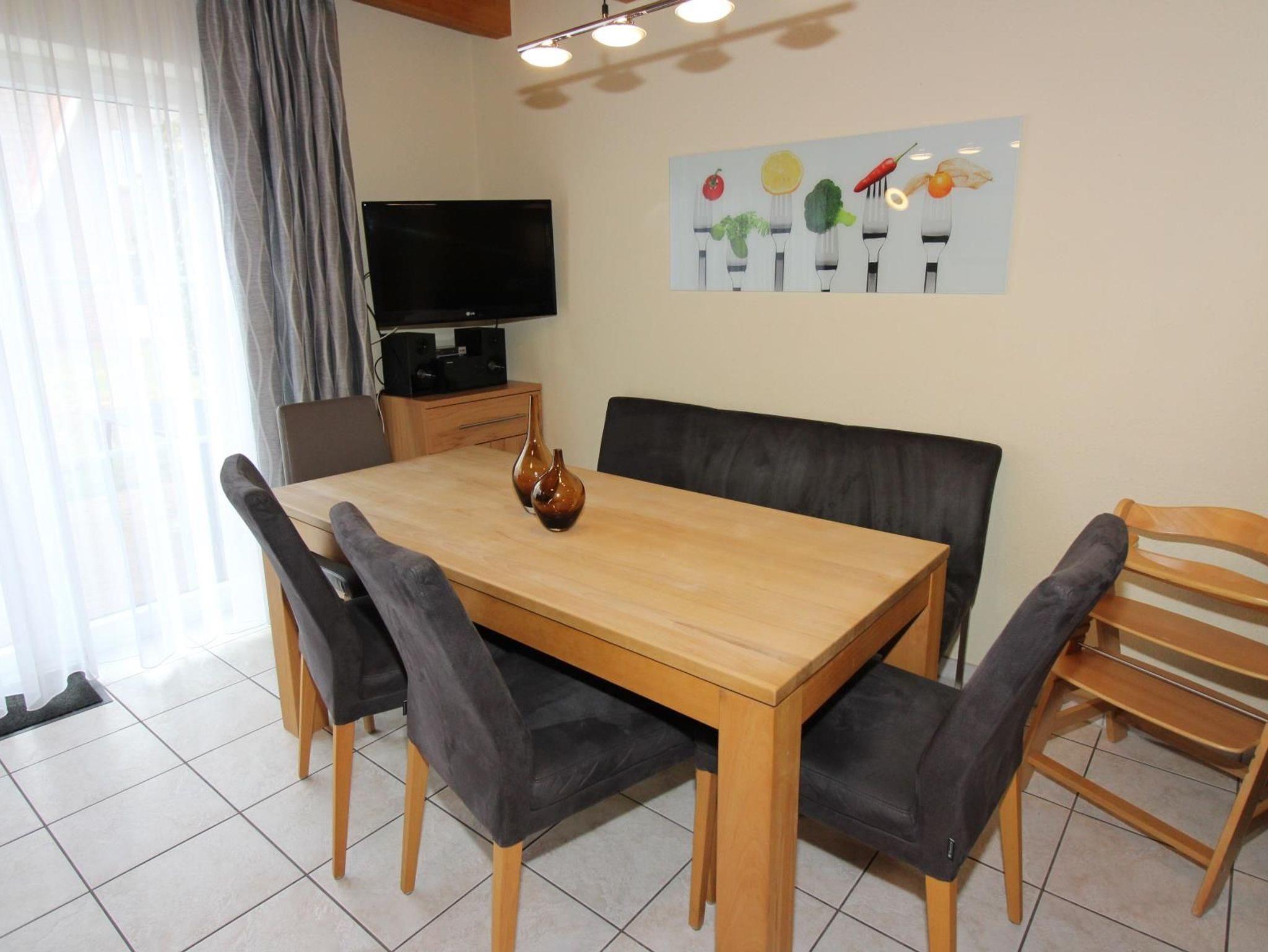 Das Wohnzimmer hat eine gemütliche Sitzgruppe mit bequemer Doppelbettcouch (Liegefläche 160 cm x 210 cm) und einen Kleider-/Wäscheschrank (für die 7. und 8. Person) mit Hoteltresor. Am Essplatz mit großem Tisch finden die Gäste Platz zum Essen, aber auch für Spiele etc. Selbstverständlich gibt es auch einen Kinderhochstuhl.
