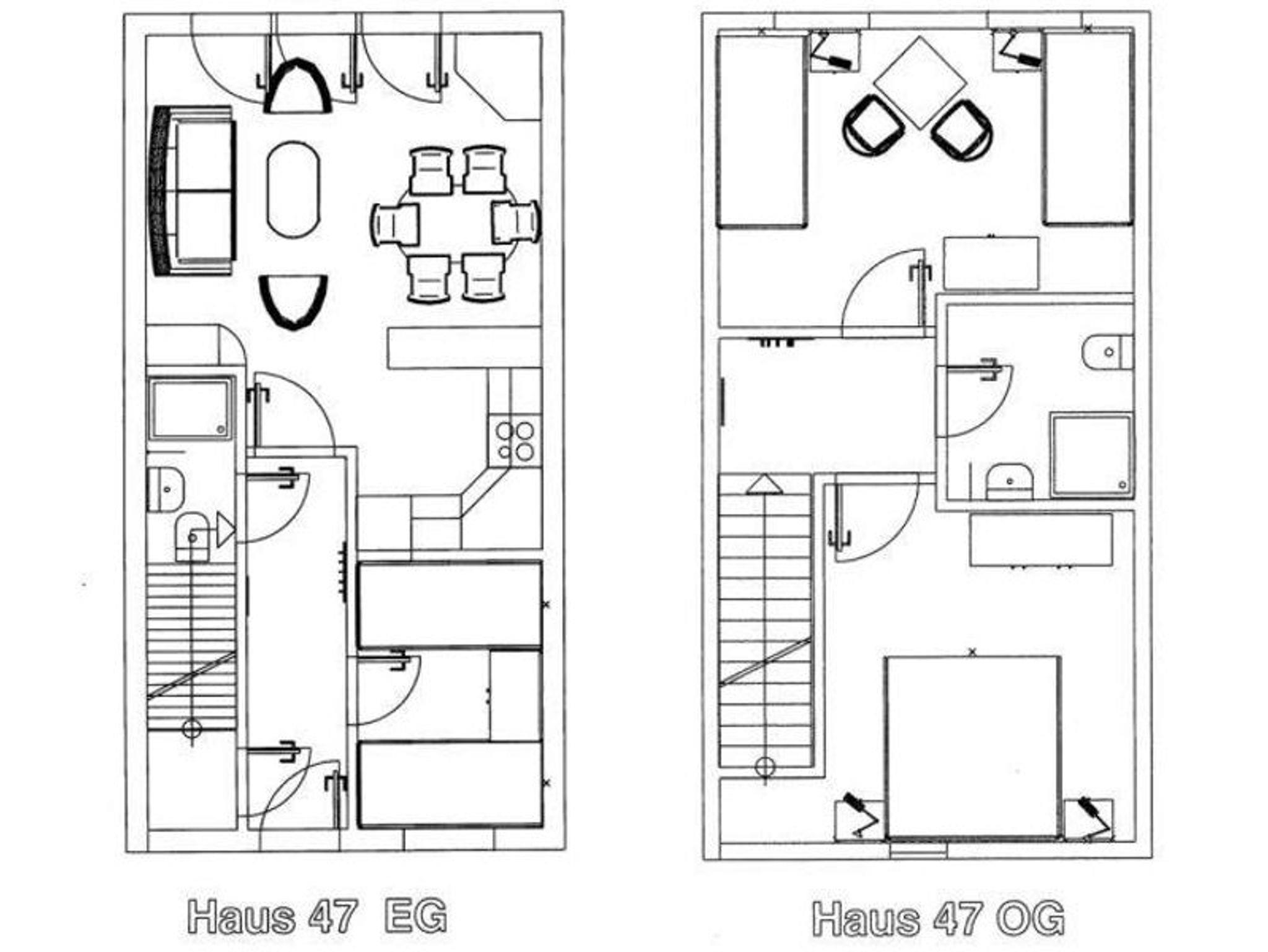 Im OG befinden sich ein Schlafraum mit Doppelbett, einer mit zwei getrennten Betten u. einer Sitzgruppe sowie ein großzügiges Duschbad mit WC, Föhn, Kinder-WC-Sitz und Tritthocker.