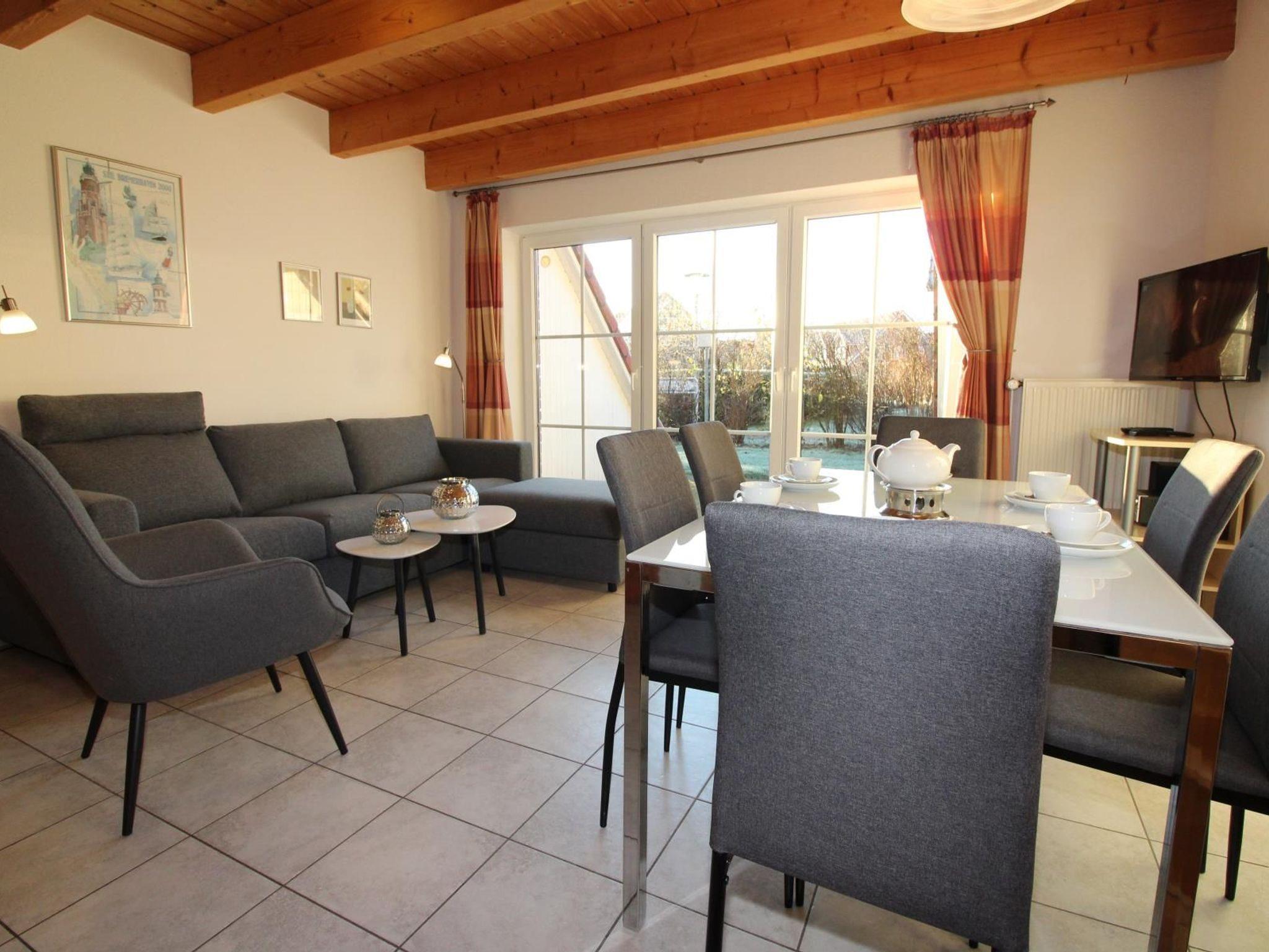 Das gemütliche Wohnzimmer ist mit ausziehbarem Esstisch für bis zu 8 Personen, 3-sitziger Couch, Kabel-TV, Videorecorder, DVD-Player und Stereoanlage mit CD-Player ausgestattet.