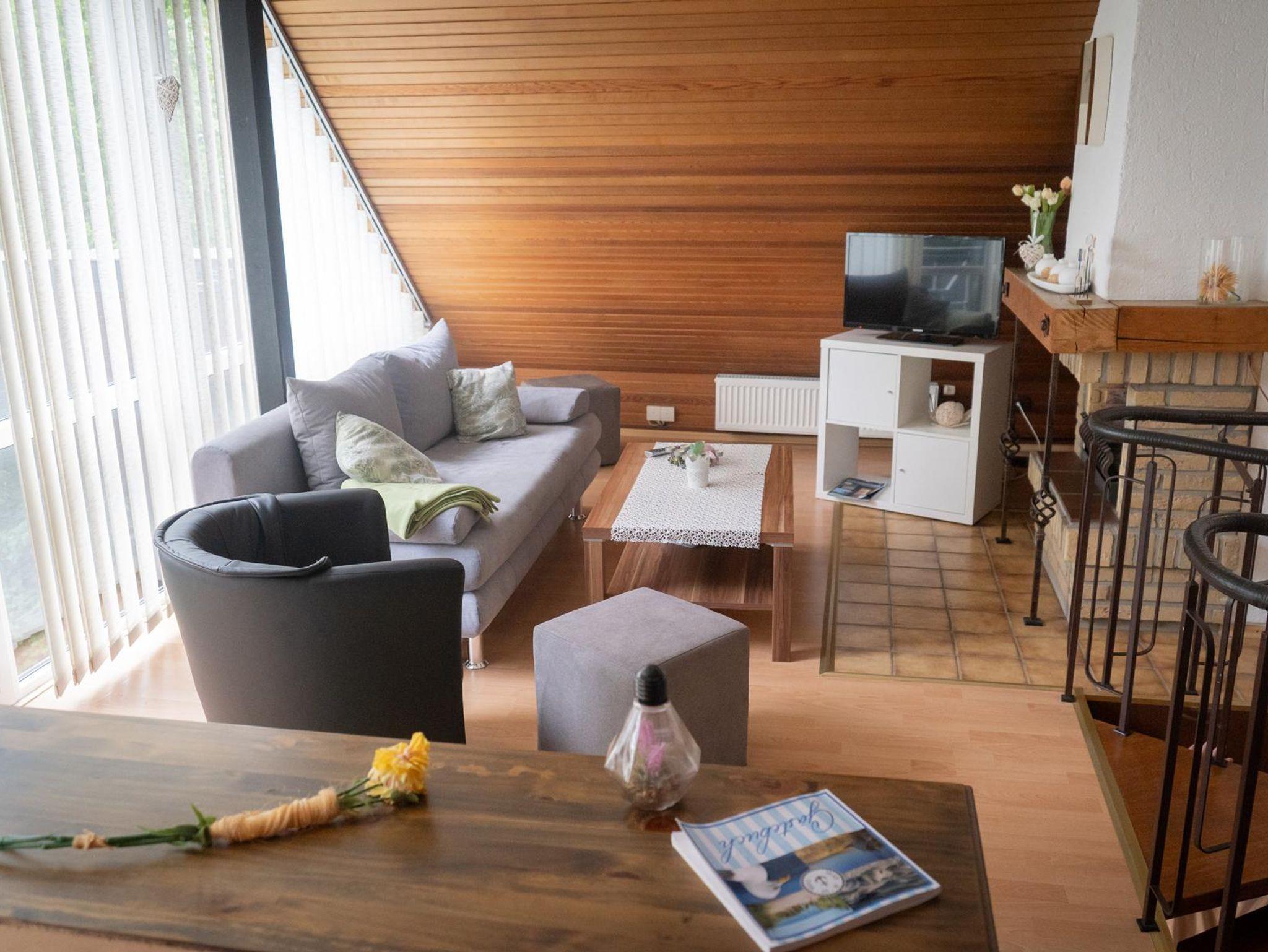 Die Ferienwohung Süd W3 hat im Erdgeschoss ein Schlafzimmer mit Doppelbett und zwei separaten Couchbetten, eine Küche (Mikrowelle, 4-Plattenherd, Kaffeemaschine, Wasserkocher, Toaster) mit einer Essecke und ein Badezimmer mit Dusche /WC. Eine Wendeltreppe führt ins 1. Obergeschoss in ein Wohnzimmer mit Sitzecke (Radio, Sat-TV), Kamin und zwei zusammengestellten Couchbetten. Über eine Raumspartreppe erreichen Sie das Dachgeschoss mit einer Spielhöhle für Kinder (nicht für Kleinkinder geeignet).