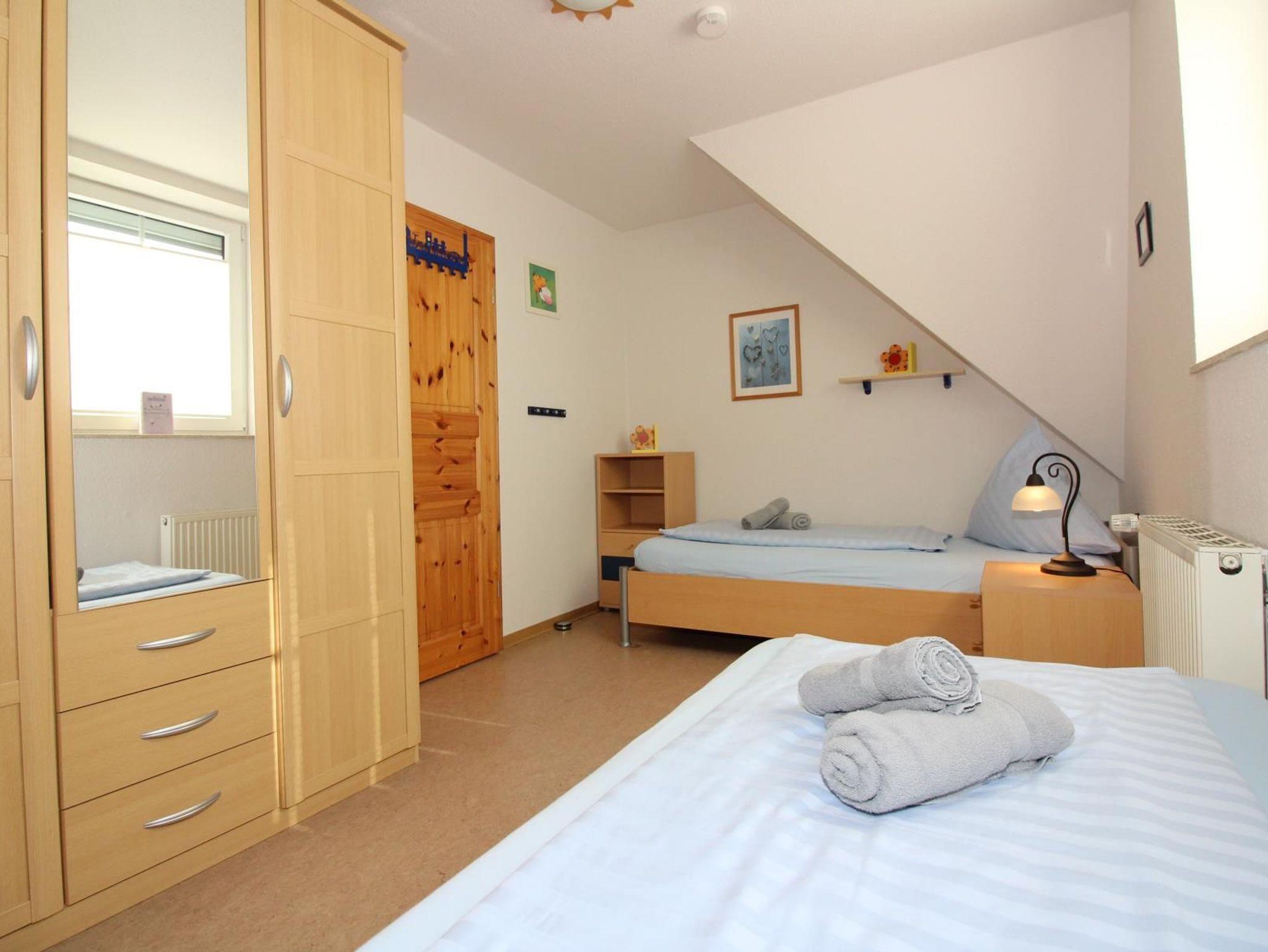 Im1. OG sind ein Schlafzimmer mit einem Doppelbett, ein Schlafzimmer mit zweiEinzelbetten und ein Badezimmer. Wenn Sie dort der Treppe weiter nach oben folgen, finden Sie einen ausgebauten Spitzboden mit zwei Futonbetten (Schlafmöglichkeit für bis zu 4 Personen). Der Spitzboden eignet sich super alszusätzlicher Wohnbereich. Wenn Sie aus dem Dachfenster schauen, können Sie sogar schon einen Blick auf die Nordsee werfen. Alle Schlafzimmer können komplett abgedunkelt werden.