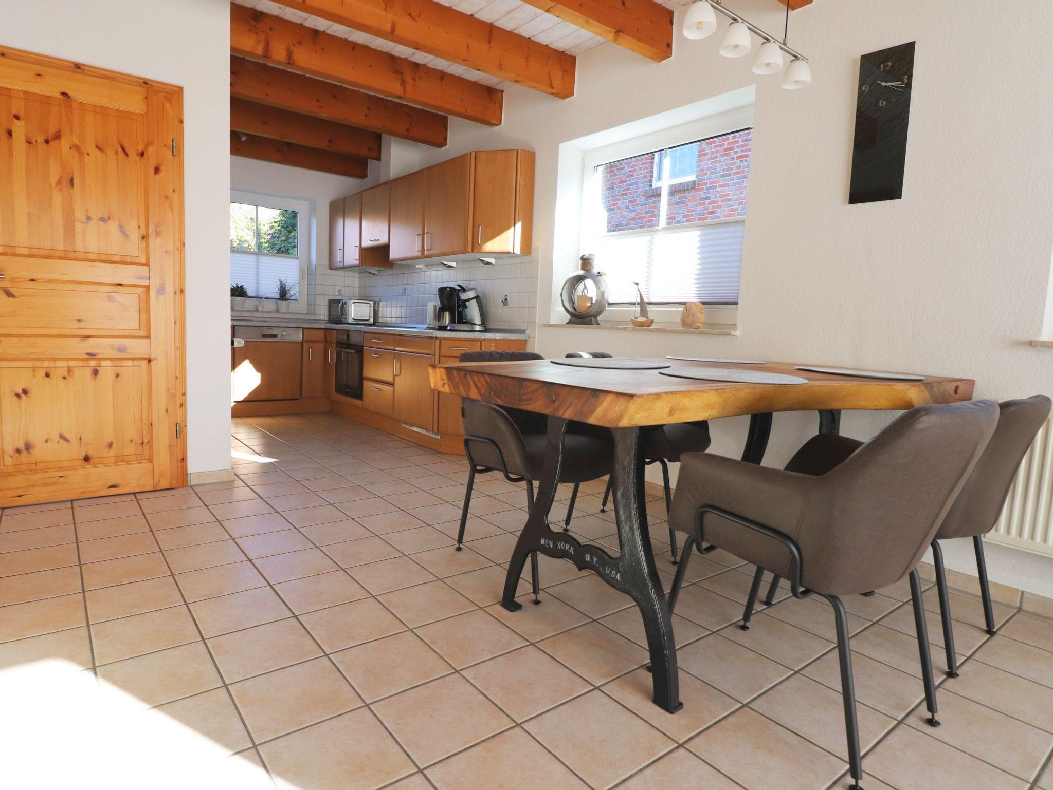 Im Erdgeschoss befindet sich der Eingangsbereich mit Garderobe, von dem aus Sie in den Wohnbereich oder in das Obergeschoss gelangen. Im offenen Wohnbereich finden Sie die voll ausgestattete Küche, ein Gäste-WC sowie den mit Massivholzmöbeln und 70 4K Smart-TV + Blu-Ray-Player ausgestatteten Wohn/Essbereich. Der große Esstisch aus einer dicken Baumscheibe lädt ebenso zum gemütlichen Beisammensein ein wie die Eckcouch (mit Schlaffunktion). Die Terrassentür ist mit einer Insektenschutztür versehen.
