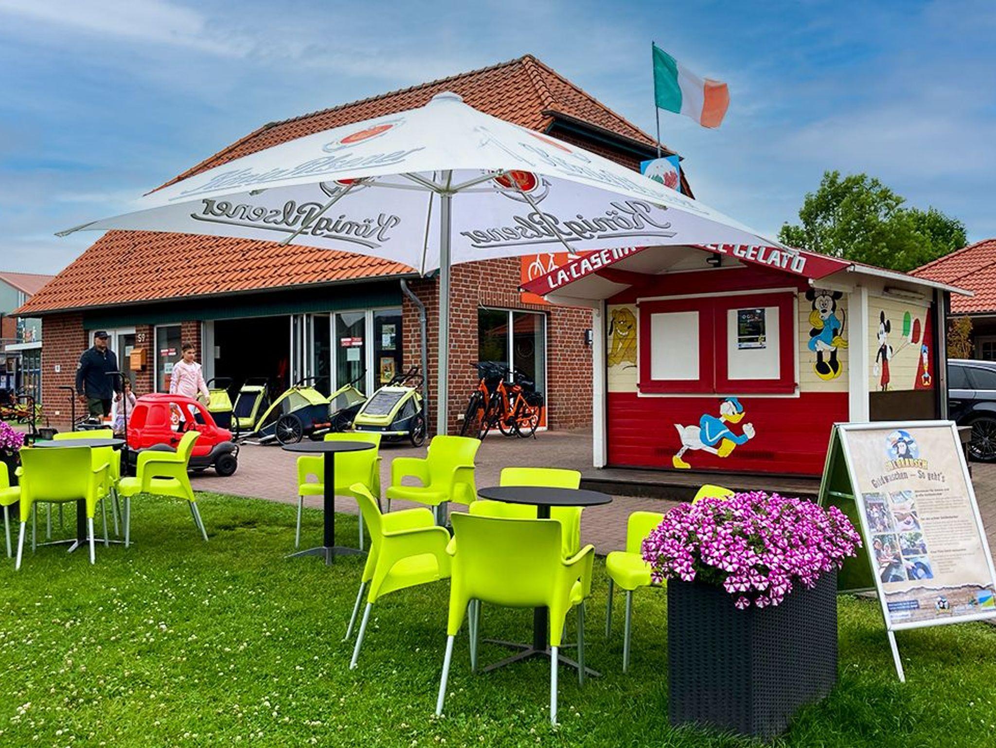 Die angrenzenden, charmanten und reetgedeckten Ladenzeilen mit Gastronomie, Bäckerei, Imbiss-, Souvenir-, Beauty- und Wellnessangeboten ergänzen das perfekte Urlaubsgefühl.