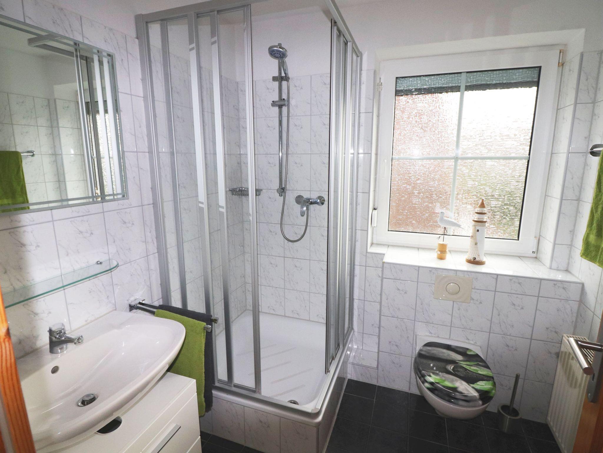 Im Obergeschoss kommen Sie vom Flur - mit kleinem Bücherregal und großem Spiegel - in die beiden Schlafzimmer oder das Duschbad. Das Doppelbett-Schlafzimmer bietet einen geräumigen Kleiderschrank mit Tresor. An beiden Seiten des Doppelbettes befinden sich jeweils Ablagemöglichkeiten, eine Steckdose, sowie separat schaltbare Leuchten. Schlafzimmer 2 hält zwei Einzelbetten, einen Wäscheschrank sowie einen 42 Flachbildfernseher bereit. Auf den Ablagemöglichkeiten an den Betten befinden sich Nachttischlampen mit integrierter USB-Ladefunktion für mobile Endgeräte sowie eine Steckdose. Zusätzlich finden Sie hier noch einen Musikspieler, der Radio/CD/MP3/MC und USB abspielen kann, außerdem Gesellschaftsspiele und Bücher. Zwischen den Schlafräumen liegt das Tageslicht-Duschbad. Die Schlafzimmer sind mit Insektenschutzgittern und Rollläden ausgestattet.