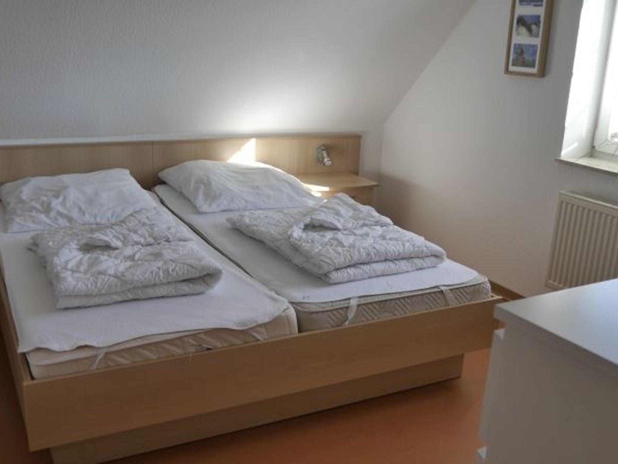 Im Obergeschoß befinden sich zwei Schlafzimmer (ein Doppelbett und zwei Betten hintereinander) und das hell geflieste Duschbad mit Tageslicht. Der Boden ist mit angenehmen, umweltfreundlichen Linoleum ausgelegt.