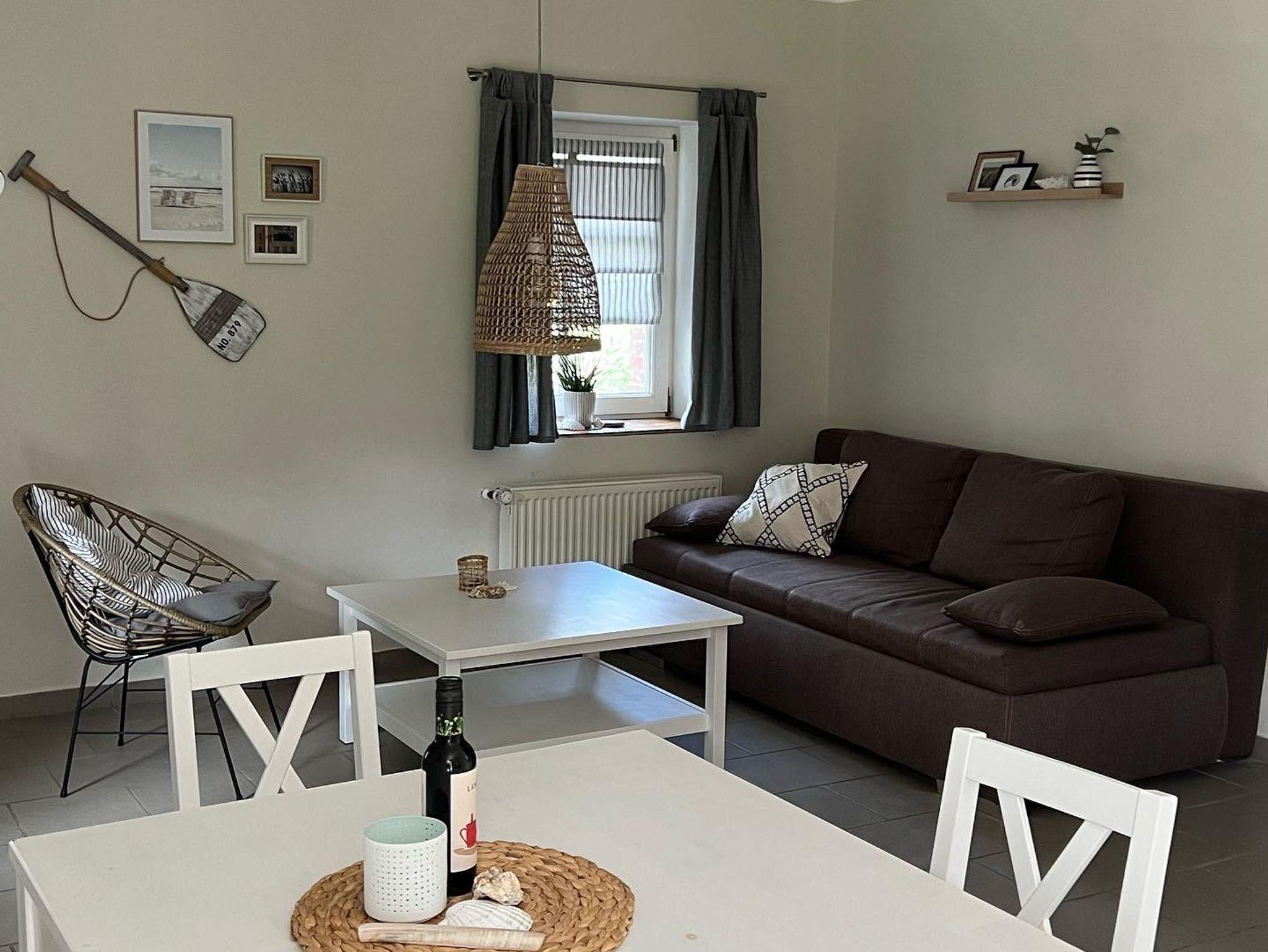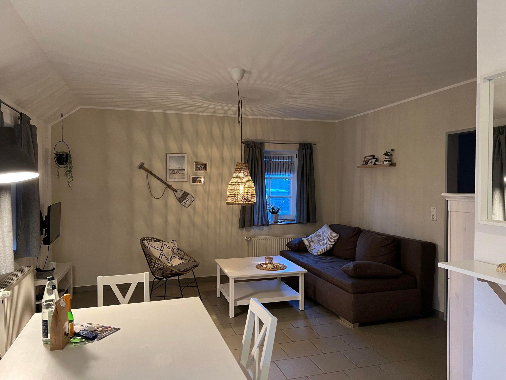 Es gibt ein Schlafzimmer mit Doppelbett und ein Wohn-/Esszimmer mit offener Küche (2-Plattenherd, Kühlschrank, Spülmaschine, Mikrowelle mit Heißluftfunktion) und ein Duschbad.