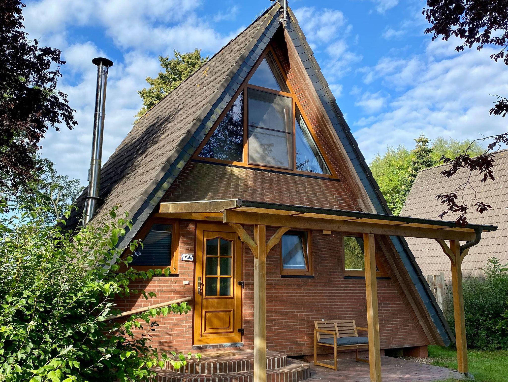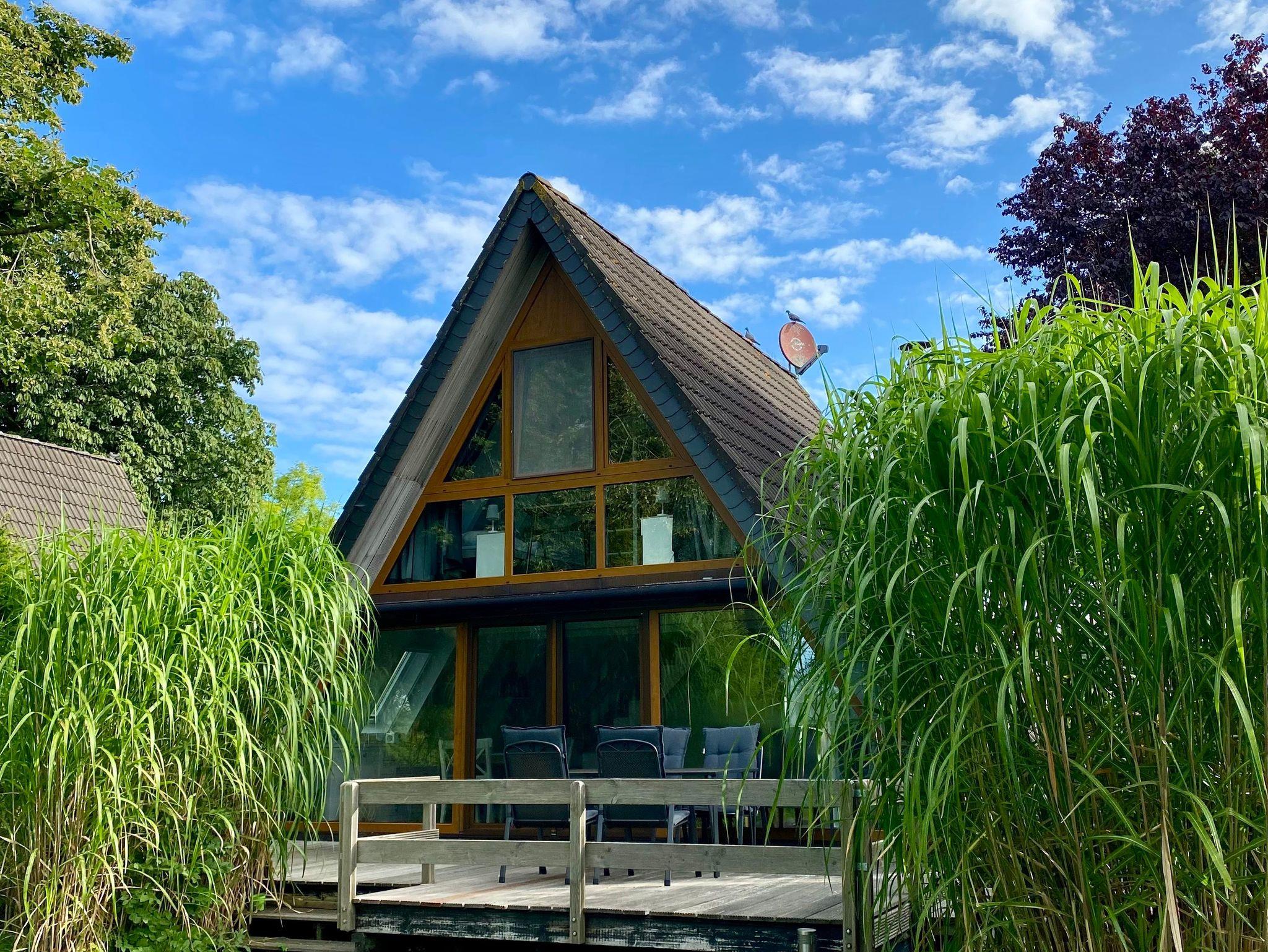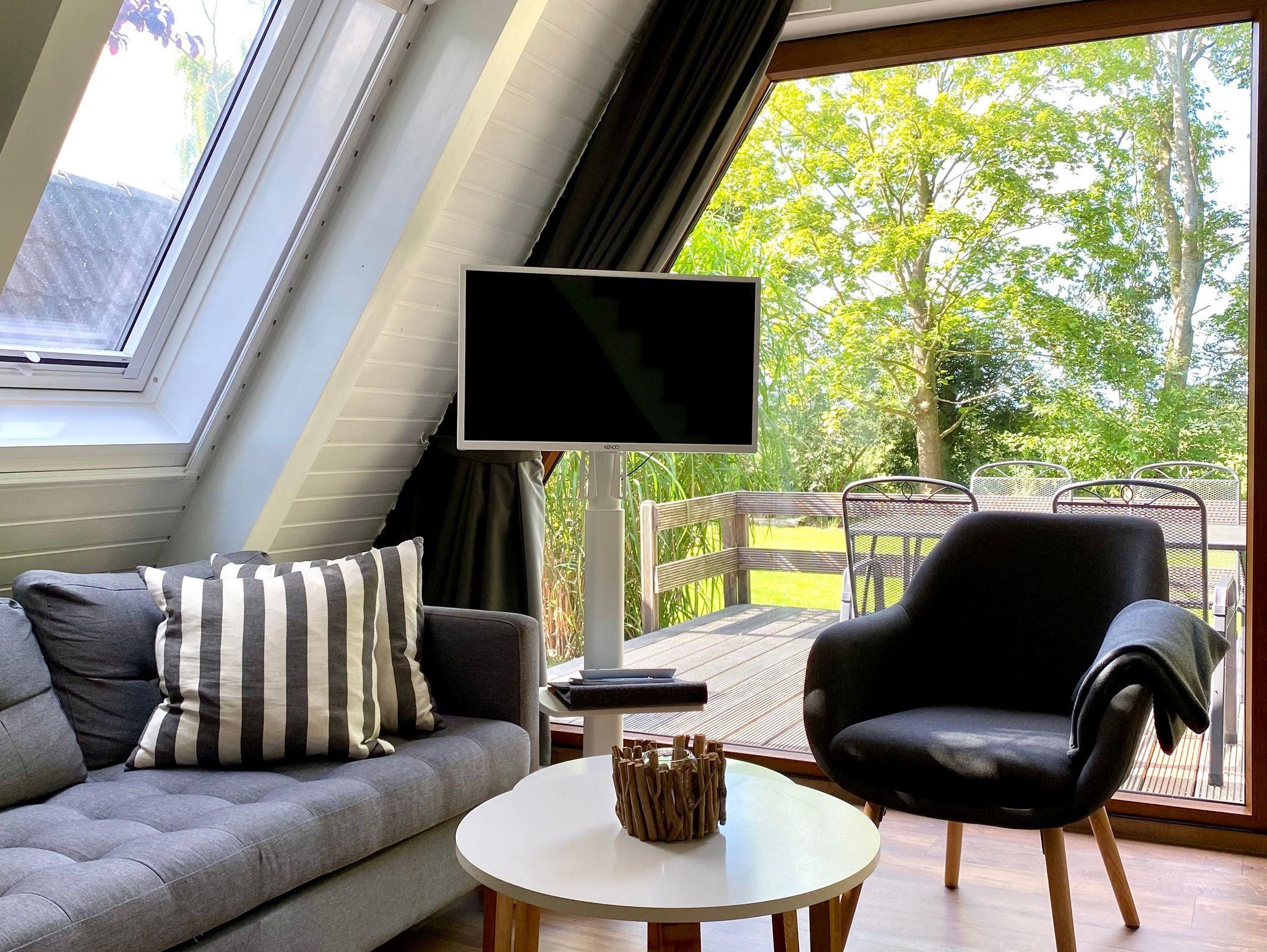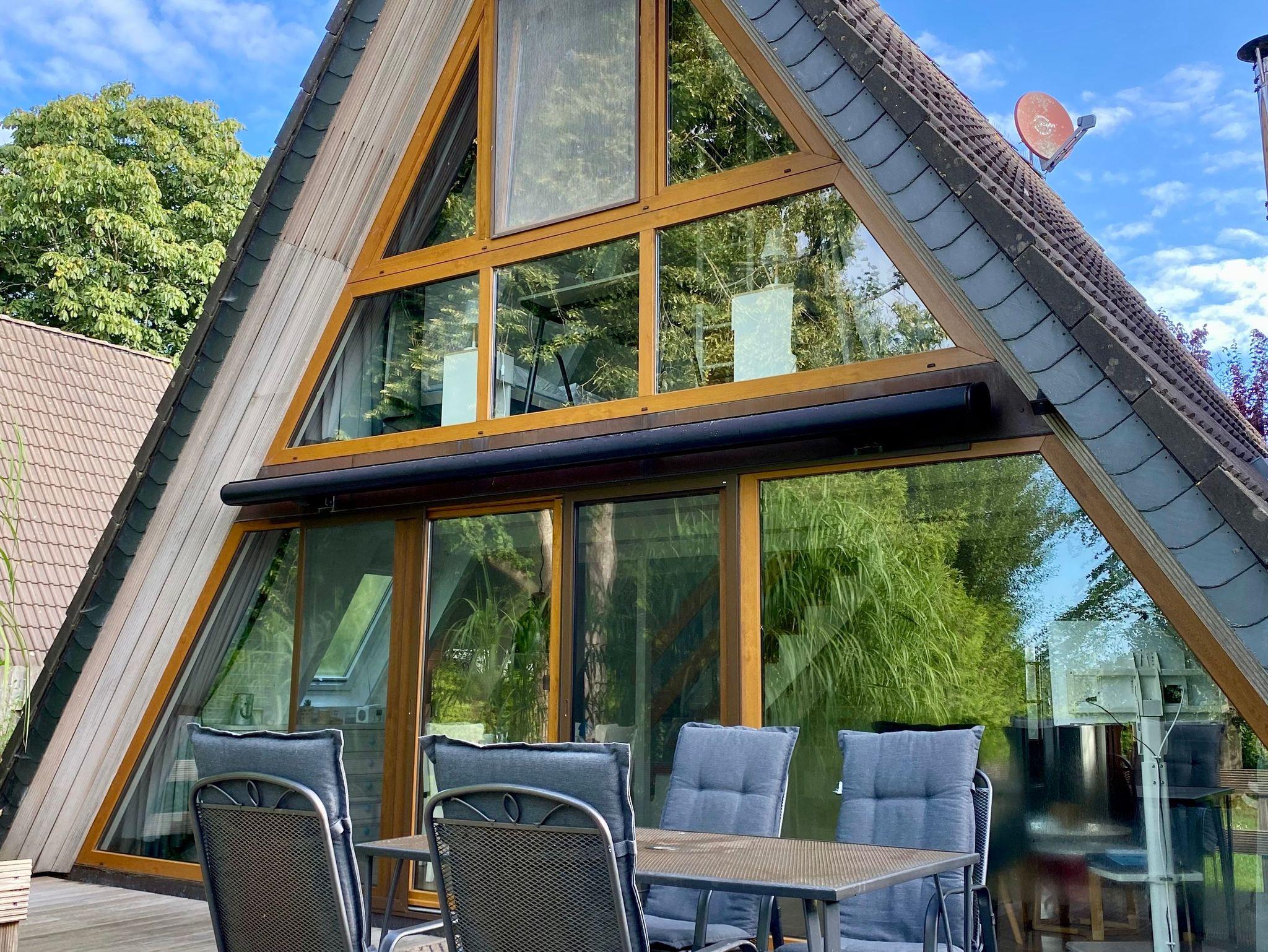 Das Nurdachhaus verfügt über eine große Terrasse mit einer Markise und Terrassenmöbeln,