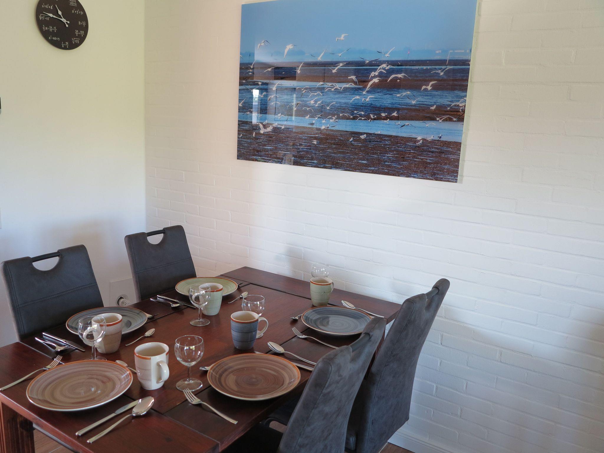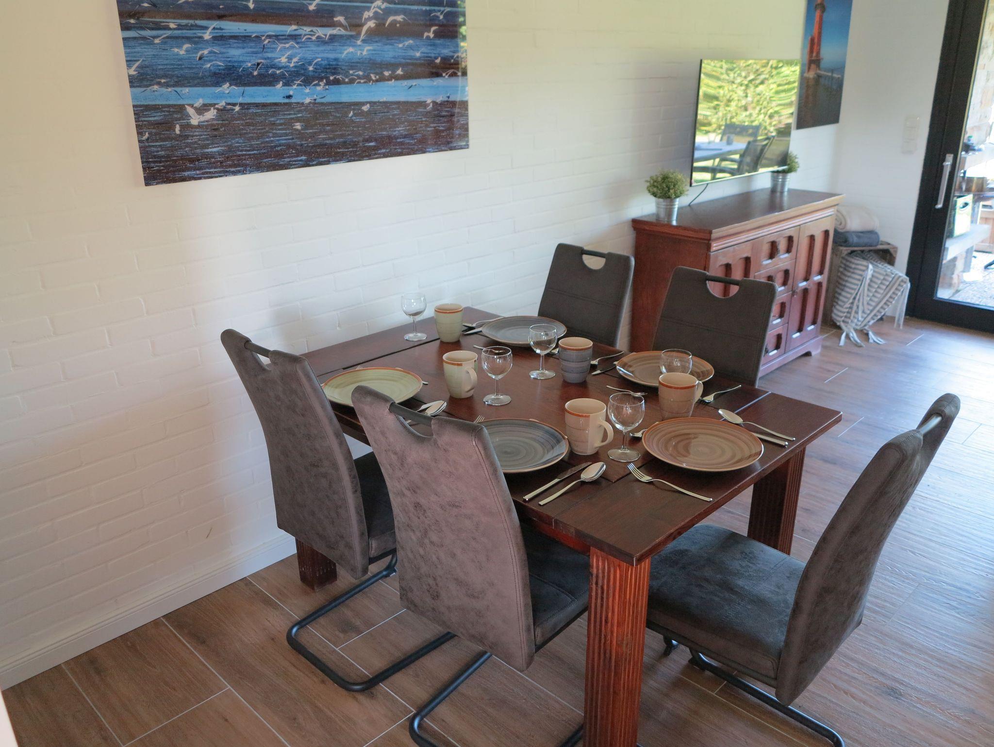 Der traumhafte Bungalow Nordseeferienhaus Emma Tossens am Friesenstrand im Nordseebad Tossens bietet mit ca. 72 m² Wohnfläche eine Wohlfühlathmosphäre, in der Platz für bis zu 6 Personen vorhanden ist. Unmittelbar vor dem Deich gelegen, erwartet Sie ein 200 qm² großer Garten mit ausreichend Platz zum Spielen, Grillen und Entspannen. In der sehr gut ausgestatteten Küche finden Sie einen Geschirrspüler, Backofen mit Ceranfeld und eine Mikrowelle vor. Zusätzlich gibt es einen großen Flachbildfernseher mit Netflix im Wohnbereich, Internet mit W-Lan, eine Waschmaschine, ein großes Sofa, sowie ein Stellplatz direkt am komplett eingezäunten Haus. Eine Fußbodenheizung erwärmt das gesamte, mit schönen Holzfliesen durchgefließte Haus. Zum Garten hin gelegen ist eine ca. 20 qm² große Terrasse vom Wohnzimmer aus begehbar. Dort stehen neben Sitz- und Liegemöbeln auch ein Grill im windgeschützten Außenbereich. Außerdem gibt es eine große, ausfahrbare Markise und einen Außenkamin. Das gesamte Ferienhaus ist neu und modern eingerichtet. Im Elternschlafzimmer finden unsere Gäste ein großes Doppelbett (1,80m x 2,00m) vor. Im zweiten Schlafzimmer stehen ein Etagen- sowie ein Einzelbett, welche auch für Erwachsene problemlos genutzt werden können.