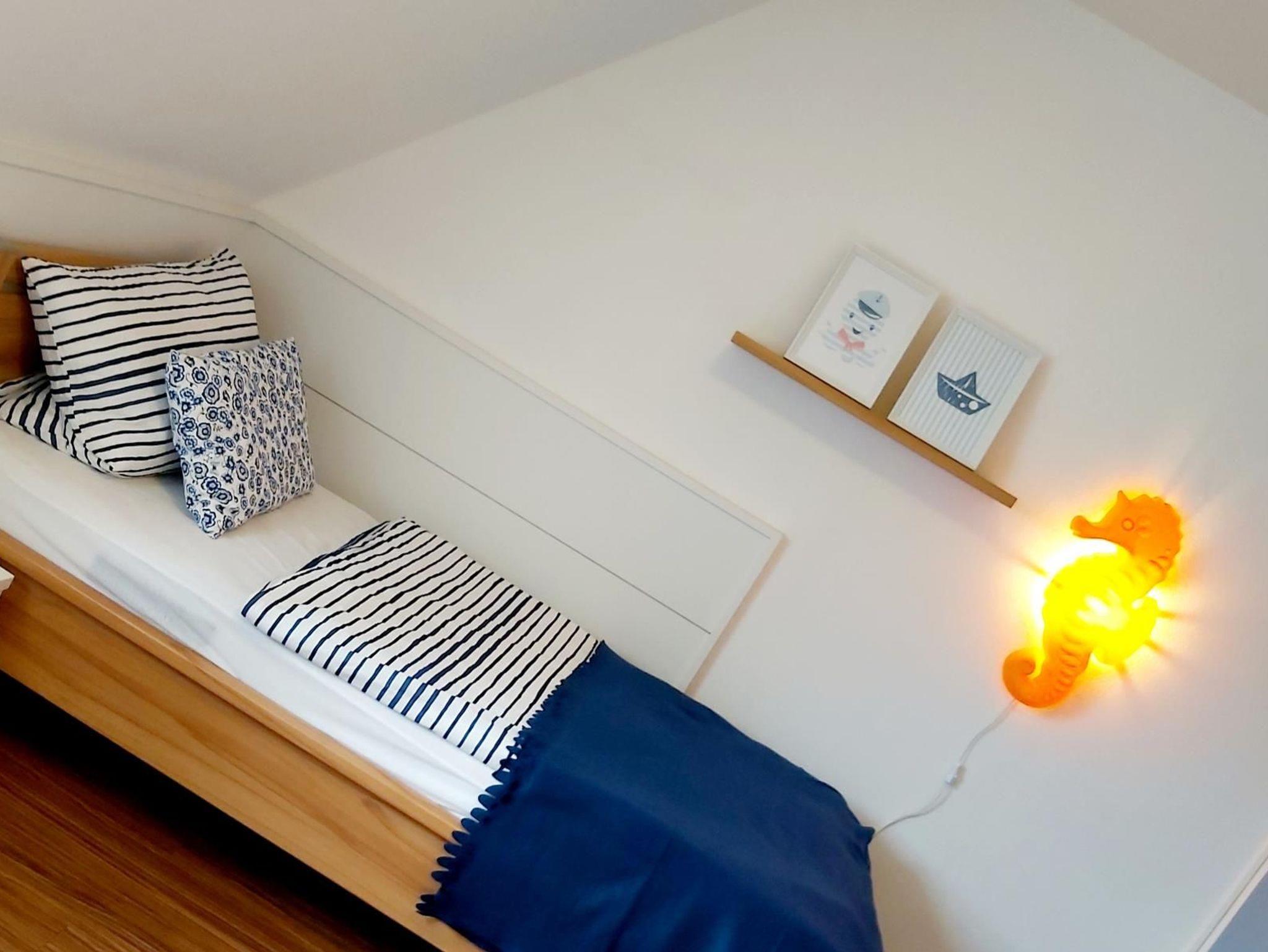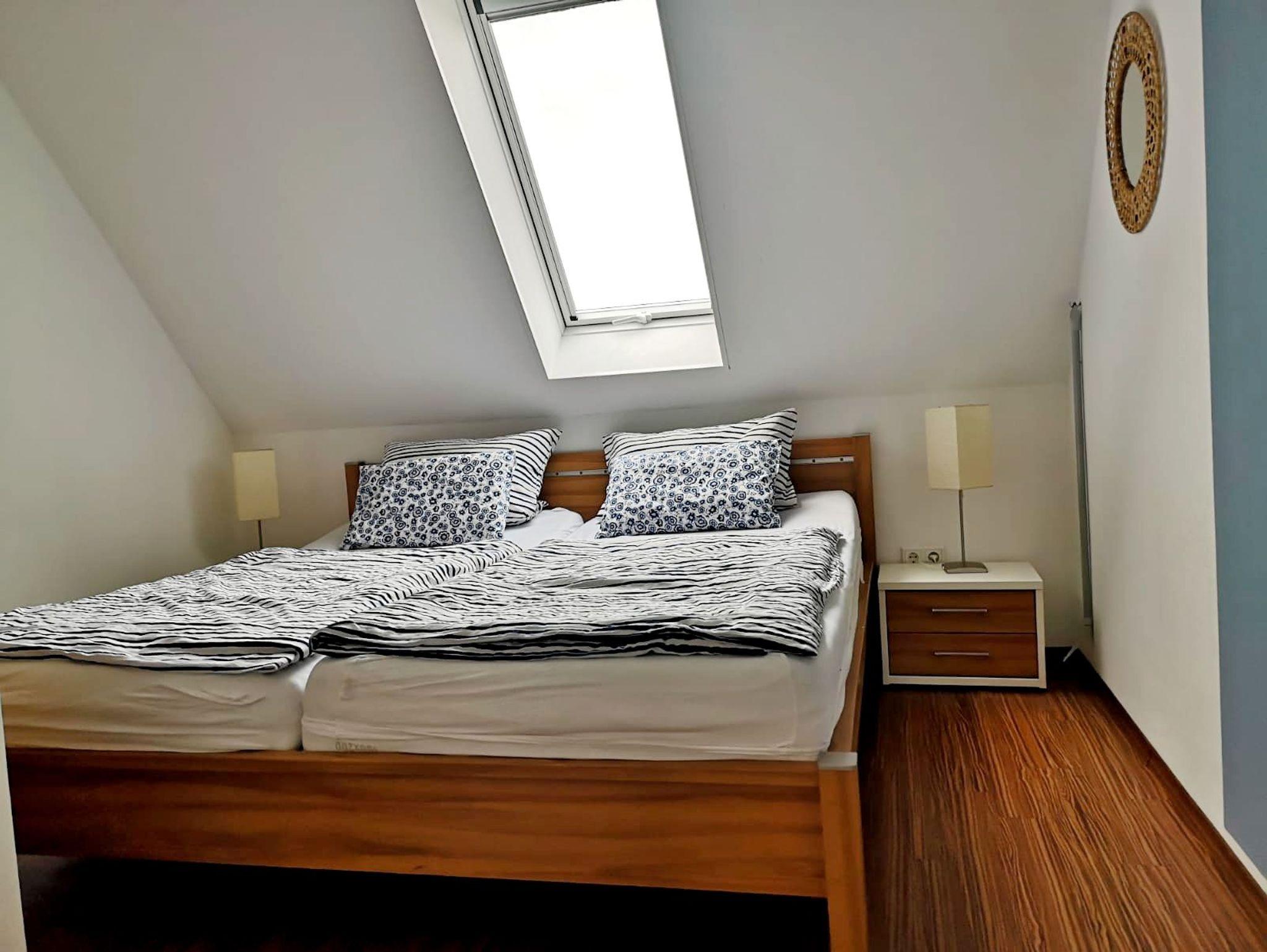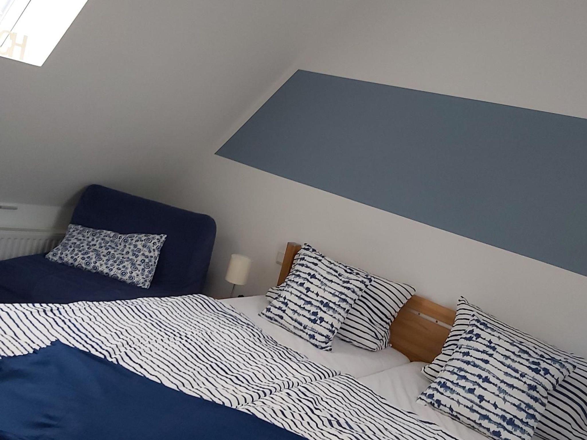 Bis zu 8 Personen finden in drei Schlafzimmern bequem Platz. Im Obergeschoss befinden sich ein Schlafzimmer mit großem Doppelbett (200 cm x 200 cm) sowie ein weiteres Schlafzimmer mit zwei Einzelbetten und im ausgebauten Dachgeschoss ein Doppelbett sowie ein Schlafsessel. Als Ausweichmöglichkeit ist auch noch eine sehr bequeme Schlafcouch (Bettzeug ist dafür vorgesehen) im Wohnzimmer vorhanden.