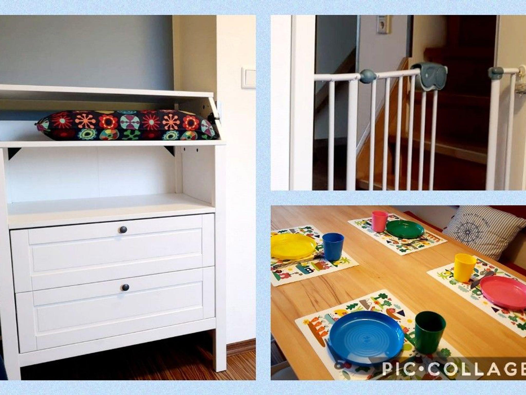 So finden Sie z.B. eine Wickelkommode, eine Babybadewanne und auch ein zweites Treppen-/Türschutzgitter. Ein Kinderreisebett, Rausfallschutz für Betten und Hochstuhl sind selbstverständlich auch vorhanden.