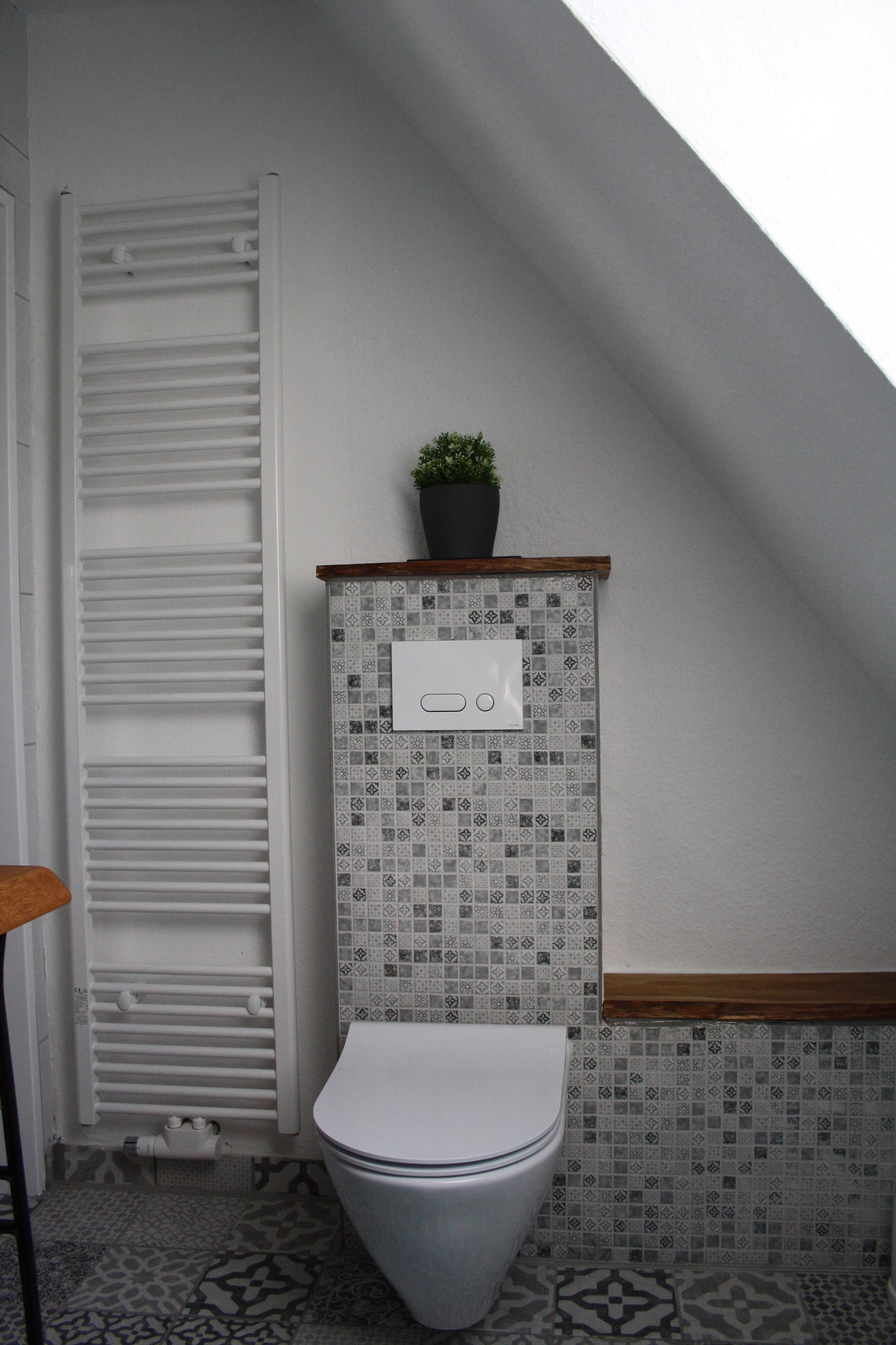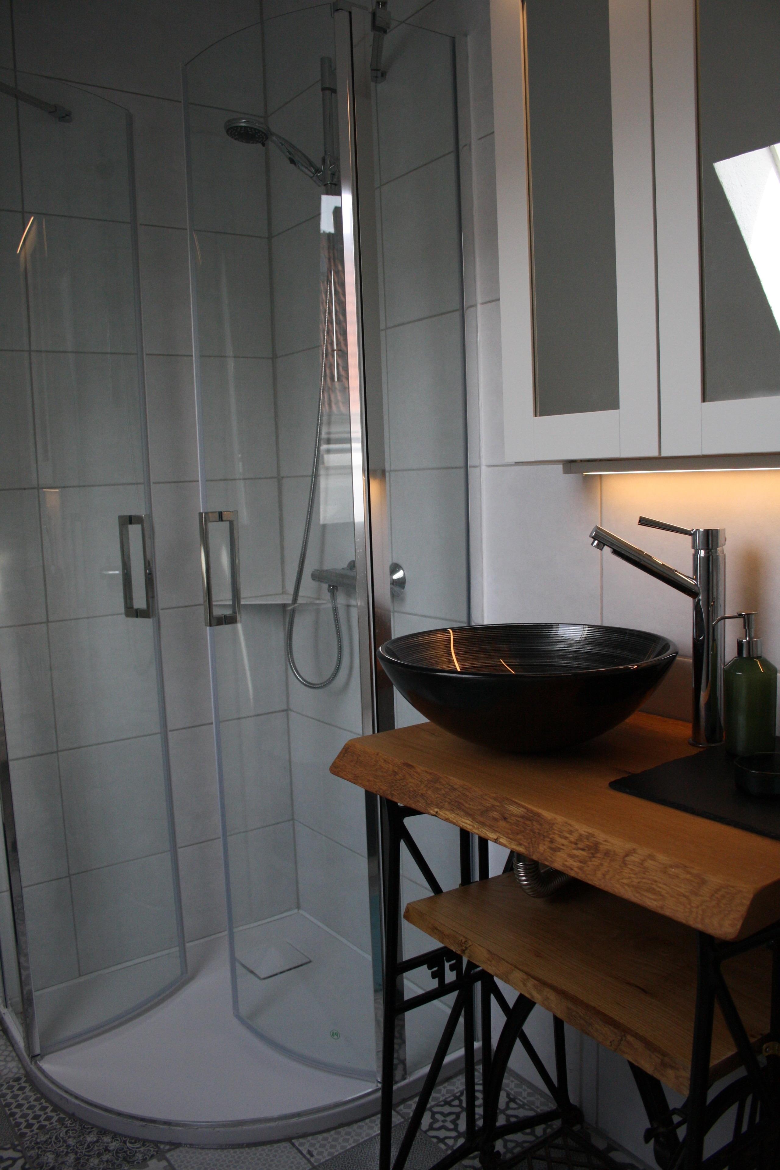 Die ganze Wohnung wurde 2021 kernsaniert, dazu gehört das kleine im Vintage Style eingerichtete Dusch/ Bad.