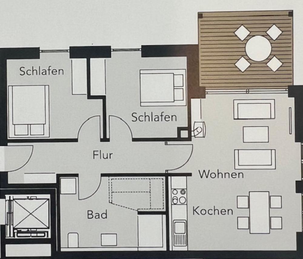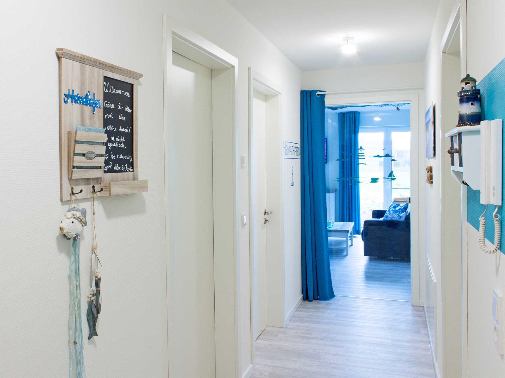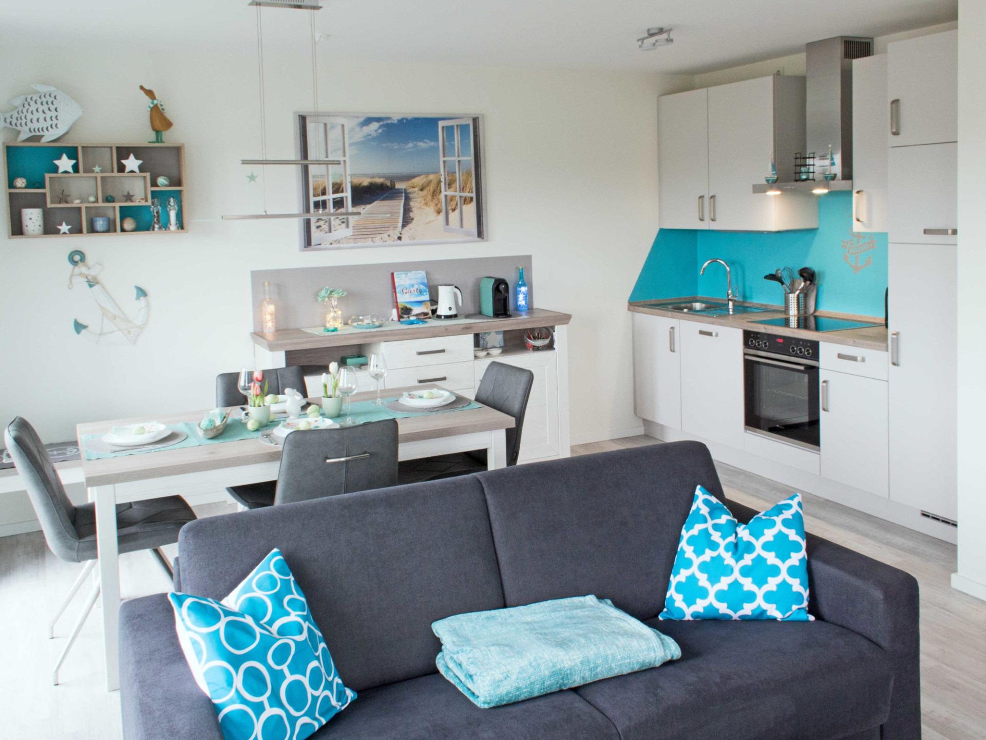 Das Zentrum Ihrer Auszeit bildet ein heller, maritimer Wohnraum, in dem Sie die Möglichkeit haben, gemütliche Abende vor dem Kamin zu genießen, Bücher zu lesen, PlayStation zu spielen oder die umfangreiche Sammlung an CDs und DVDs zu nutzen. Das Sofa lässt sich zu einer komfortablen Schlafgelegenheit (160 x 200 mit Lattenrost) umwandeln. Die Wohnung ist für sechs Personen voll ausgestattet. Um gestärkt den neuen Urlaubstag zu beginnen, finden Sie im angrenzenden Essbereich eine Küchenzeile mit hochwertigen Küchengeräten sowie einen Esstisch für sechs Personen. Die Wohnung verfügt über kostenfreies WLAN.