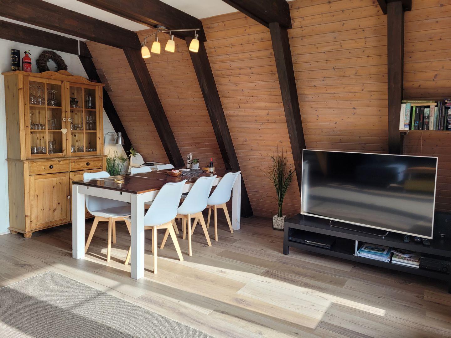 Das lichtdurchflutete Wohnzimmer lädt zum Verweilen ein und bietet einen komfortablen Bereich mit einem Sofa und einem Esstisch für gesellige Abende.